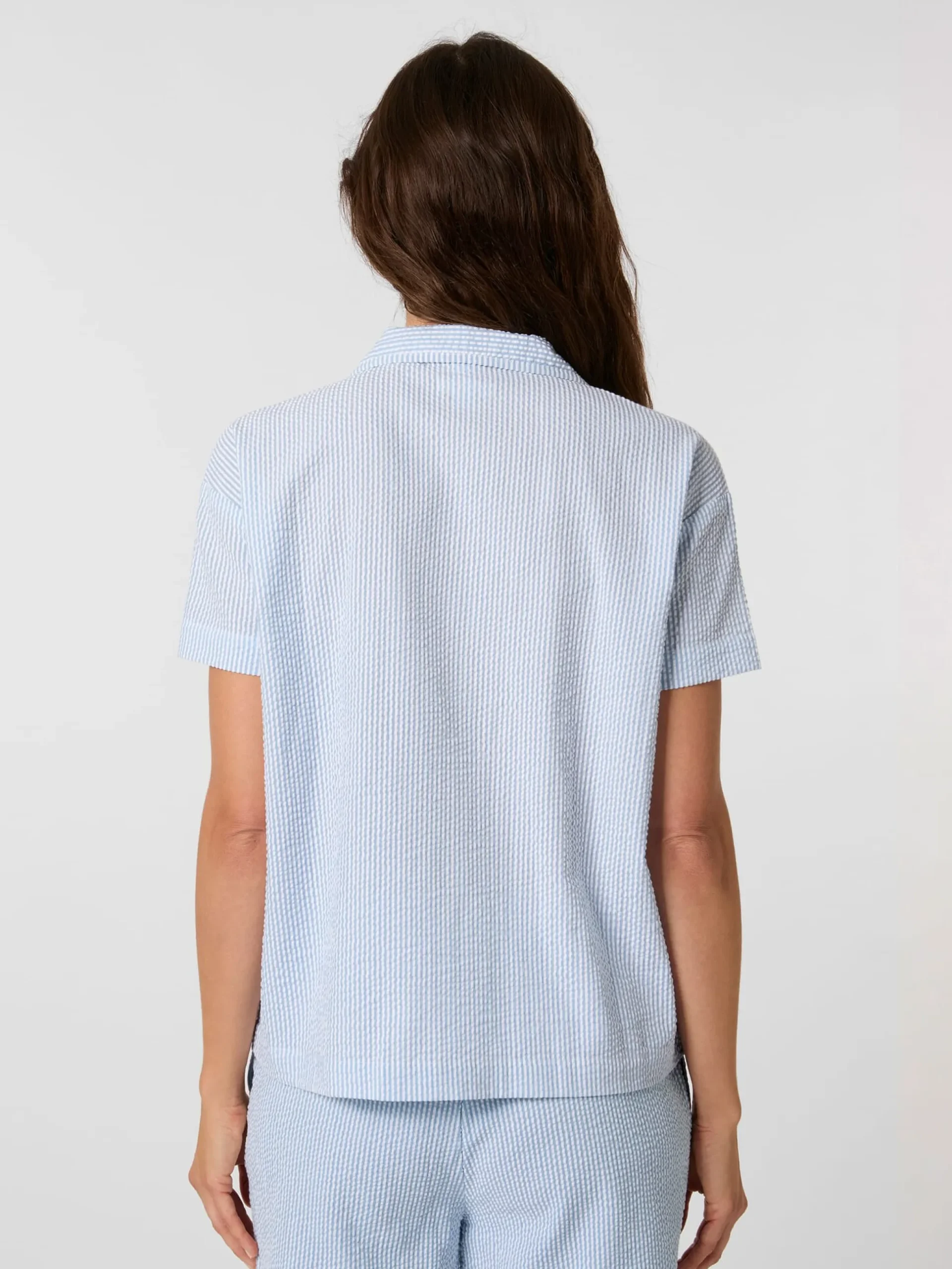 Luftig-leicht ist dieses gestreifte Pyjamashirt, das Knowledge Cotton Apparel aus hautsympathischer, kontrolliert biologisch angebauter Baumwolle fertigt. Das Seersucker-Gewebe ist nicht nur pflegeleicht und strapazierbar, dank seiner gekreppten Oberfläche liegt es nicht vollflächig auf der Haut, wodurch die Luft gut zirkulieren kann. Die lockere Passform erhöht den Tragekomfort noch und sorgt für viel Bewegungsfreiheit. So ist das Shirt ein komfortabler Begleiter für die warme Jahreszeit, ob Sie es nun nachts oder tagsüber tragen, zum Beispiel zu Jeans, Sommerrock oder Shorts.