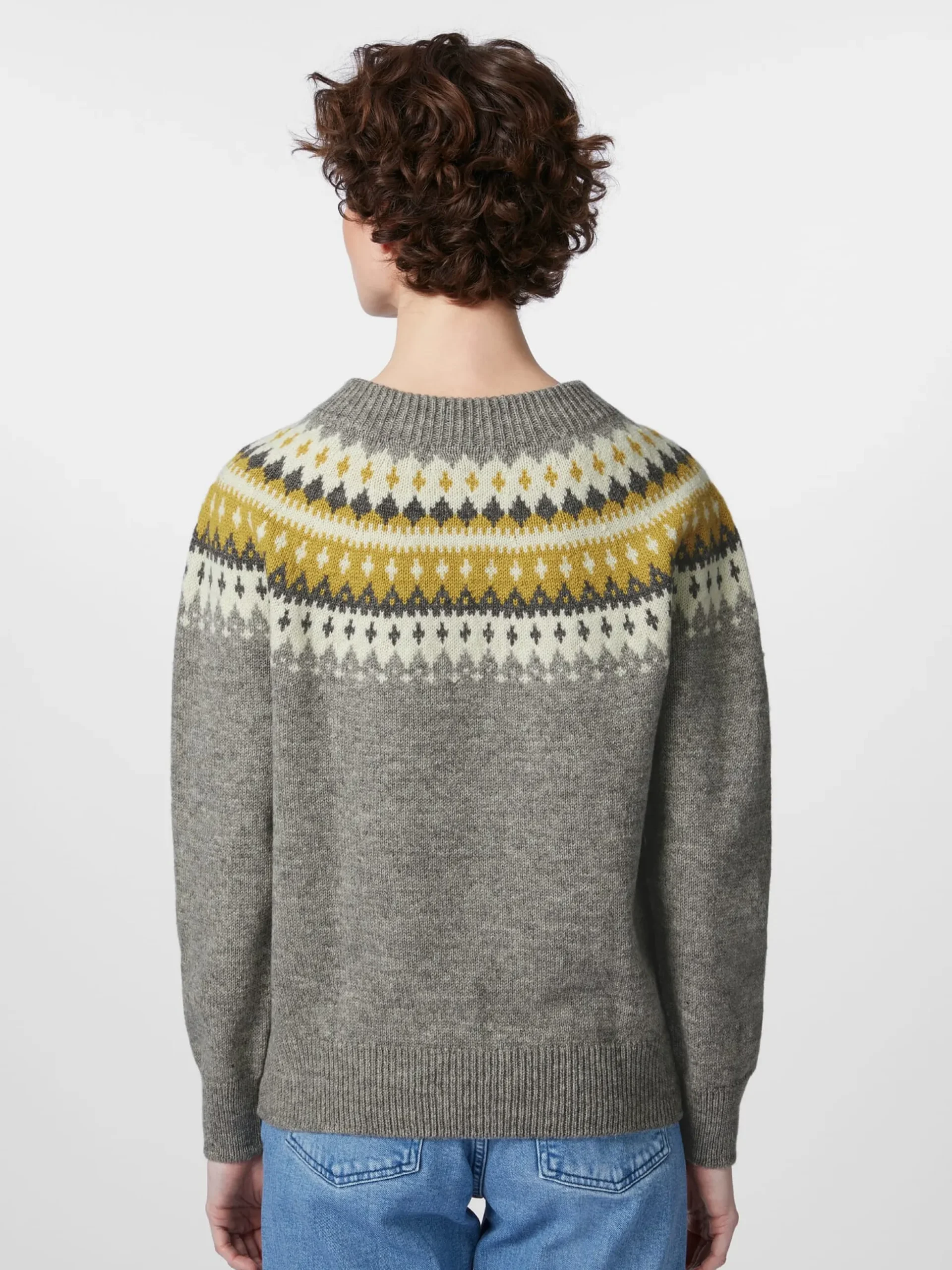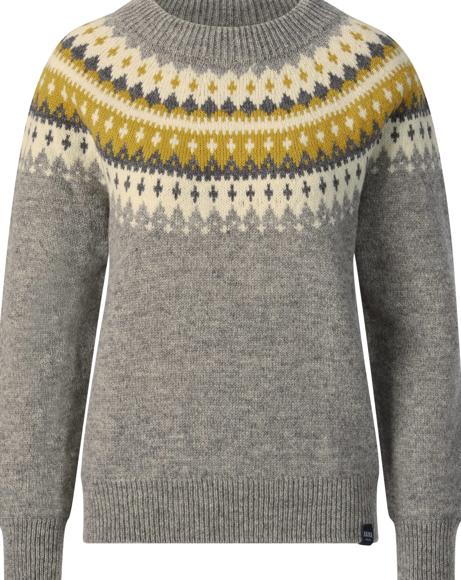 Nicht allein das klassische norwegische Varde-Muster, das über die rundgestrickte Schulterpasse läuft, macht die Besonderheit dieses Pullovers aus, sondern auch das Material. Rauma strickt ihn aus reiner norwegischer Wolle, die dank ihrer Strapazierbarkeit, Unempfindlichkeit und Elastizität eine gute Balance zwischen Funktionalität und Komfort bietet. Zugleich verleiht ihm die Norwegerwolle wunderbar wärmende und temperaturregulierende Eigenschaften, denn die Wollfasern sind stark gekräuselt und können so viel Luft einschließen, was eine effektive Isolierung bewirkt. Rippenstrickbündchen bilden den Abschluss an Hals, Ärmeln und Rumpf.