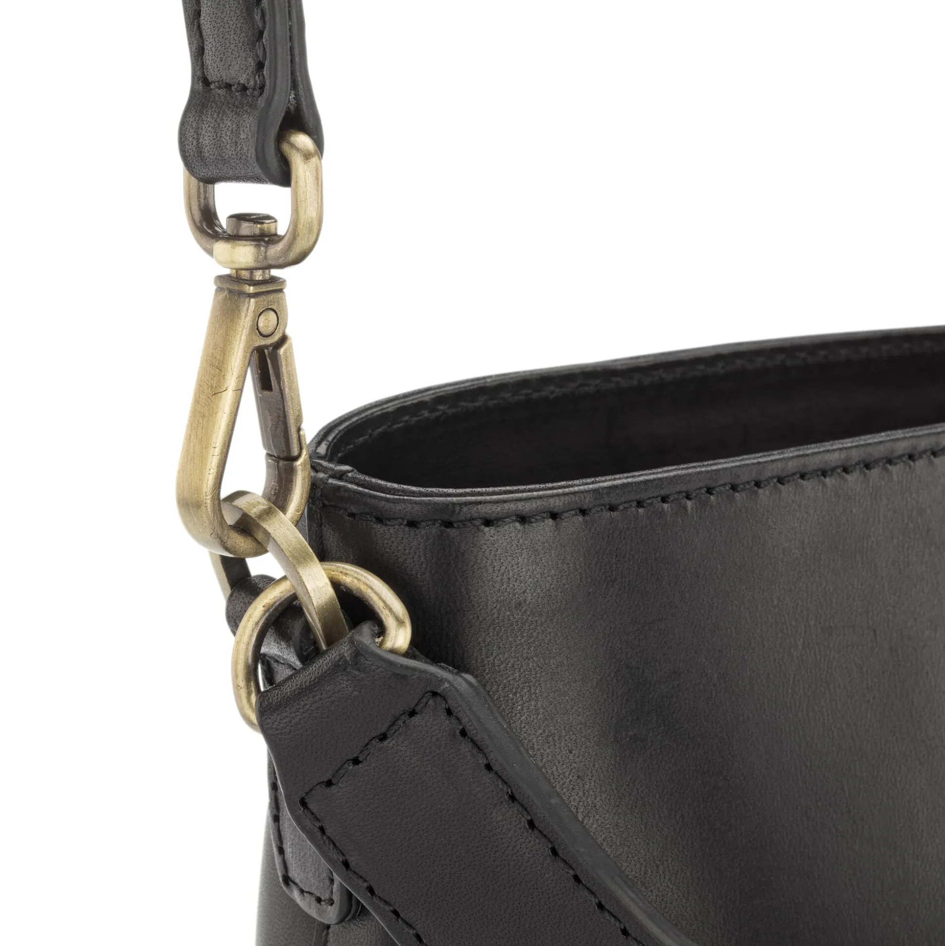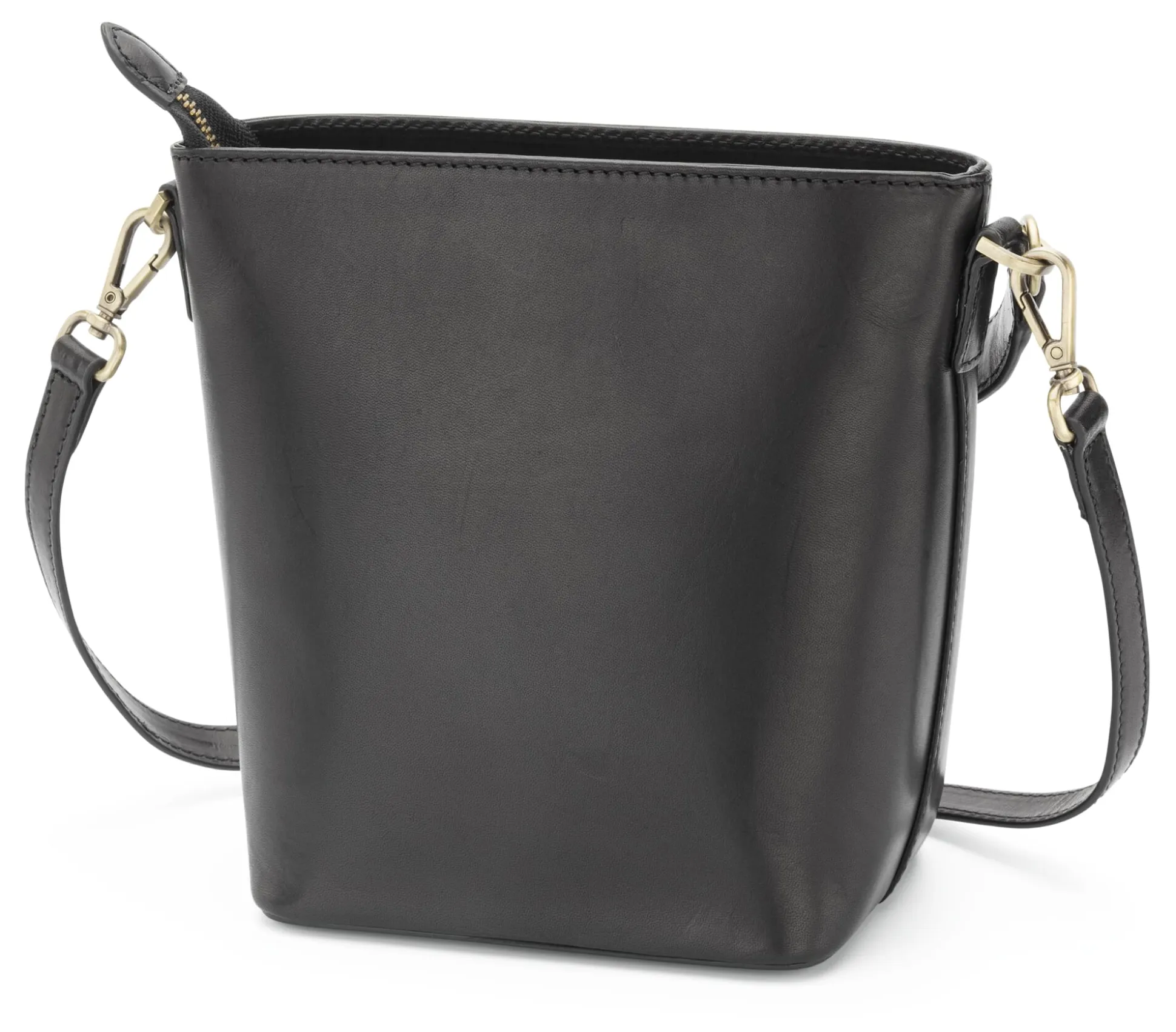 Rindleder (Stärke 1,8 mm), vegetabil gegerbt, Herkunft Italien. Futter 100% Baumwolle. Beschläge und Reißverschluss aus Metall. Trageriemen Breite 2,5 cm, Länge 30 cm. Verstellbarer Schulterriemen, Breite 1,5 cm, Länge max. 1 m. Eine Innentasche mit Reißverschluss, ein Steckfach. Hergestellt in Indien.