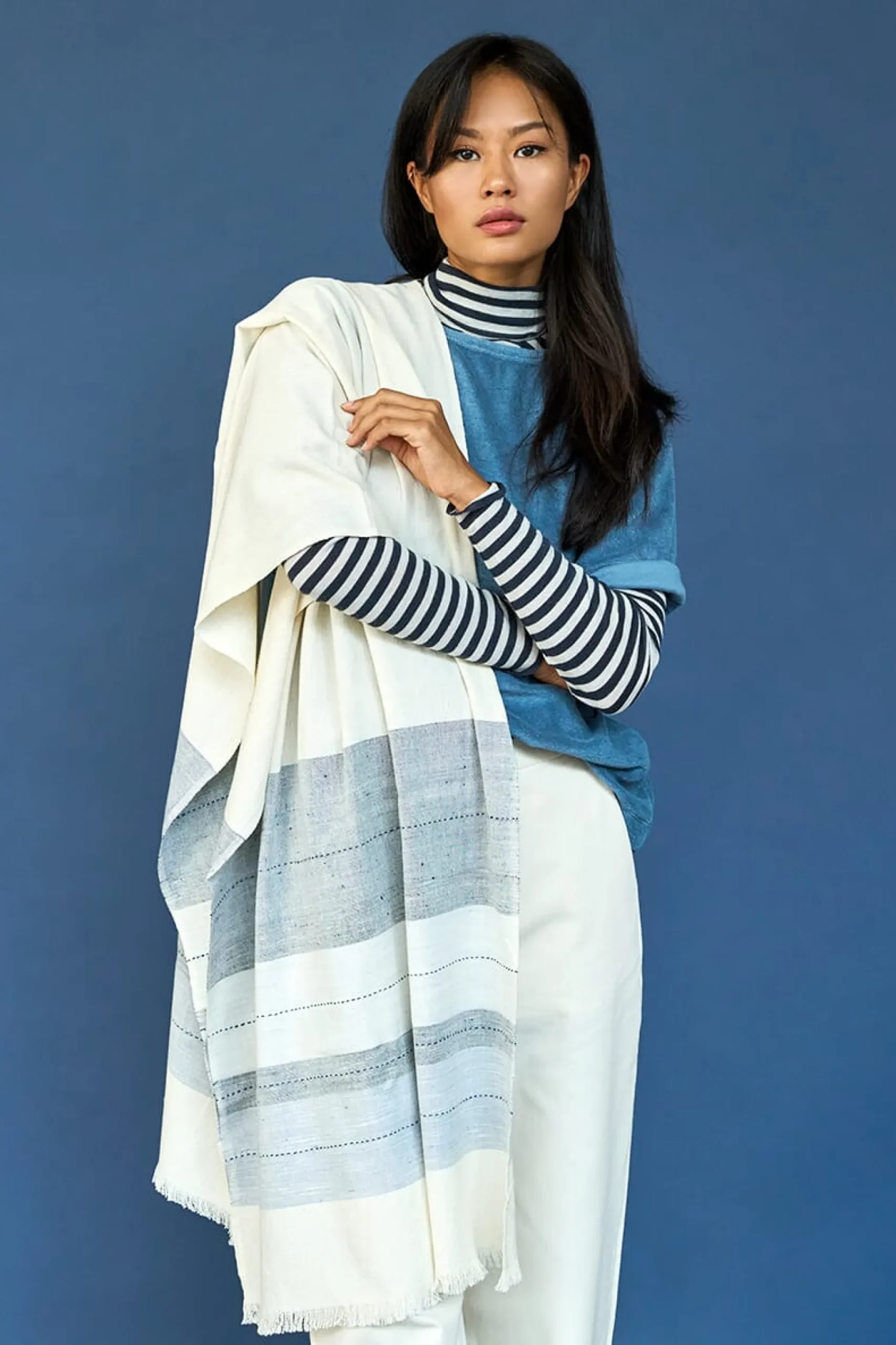 Gut für die Übergangszeit: handgewebtes, breites Schultertuch aus hautsympathischer Baumwolle und feiner Seide mit markanten zweifarbigen Blockstreifen und schmalen Fransenkanten an den Enden. Dank der Länge von nahezu zwei Metern kann das Tuch in den unterschiedlichsten Bindetechniken getragen werden und sorgt so für abwechslungsreiche Auftritte.