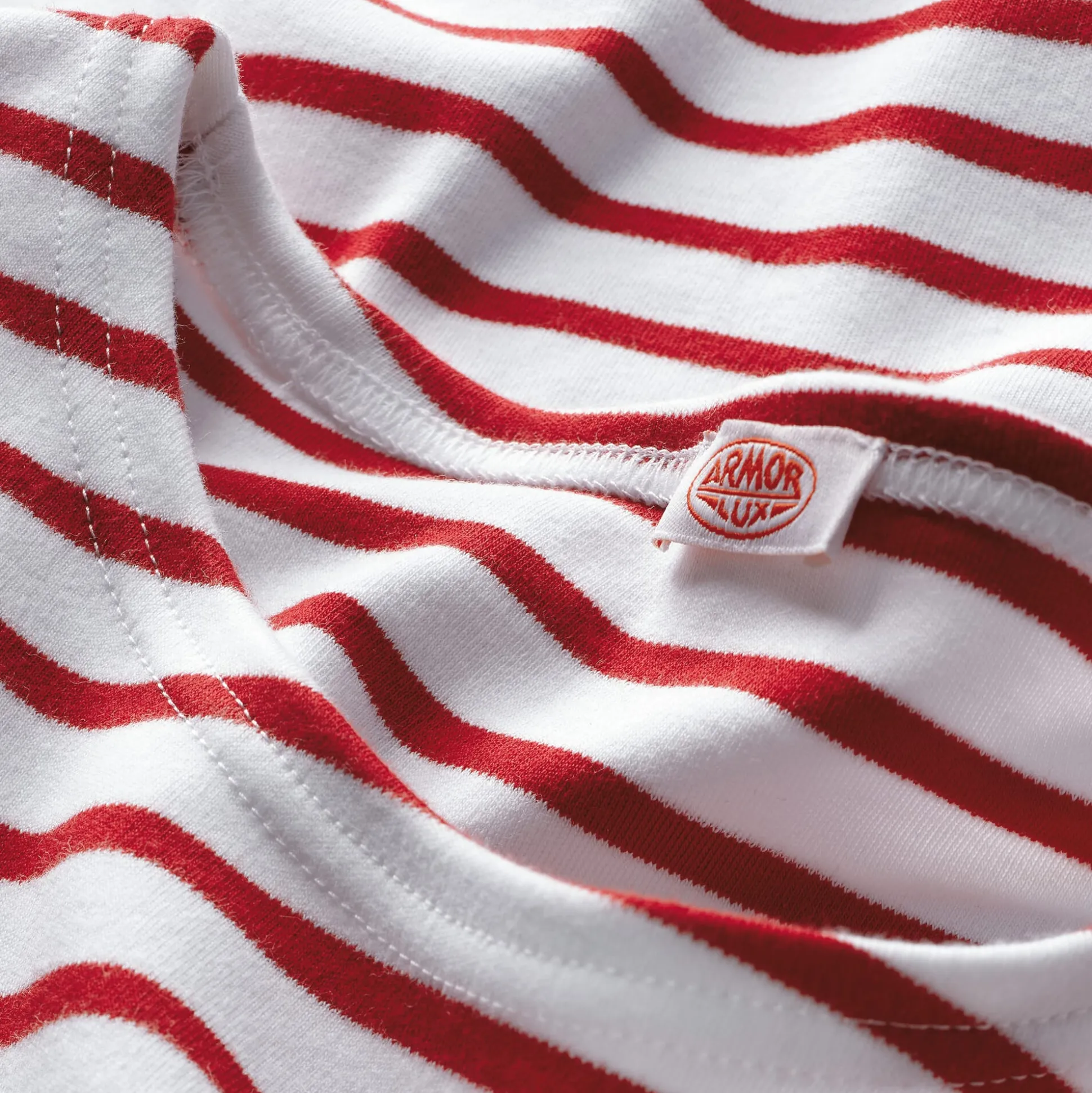 Dieses Shirt ist die leicht antaillierte Version des klassischen Matrosenshirts von Armor lux. Die Ärmel sind dreiviertellang, der Halsausschnitt ist ohne Bündchen gearbeitet. Konfektioniert wird es in Frankreich aus einem mittelgewichtigen Baumwoll-Interlock in kbA-Qualität.