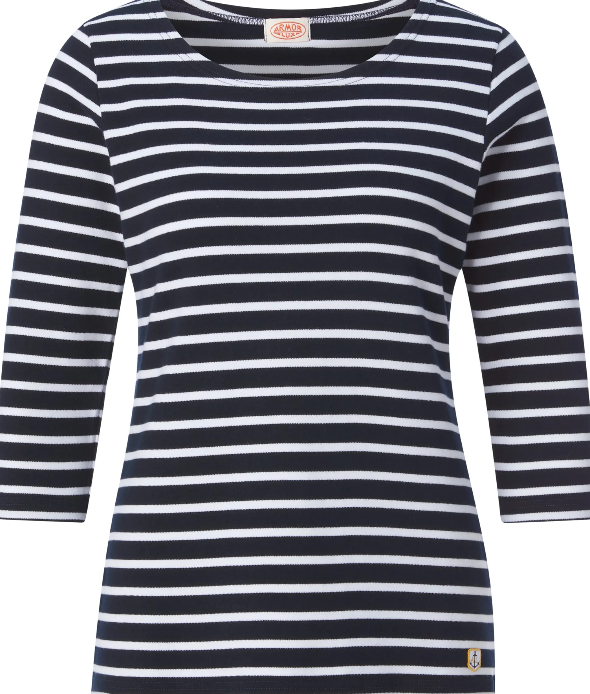 Dieses Shirt ist die leicht antaillierte Version des klassischen Matrosenshirts von Armor lux. Die Ärmel sind dreiviertellang, der Halsausschnitt ist ohne Bündchen gearbeitet. Konfektioniert wird es in Frankreich aus einem mittelgewichtigen Baumwoll-Interlock in kbA-Qualität.