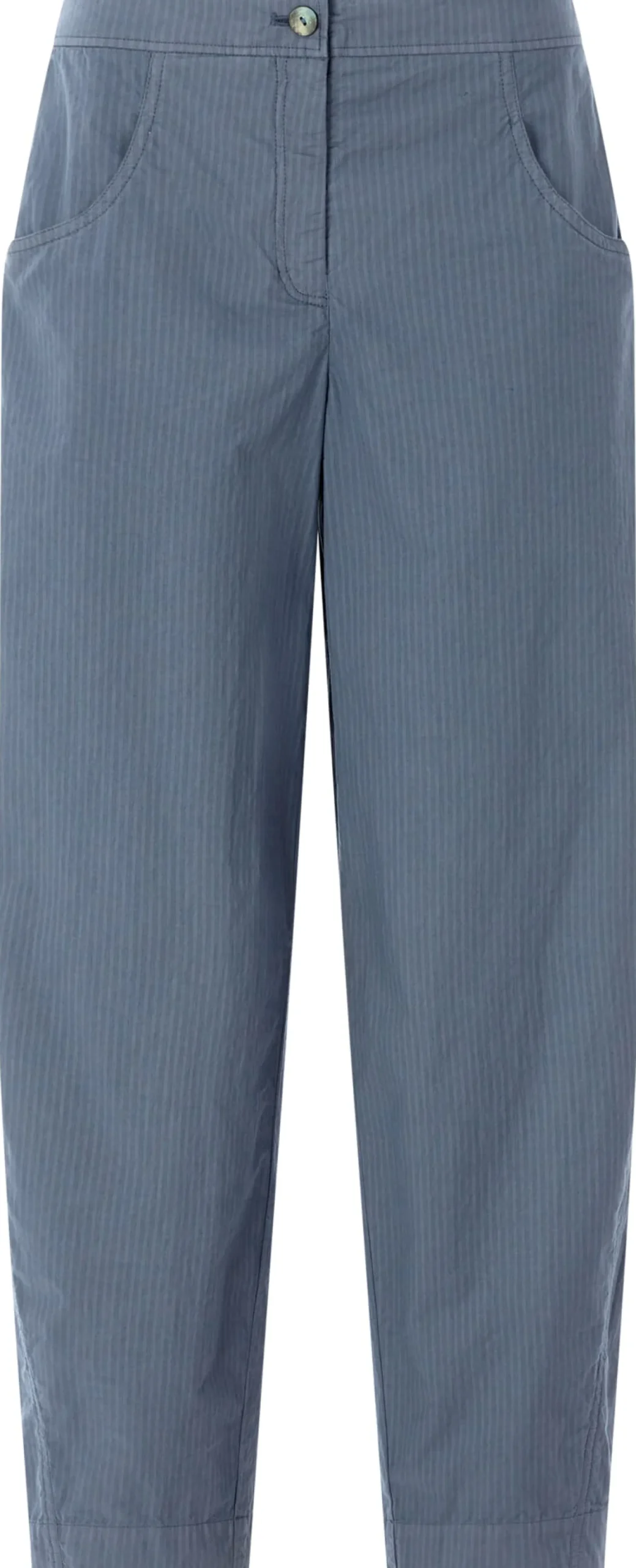Überaus lässig und tragefreundlich ist diese Hose, die Oska aus einer leichten und gleichzeitig strapazierbaren Popeline aus hautsympathischer Baumwolle fertigt. Ein geringer Anteil Elastan verleiht dem dicht gewebtem Stoff einen leichten Stretch-Effekt. Die schmalen Webstreifen sorgen für einen markanten Look. Aber nicht nur das Material überzeugt, sondern auch die besondere Schnittführung der Hose im Barrel-Stil. Die Form betont die Taille, sitzt an Hüfte, Oberschenkeln und den Beinen locker und läuft an den Knöcheln wieder eng zusammen. Ausgestattet ist die Hose mit zwei Seitentaschen, zwei großen Gesäßtaschen und einem Teilgummibund im Rücken. Vorverlegte Seitennähte verschlanken die Silhouette optisch.