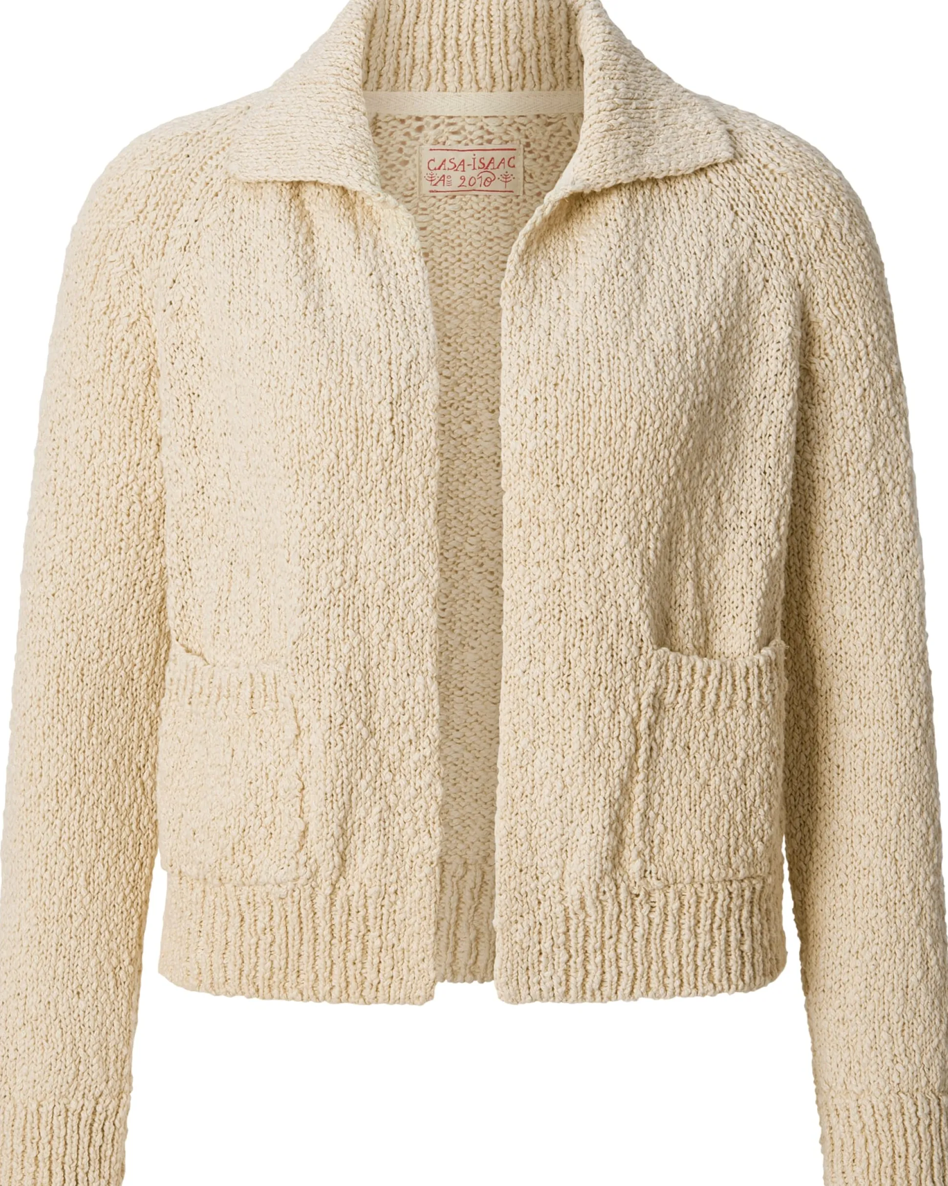 Kurz geschnittene Strickjacke in bequemer Passform – tragefreundlich und gut zu kombinieren. Sie wird von Maglificio GRP unter der eigenen Linie „Casa Isaac“ gefertigt, die von volkstümlichen und ländlichen Motiven inspiriert ist. Das griffige Gestrick besteht aus hautsympathischer Baumwolle und zeigt ein lebendiges Maschenbild, das dadurch zustande kommt, dass hier ein unregelmäßig gesponnenes Garn mit dickeren und dünneren Partien verwendet wird. Gearbeitet ist die verschlusslose Strickjacke mit Raglanärmeln, Umlegekragen und zwei aufgesetzten Taschen. Rippenstrickbündchen an Hals, Ärmeln und Rumpf runden das Design ab.