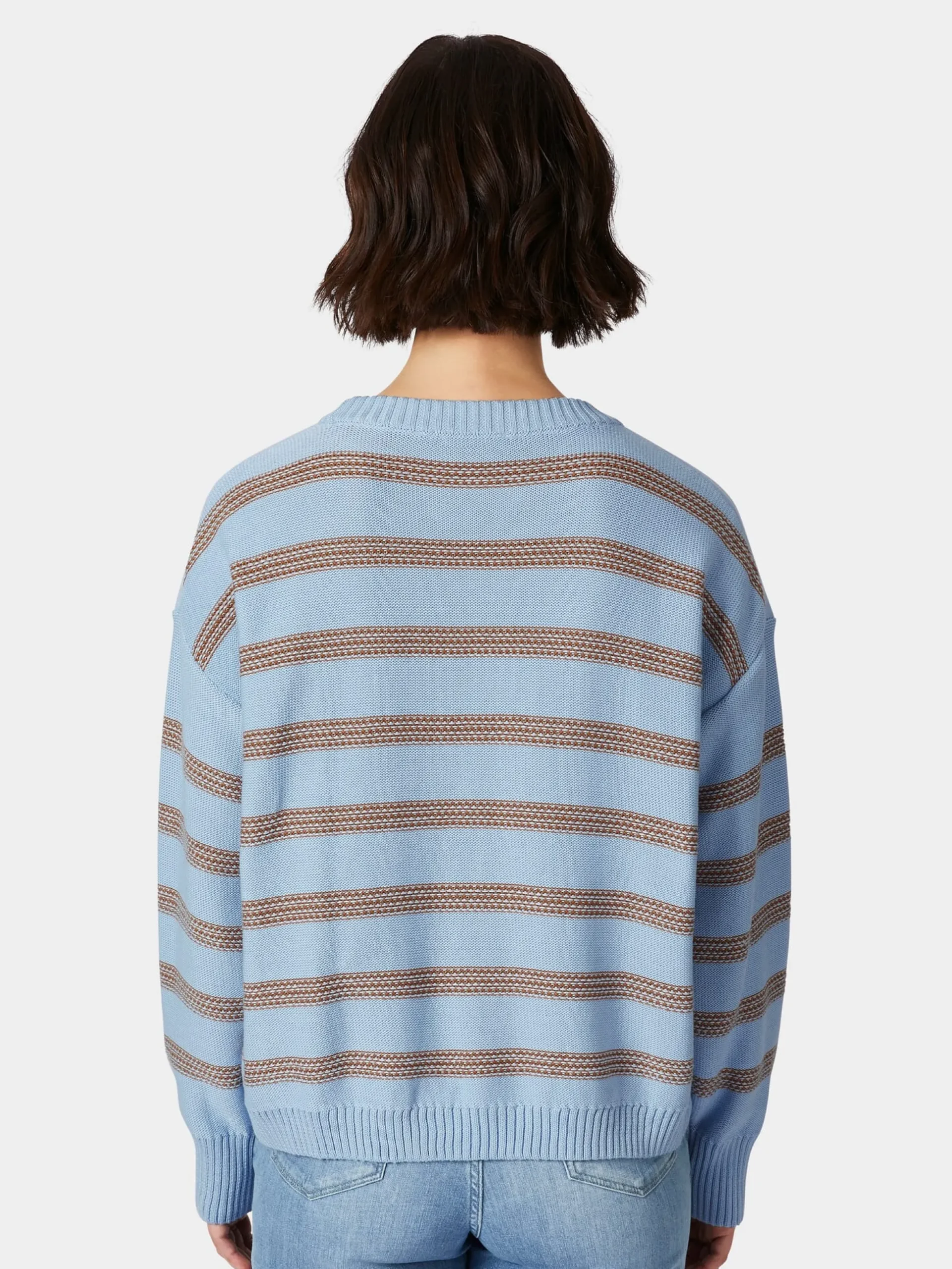 Dieser linksgestrickte Pullover besticht durch seine bequeme Passform und die stricktechnischen Details. Die horizontalen Streifen in Brauntönen korrespondieren mit dem Bleu des Fonds, was dem Pullover im Zusammenspiel mit dem markanten Maschenbild eine zeitlose sportliche Eleganz verleiht. Die Rippenstrickbündchen an Hals, Ärmeln und Rumpfsaum sorgen für guten Sitz. Der Rundhalsausschnitt unterstreicht den lässigen Look, während das Material – reine, kontrolliert biologisch angebaute Baumwolle – ein angenehmes Tragegefühl garantiert. Der Pullover ist vielseitig kombinierbar, besonders gut passt er Jeans oder Chinos.