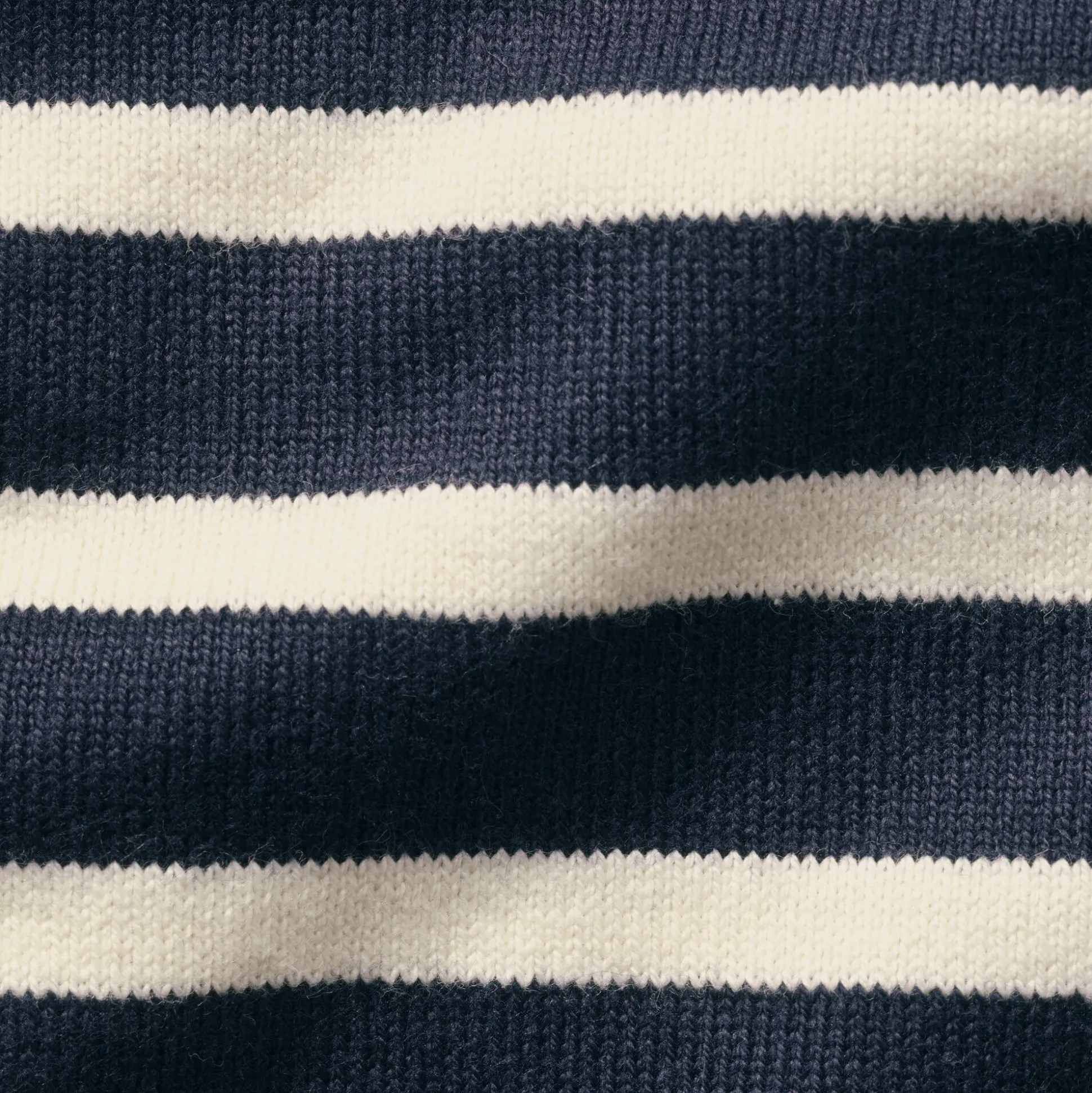 Dieser gestreifte Baumwollpullover ist eher kurz gehalten und dabei leicht antailliert geschnitten. Das gestrickte Oberteil steht in der Tradition des klassischen französischen Matrosenpullovers – mit dem Ringelmuster, das im Jahr 1858, als der Pullover als Teil der Marineuniform eingeführt wurde, standardmäßig 21 Streifen zeigte.