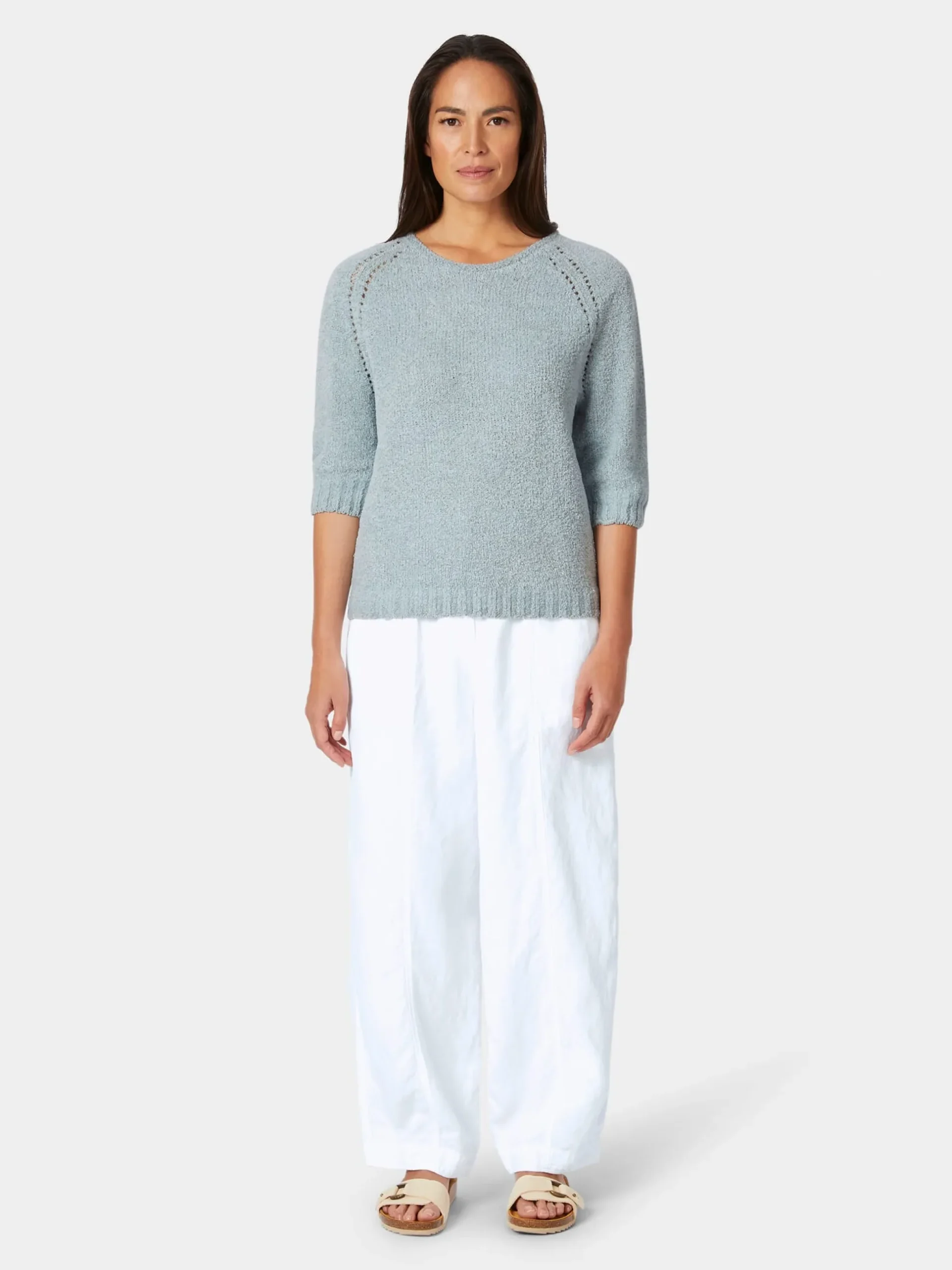 Mit seinen feinen Ajour-Details entlang der Raglanärmel und im Rücken überzeugt dieses Strickshirt schon rein optisch. Zum Lieblingsstück wird es jedoch vor allem durch seinen hohen Tragekomfort. Seldom fertigt es aus Chenillegarn, das dem Gestrick Volumen und eine schmiegsame, nahezu samtartige Haptik verleiht. Die Kombination aus Leinen und kontrolliert biologisch angebauter Baumwolle erhöht den Tragekomfort noch und sorgt für eine natürliche Atmungsaktivität und ein angenehmes Hautgefühl, während der geringe Anteil an Polyamid das Gestrick elastischer und formbeständiger werden lässt. Geschnitten ist das Shirt in legerer, bequemer Passform. Breite Rippenstrickbündchen bilden den Abschluss an Ärmeln und Rumpf.