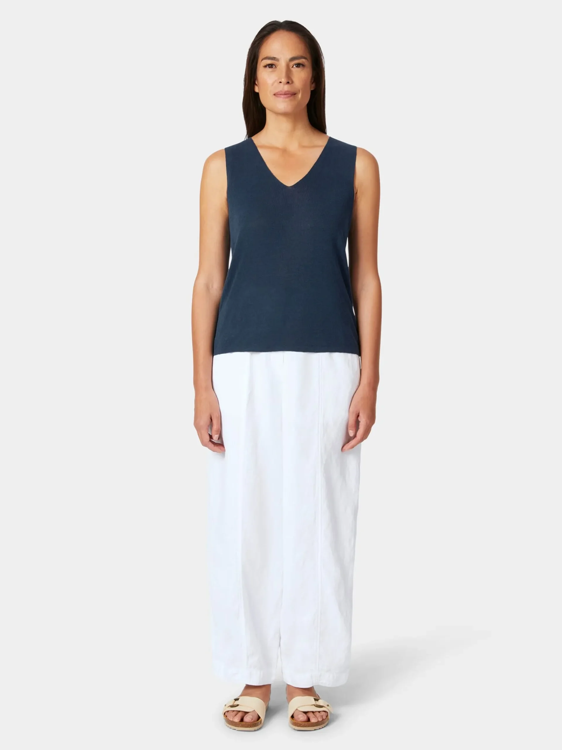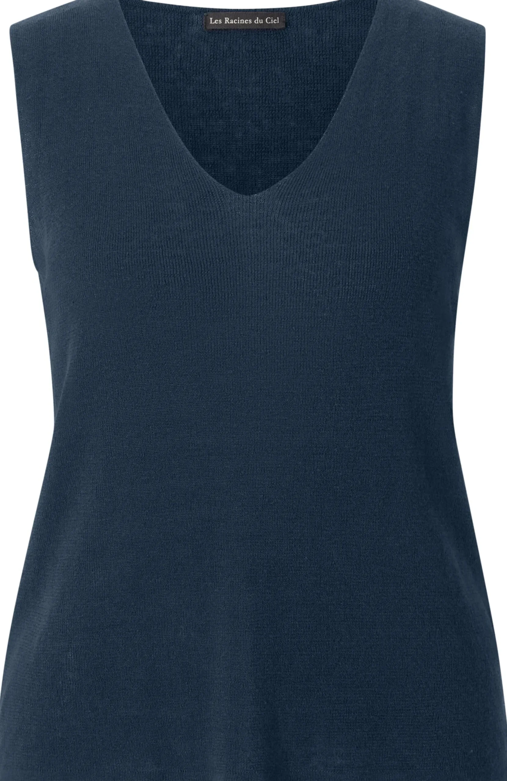Ein Lieblingsstück für den Sommer: luftig-leicht, bequem und vielseitig zu kombinieren – ob mit Hose oder Rock, solo getragen oder unter einem Blazer. Auch die Materialwahl ist perfekt auf die warme Jahreszeit abgestimmt. Les Racines du Ciel verwendet hier eine Kombination, die zu 70 Prozent aus atmungsaktivem, kühlendem Leinen und zu 30 Prozent aus hautsympathischer, kontrolliert biologisch angebauter Baumwolle besteht. Das feine Gestrick zeigt eine leichte Transparenz und ist dehnbar, was den Tragekomfort noch erhöht. Gearbeitet ist das Stricktop mit breiten Trägern und V-Ausschnitt, im Nacken ist es hoch geschnitten. Seine lockere Passform sorgt für einen lässigen Sitz, der die Figur sanft umspielt.