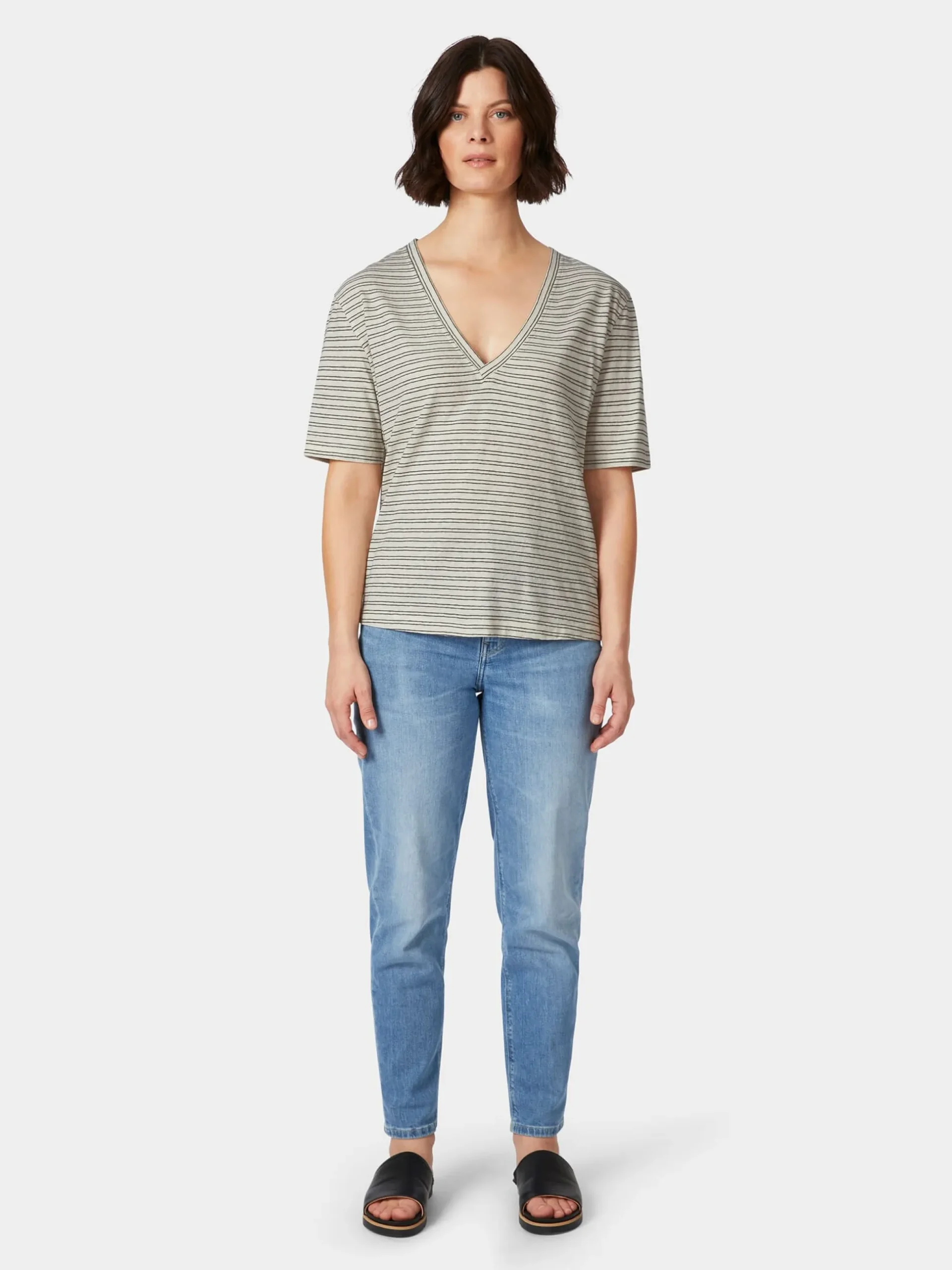 Hanf war einst das textile Material der Wahl. Gut, dass die Textilindustrie sich heute wieder auf die Nutzung der alten Kulturpflanze besinnt. Denn bei Hanf handelt sich um eine schnell nachwachsende, anspruchslose Pflanze, die beim Anbau wenig Wasser und keine Herbizide, Pestizide oder synthetische Dünger benötigt. Dieses T-Shirt kombiniert die natürlichen Vorteile von Hanf und kontrolliert biologisch angebauter Baumwolle. Der feine Stoff bietet ein angenehmes Tragegefühl und besitzt eine hervorragende Atmungsaktivität – ideal für die warme Jahreszeit. Das gewirkte, leicht unregelmäßige Ringelmuster verleiht dem T-Shirt lässigen Look und der tiefe V-Ausschnitt betont das Dekolleté. Alles in allem der perfekte Begleiter für entspannte Freizeitoutfits und ein gutes Basisstück für elegante Lagenlooks.