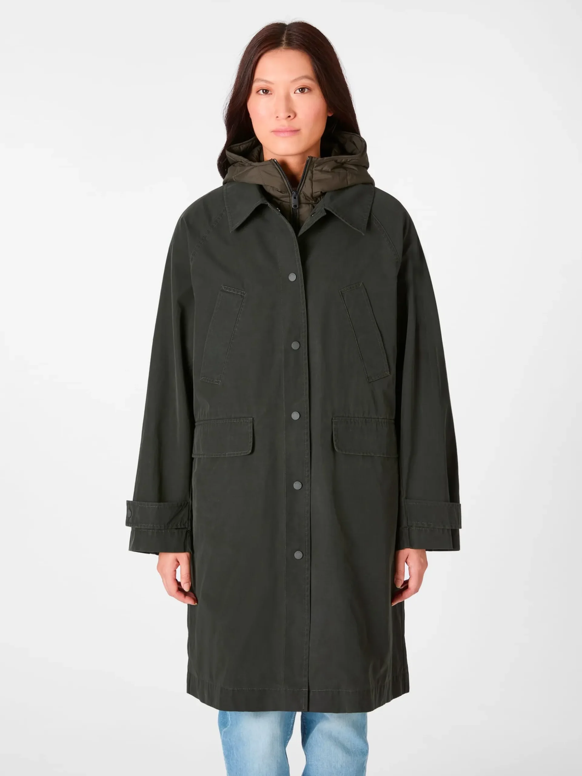 In der Übergangszeit ist bei Bekleidung eines ganz besonders wichtig: der Schichtwechsel. Mit diesem 2in1-Trenchcoat können Sie diesem nach Lust und Laune respektive nach Wetterlage ausgiebig frönen. Ob im Doppel oder im Einzel – zu jeder Zeit sind Sie komfortabel angezogen, selbst wenn das Wetter Ihnen einmal übel mitspielen sollte. Das wasser- und windabweisende Manteltuch fertigt Ecoalf jeweils gut zur Hälfte aus strapazierbarem Recycling-Polyester und hautsympathischer Baumwolle. Es zeigt einen leichten Used Look und die Stoffoberfläche ist gepeached (angeraut), daher fühlt es sich samtig-weich an. Der Trenchcoat wird mittels Druckknöpfen geschlossen und ist mit eingesetzten Pattentaschen und zwei Schubtaschen ausgestattet. Die Passform ist leger gehalten und bietet daher viel Bewegungsfreiheit, wozu auch der lange Rückenschlitz beiträgt. Die Ärmelöffnungen sind in zwei Weiten knöpfbar. Bei der langen, im Diagonalkaro gesteppten Weste bestehen Oberstoff, Futter und Füllung vollständig aus recyceltem Polyester, so ist sie angenehm leicht und wärmt dennoch sehr gut. Sie verfügt über zwei Seitentaschen und eine geräumige Kapuze und wird mit einem Zweiwegereißverschluss geschlossen. Alles in allem: ein oder vielmehr zwei hochfunktionale, stilvolle Kleidungsstücke, die Ihre Garderobe vielseitig bereichern.