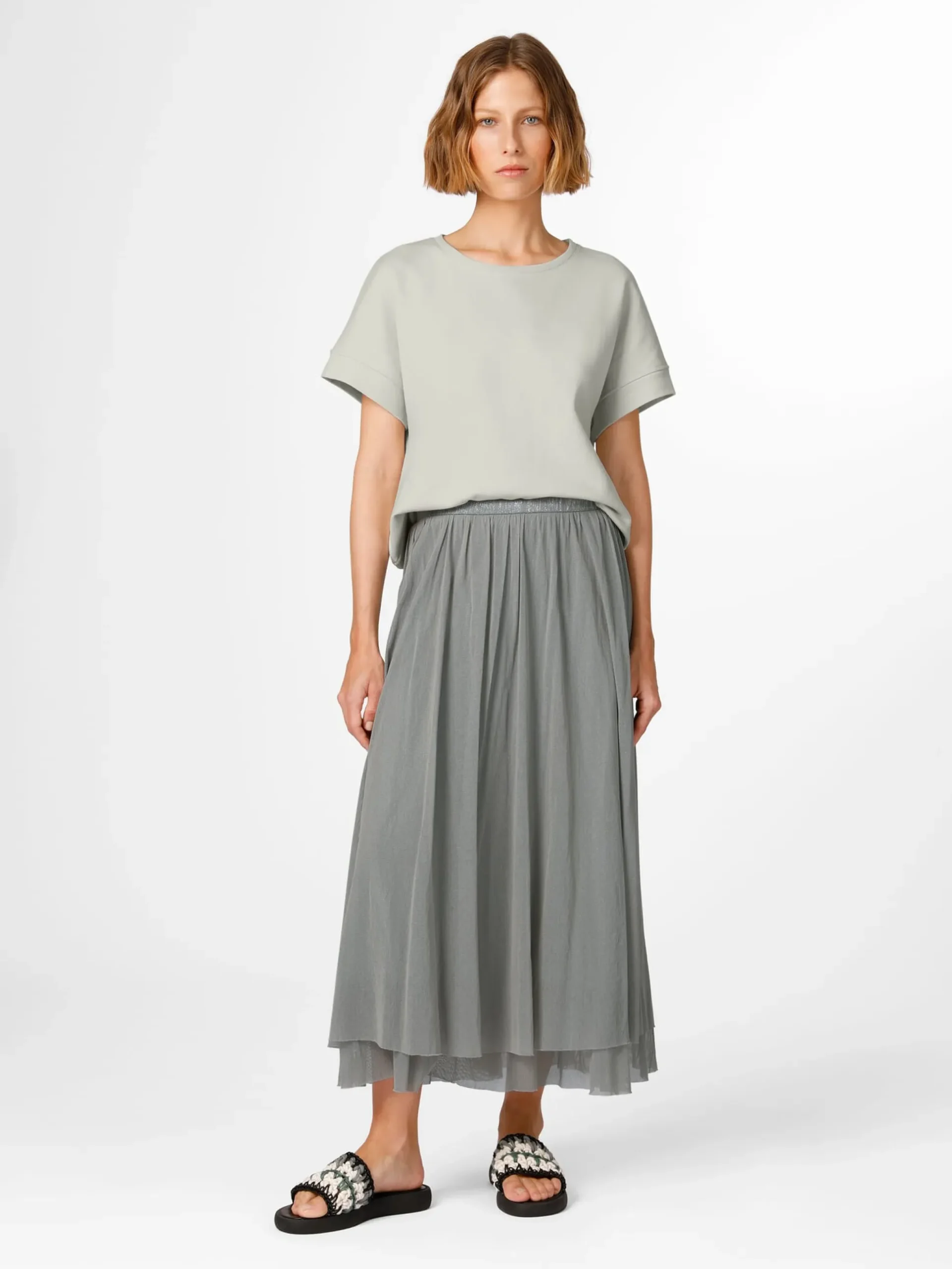 Sie sind zurück – die Tüllröcke! Dieser hier von Alma & Lovis ist allerdings eine Seltenheit, denn er besteht aus reiner kbA-Baumwolle und nicht aus Polyester wie die meisten seiner „Anverwandten“. Das macht ihn besonders weich und dehnbar. Ein Glitzer-Gummibund sorgt für noch mehr Bewegungsfreiheit. Der Rock hat zwei Lagen – die untere besteht aus glattem Bio-Baumwolljersey mit Tüllblende, die obere ist komplett aus Tüll gearbeitet und fällt im Stufenlook locker über die untere. Kombiniert mit Bluse oder T-Shirt, Blazer oder Lederjacke, Sandalen oder Sneakern – der Tüllrock lässt Spielraum für vielfältige Outfits, von elegant bis lässig.