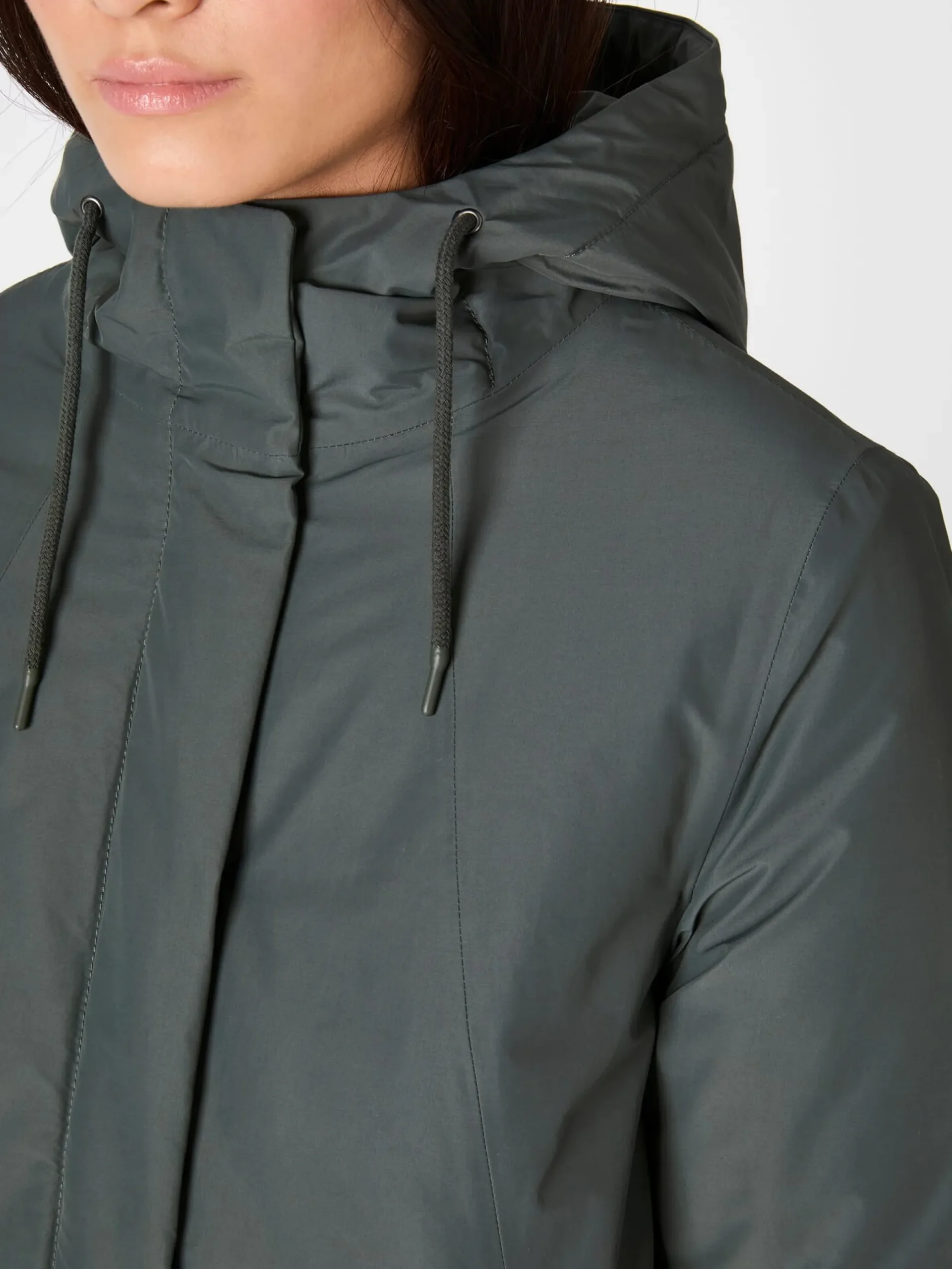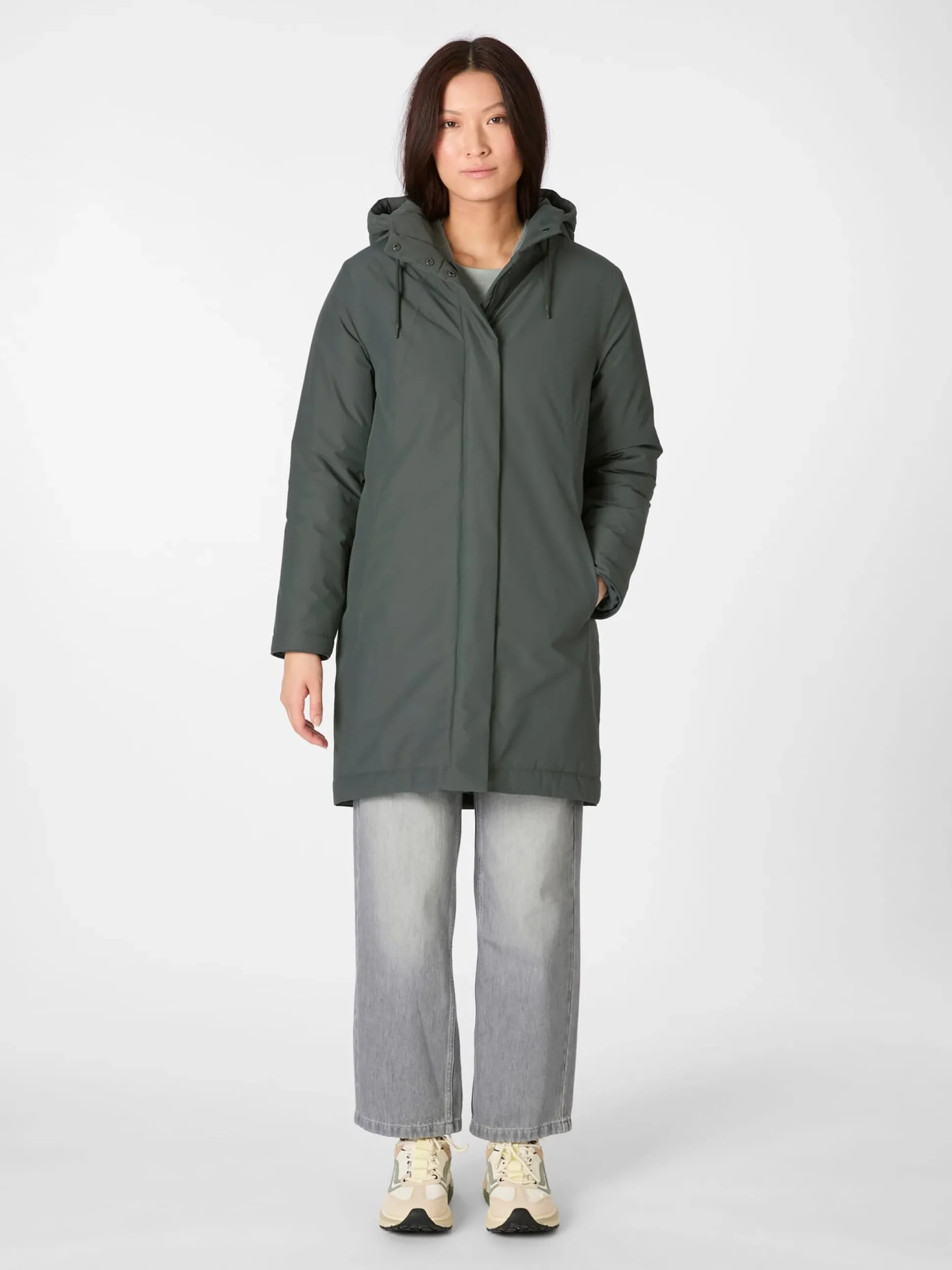 Dieser wetterfeste und wärmende Parka punktet durch seine schlicht gestaltete Optik, seine bequeme Passform und seine durchdachte Funktionalität. Das Obermaterial besteht aus kbA-Baumwolle und recyceltem Polyamid und ist mit einer innenliegenden, PFC-freien Polyurethan-Membran ausgestattet, wodurch der Parka atmungsaktiv sowie wind- und wasserdicht ist. Versiegelte Nähte halten Nässe zuverlässig ab. Die wärmende Wattierung besteht vollständig aus recyceltem Polyester und sorgt zusammen mit dem weichen Jersey-Innenfutter aus reinem Lyocell (TENCEL™) und den Belüftungsösen unter den Achseln für einen hohen Tragekomfort. Der Zweiwegereißverschluss lässt sich hoch bis zum Kinn schließen, über ihm liegt eine windabweisende Blende mit Druckknöpfen. Die geräumige, wattierte Kapuze lässt sich mittels Tunnelzug in der Weite anpassen und bietet so einen zusätzlichen Schutz vor Wind und Wetter. Konisch verlaufende Teilungsnähte vorn geben dem Parka einen guten Sitz und die zwei in die Teilungsnaht eingesetzten Eingrifftaschen sowie zwei Innentaschen nehmen Kleinteile des täglichen Bedarfs auf.