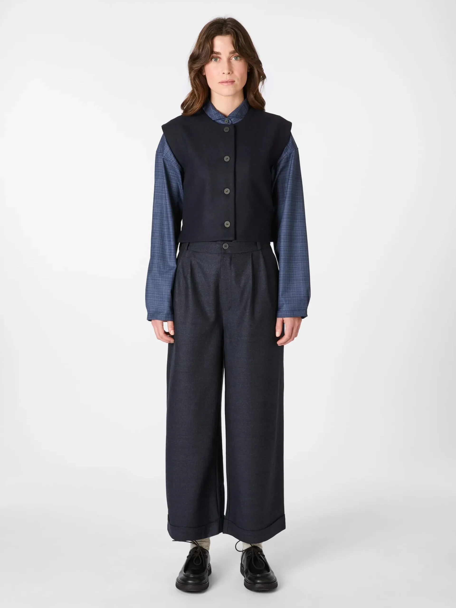 Diese wärmende, ungefütterte Weste konfektioniert Christiane Strobel aus einem dicht gewebten Tuch aus reiner Wolle. Der leicht antaillierte Schnitt und die Längsteilungsnaht im Rücken verschlanken die Silhouette optisch. Der Rumpfsaum ist vorn gerade und hinten gerundet. Seitenschlitze sorgen für mehr Bewegungsfreiheit. Kombiniert mit Bluse und Businesshose oder -rock im gleichen Farbton passt die Weste perfekt zu klassischen, eleganten Outfits. Im Mix mit Jeans und Shirt setzt sie legeren Looks das i-Tüpfelchen auf. Zu den markanten Details gehören die in Japan handgefertigten Papierknöpfe und das handgestickte Dreieck am rückseitig angebrachten Riegel.