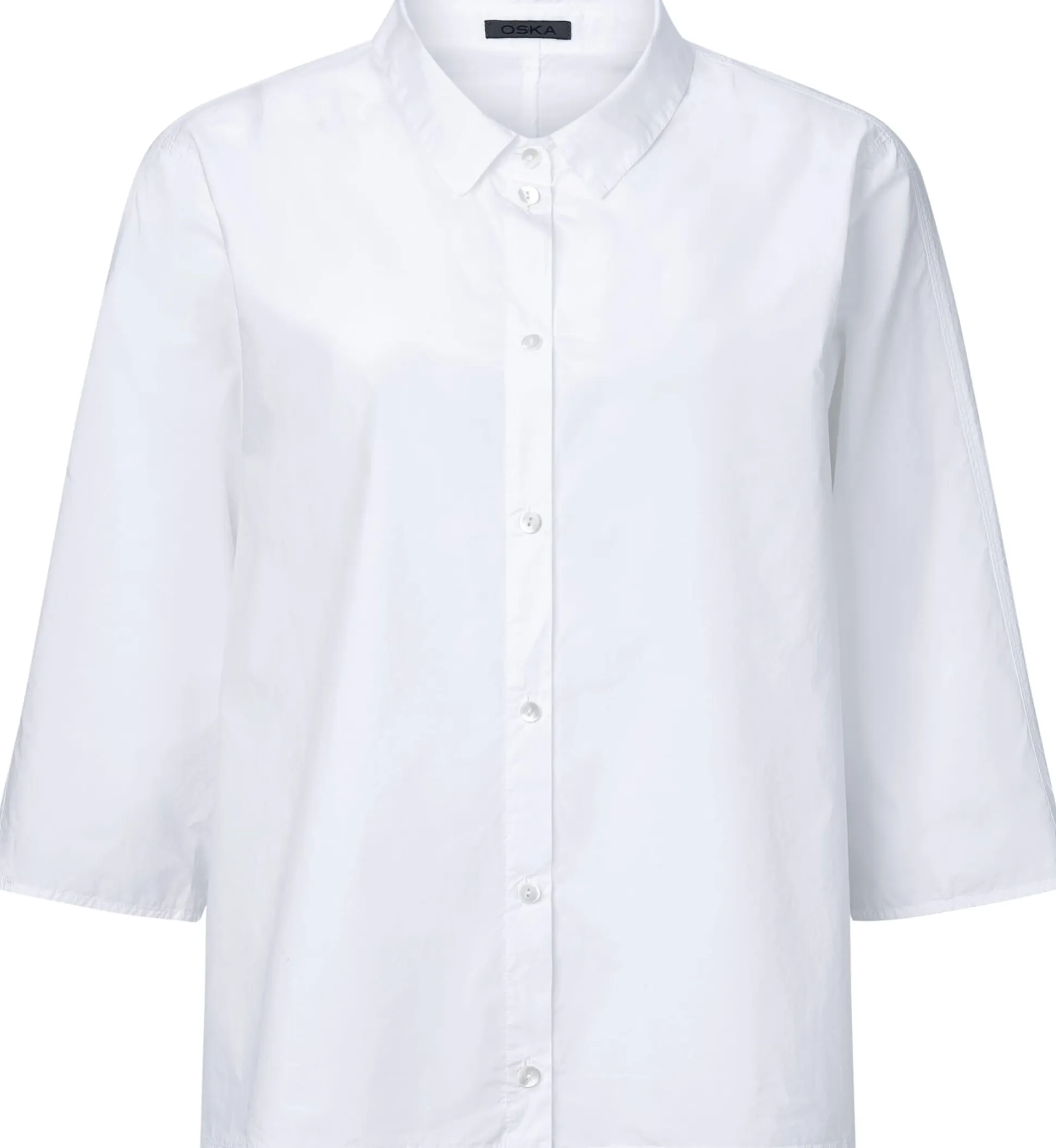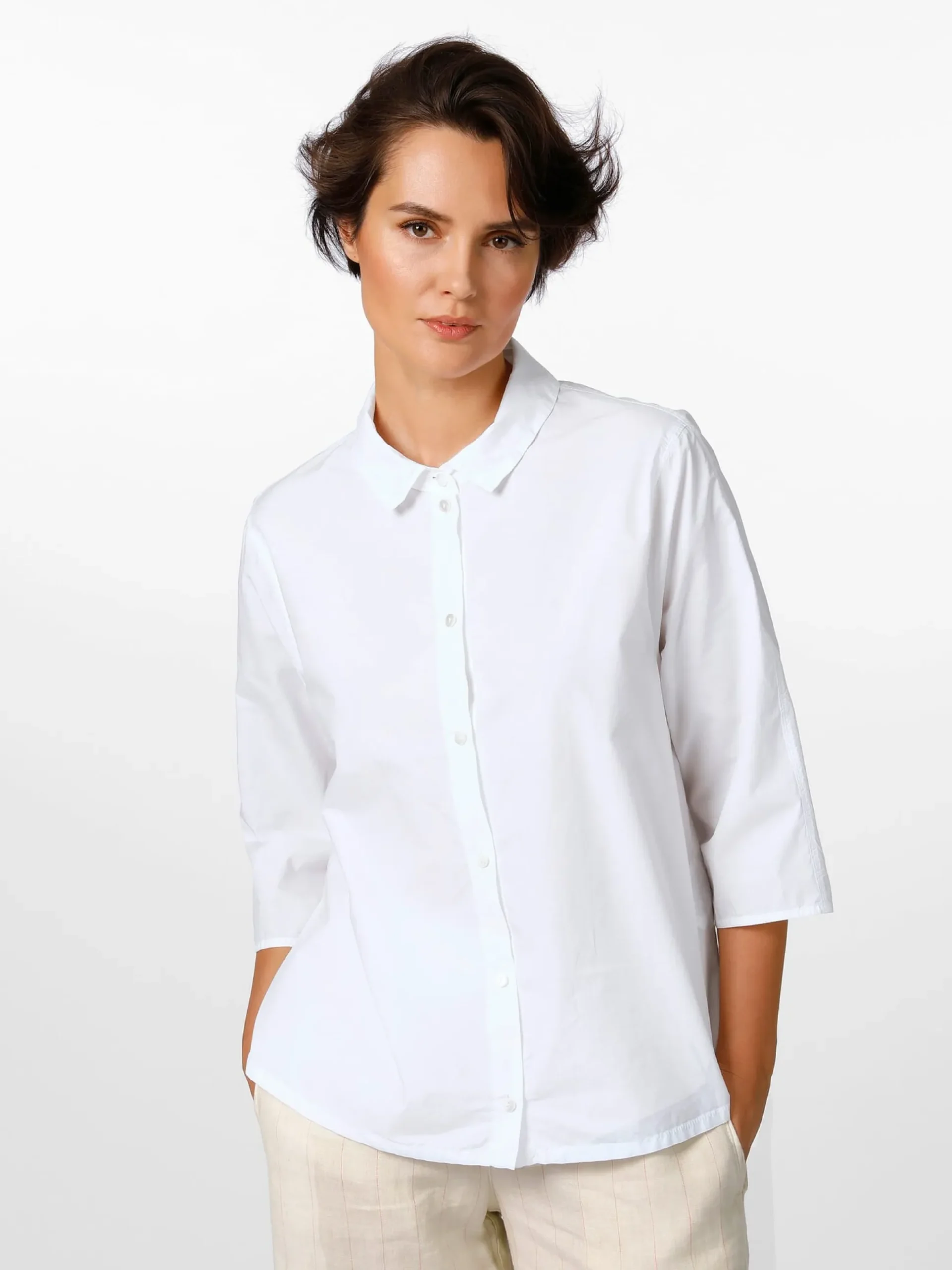 Ein sommerliches Basisstück ist diese leichte Bluse aus reiner, hautsympathischer Baumwolle. Die Bluse ist Oska-typisch überschnitten und dementsprechend lässig und bequem. Die Bluse ist mit leicht gerundetem Saum und kurzen Seitenschlitzen gearbeitet, die Ärmel können auch aufgekrempelt getragen werden. Eine Längsteilungsnaht hinten verschlankt die Silhouette optisch.