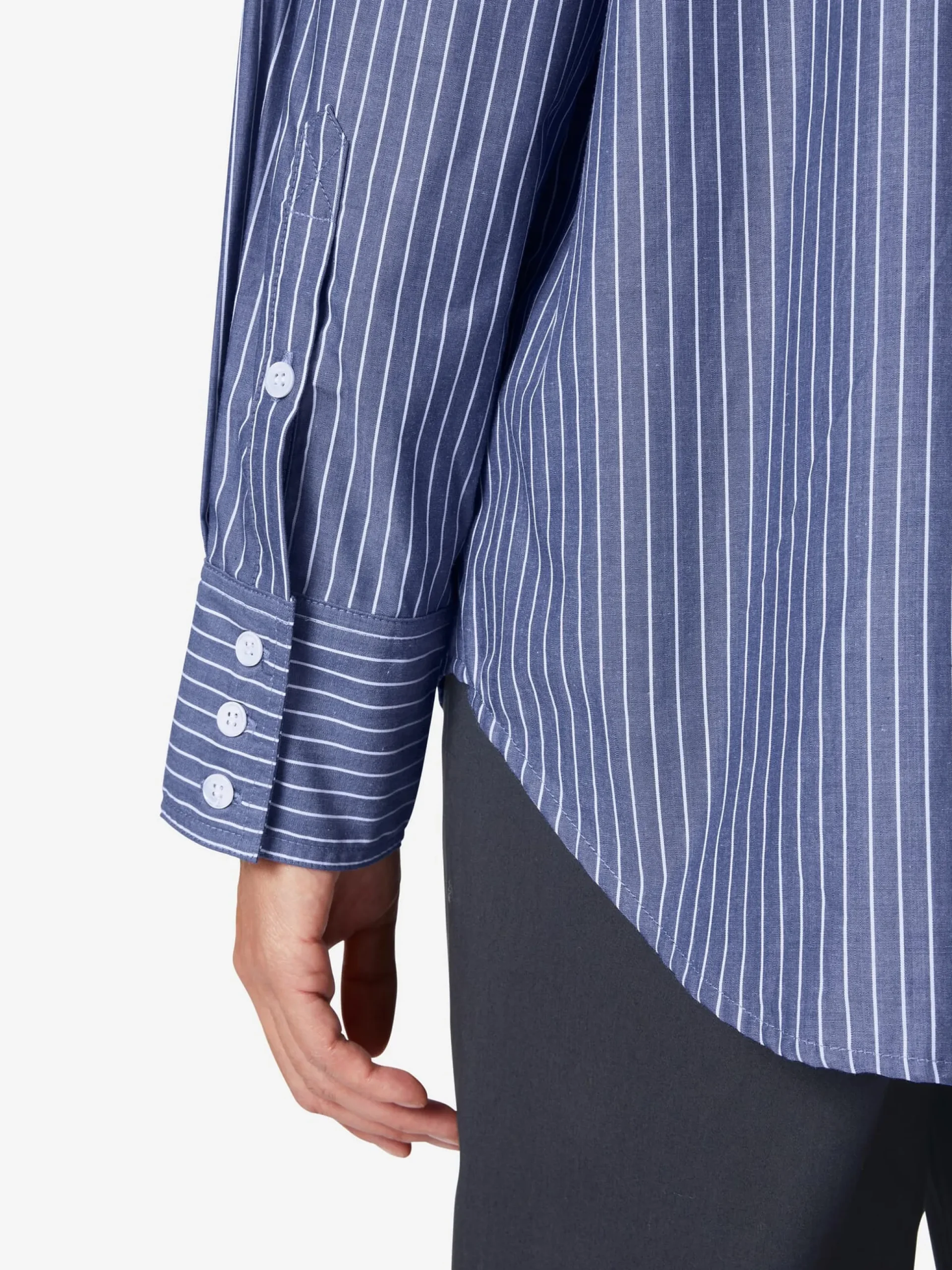 Sommerlich-leicht ist diese Bluse und die markanten Nadelstreifen verleihen ihr einen eleganten Look. Lanius fertigt sie aus einem hautsympathischen, angenehm glatt auf der Haut liegendem Chambray. Die verwendete Baumwolle stammt aus kontrolliert biologischem Anbau. Bei Chambray handelt es sich um einen dicht gewebten Stoff, bei dem Kett- und Schussfaden verschiedenfarbig sind, was ihm den charakteristischen Melangeeffekt verleiht. Überdies ist Chambray besonders atmungsaktiv und damit ideal für die warme Jahreszeit. Dank ihrer lockeren Passform mit überschnittenen Schultern und knopflos gearbeitetem Hemdkragen sitzt die Bluse ausgesprochen lässig und bequem. Eine Quetschfalte unter der hinteren Schulterpasse sorgt für noch mehr Bewegungsfreiheit. Die Ärmelmanschetten sind dreifach geknöpft, der Saum ist stark gerundet.