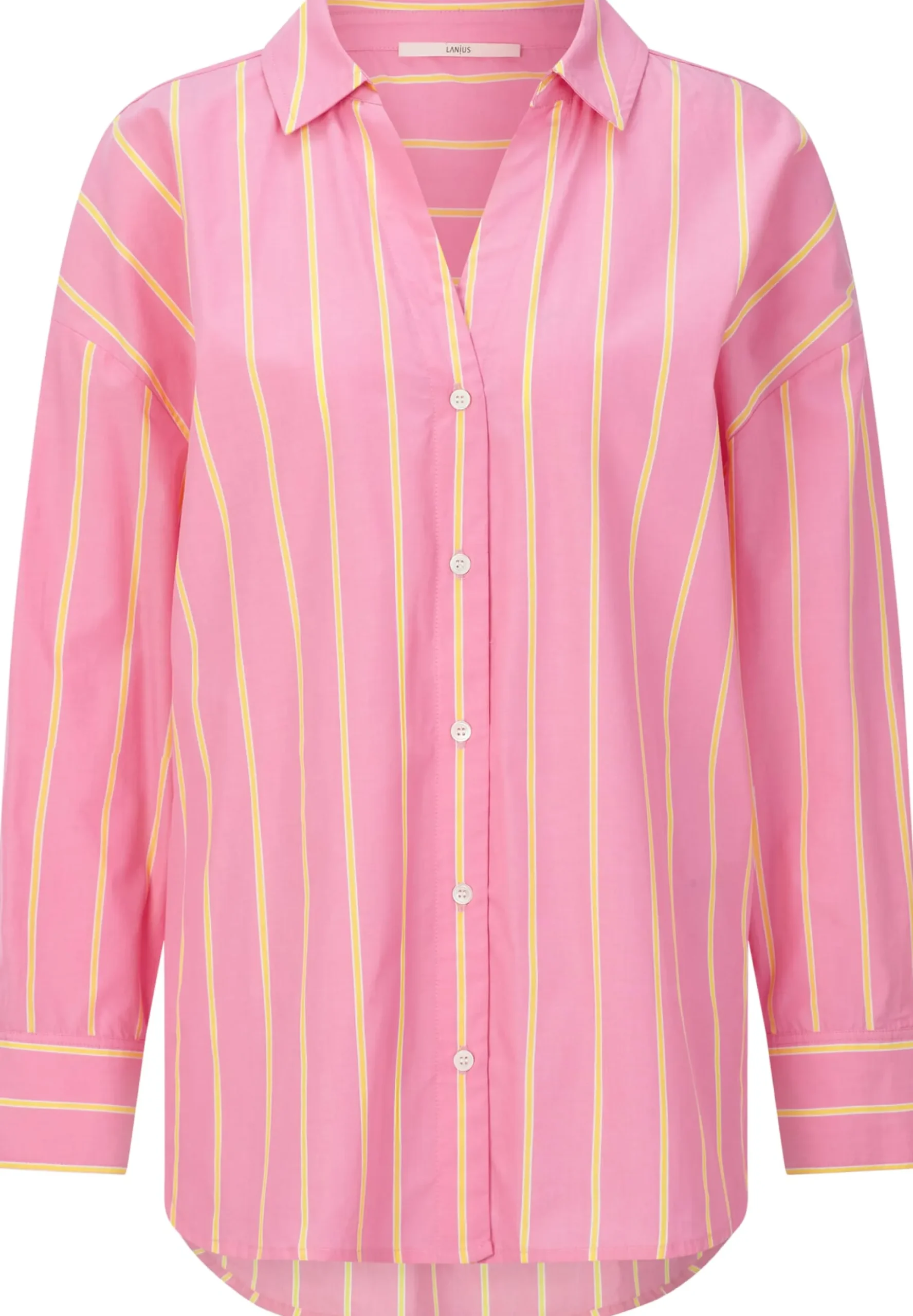 Sommerlich-leicht ist diese Bluse und die markanten Nadelstreifen verleihen ihr einen eleganten Look. Lanius fertigt sie aus einem hautsympathischen, angenehm glatt auf der Haut liegendem Chambray. Die verwendete Baumwolle stammt aus kontrolliert biologischem Anbau. Bei Chambray handelt es sich um einen dicht gewebten Stoff, bei dem Kett- und Schussfaden verschiedenfarbig sind, was ihm den charakteristischen Melangeeffekt verleiht. Überdies ist Chambray besonders atmungsaktiv und damit ideal für die warme Jahreszeit. Dank ihrer lockeren Passform mit überschnittenen Schultern und knopflos gearbeitetem Hemdkragen sitzt die Bluse ausgesprochen lässig und bequem. Eine Quetschfalte unter der hinteren Schulterpasse sorgt für noch mehr Bewegungsfreiheit. Die Ärmelmanschetten sind dreifach geknöpft, der Saum ist stark gerundet.