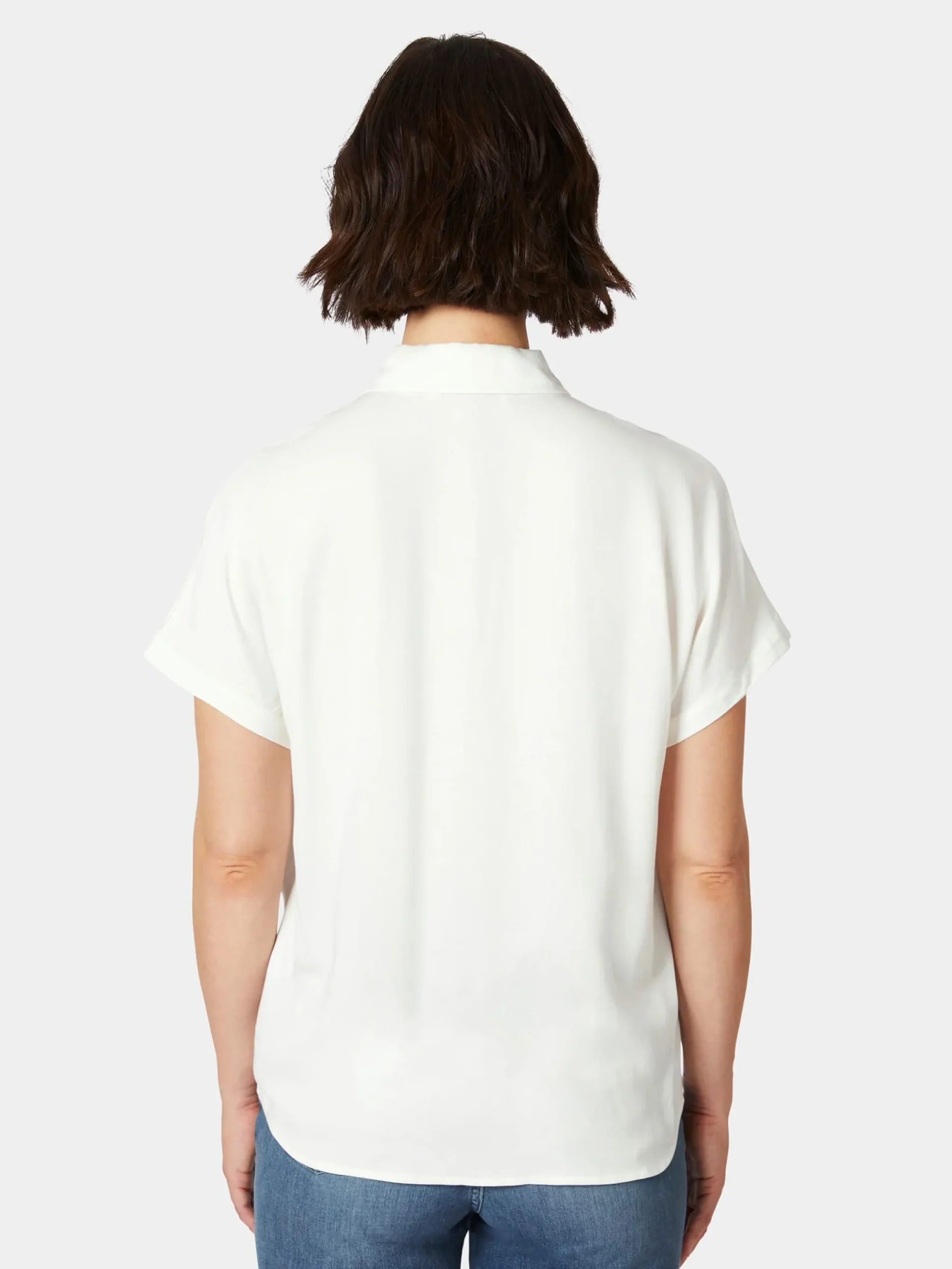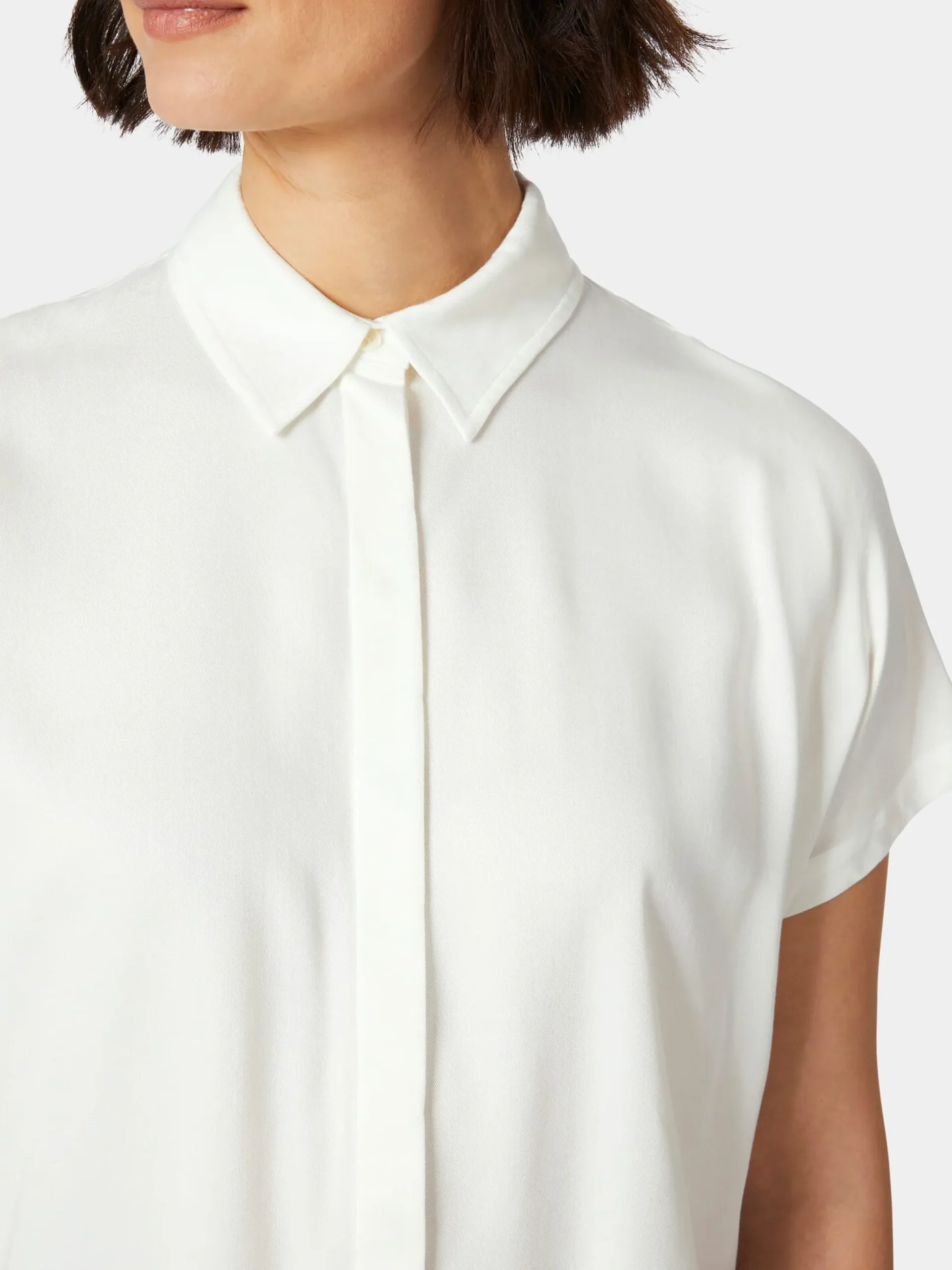 Diese Bluse ist dank des verwendeten Materials perfekt auf die warme Jahreszeit abgestimmt. Armedangels fertigt sie aus reiner LENZING™ ECOVERO™-Viskose, einer Regeneratfaser, die aus Holz und Zellstoff aus zertifizierten Quellen gewonnen wird. Das hautsympathische Gewebe hat eine schmiegsame Haptik und einen fließenden Fall, so wird die Figur weich umspielt. Zudem ist der Stoff besonders atmungsaktiv, da Viskose viel Feuchtigkeit aufnehmen und schnell wieder nach außen abgibt. Gearbeitet ist die Bluse mit Hemdkragen, verdeckter Knopfleiste und kurzen Ärmeln.