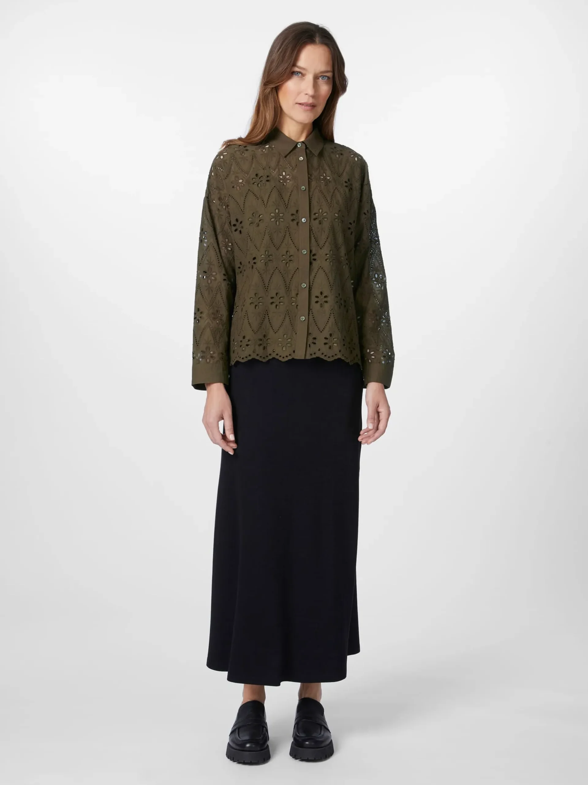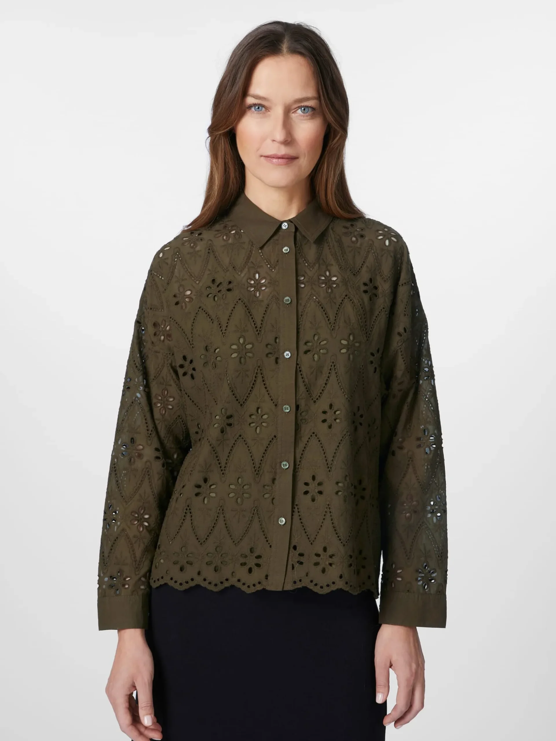 Das durchbrochene Muster mit floralen und geometrischen Motiven verleiht dieser Bluse eine feine Transparenz. Der Schnitt ist gerade und leger gehalten und der Blusenstoff besteht aus hautsympathischer, kontrolliert biologisch angebauter Baumwolle, was für einen hohen Tragekomfort sorgt. Gearbeitet ist die Bluse mit durchgehender Knopfleiste, klassischem Hemdkragen und langen Ärmeln mit geknöpften Manschetten. Der gewellte Saum und die grün schimmernden Perlmuttknöpfe runden das Design ab. Für weniger Transparenz lässt sich die Bluse mit einem Unterzieh-Top kombinieren – am besten in ähnlicher Farbstellung oder in Schwarz.