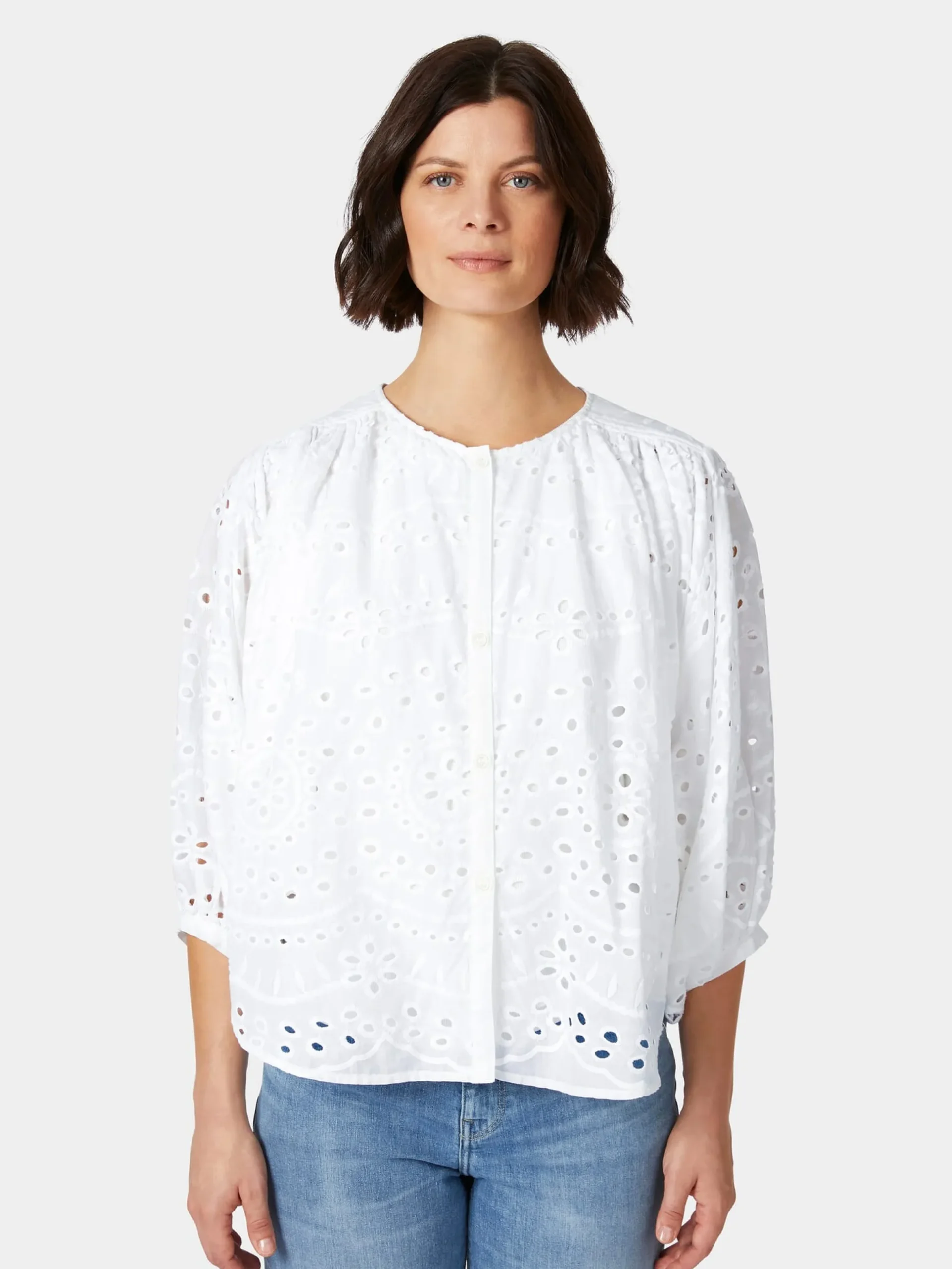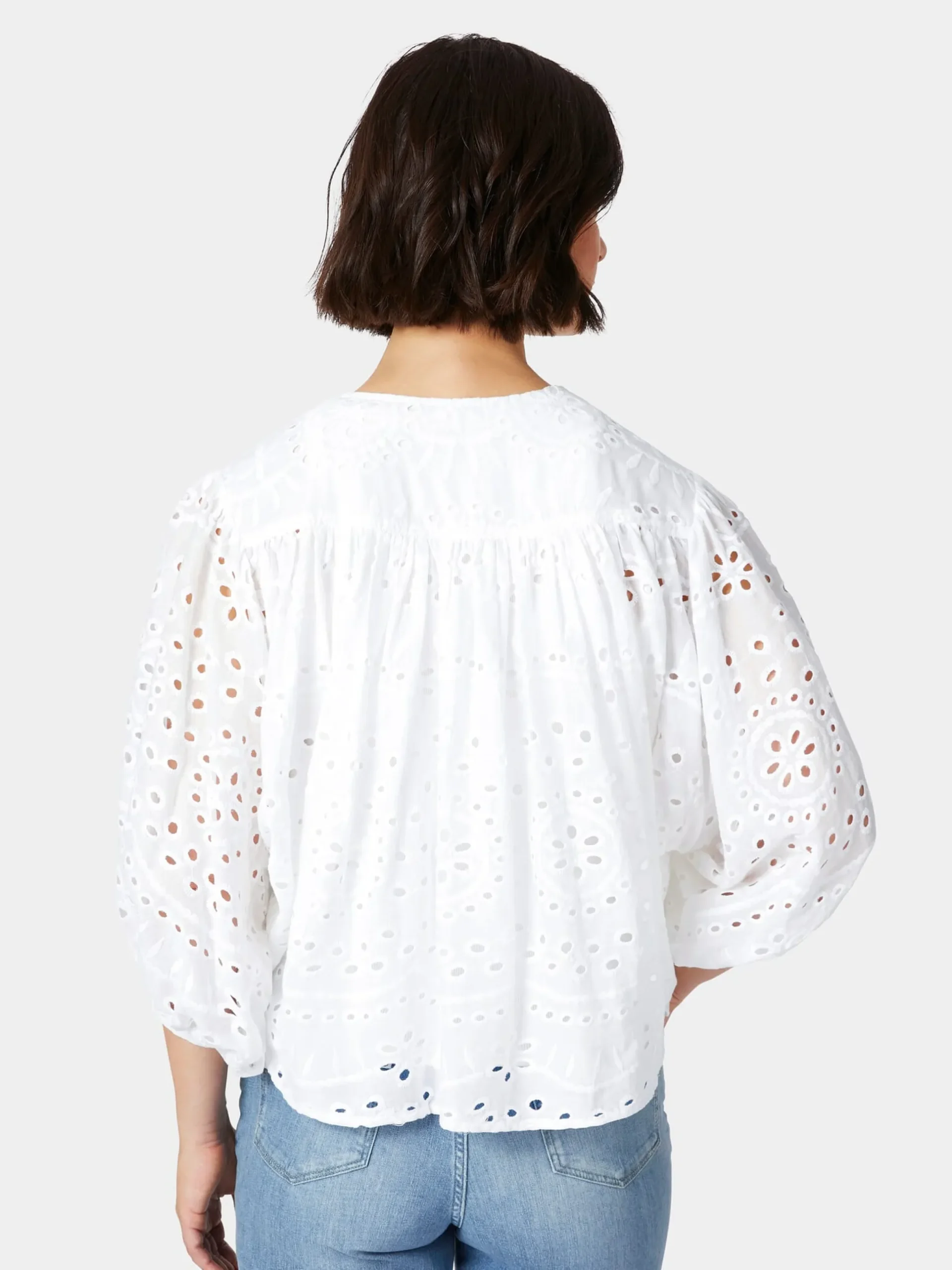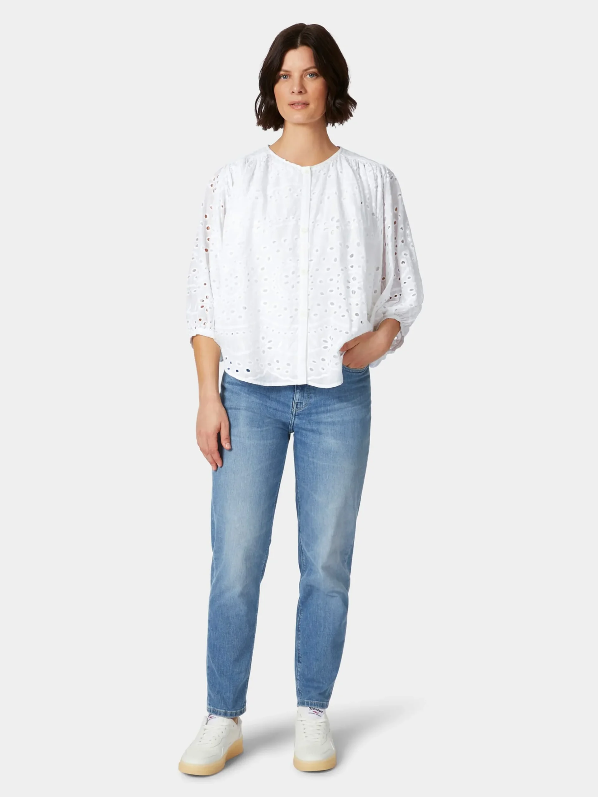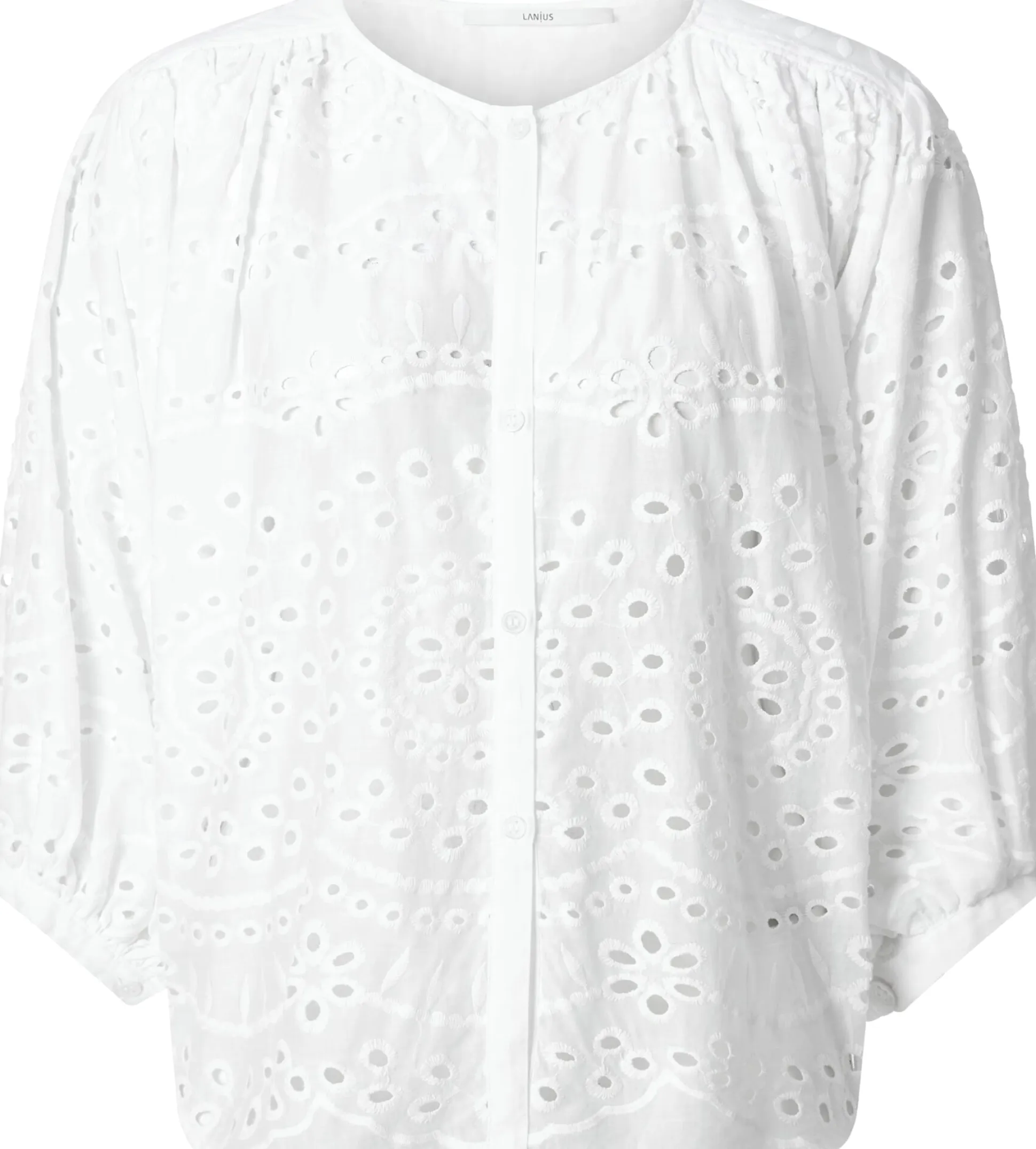 Diese luftige Bluse mit Lochstickereien in der Tradition der Broderie anglaise (französisch für englische Stickerei), verleiht Ihrem Outfit eine feminine Note. Die Textiltechnik stammt ursprünglich aus Osteuropa, war aber im 19. Jahrhundert vor allem in England populär, daher ihr Name. Der Stoff, den Lanius hier verwendet, zeigt ein filigranes, durchbrochenes Muster aus zart umstickten Löchern, die in floralen und geometrischen Formen angeordnet sind und eine feine Transparenz bewirken. Die verwendete Baumwolle stammt aus kontrolliert biologischem Anbau. Gearbeitet ist die Bluse in bequemer, überschnittener Passform mit gerundetem Saum. Die weiten, geknöpften Pumpärmel und die gekräuselten Partien an der Schulter vorn und unter der hinteren Schulterpasse unterstreichen den femininen Look und sorgen für einen schönen und weichen Fall, der die Figur sanft umspielt.
