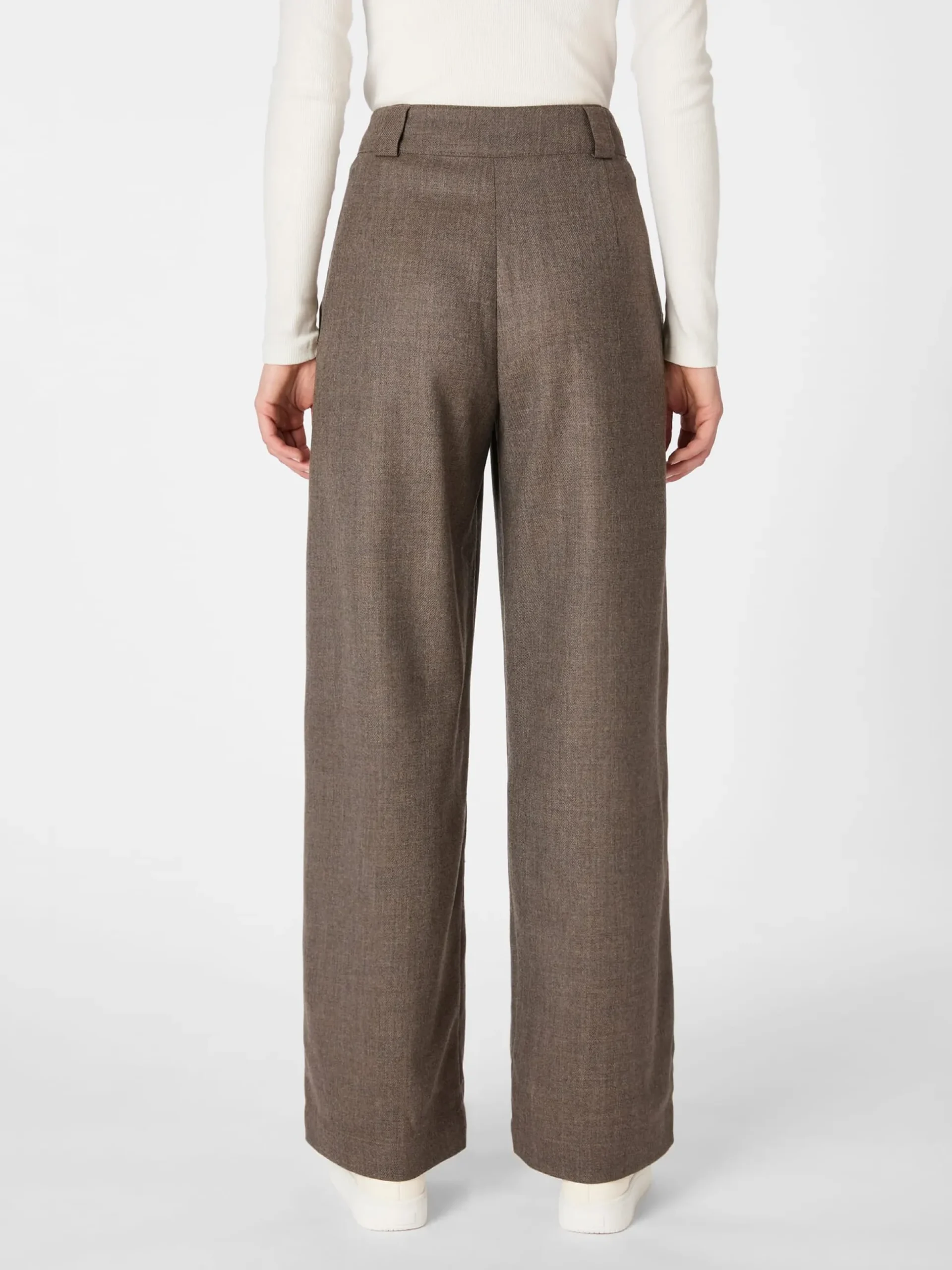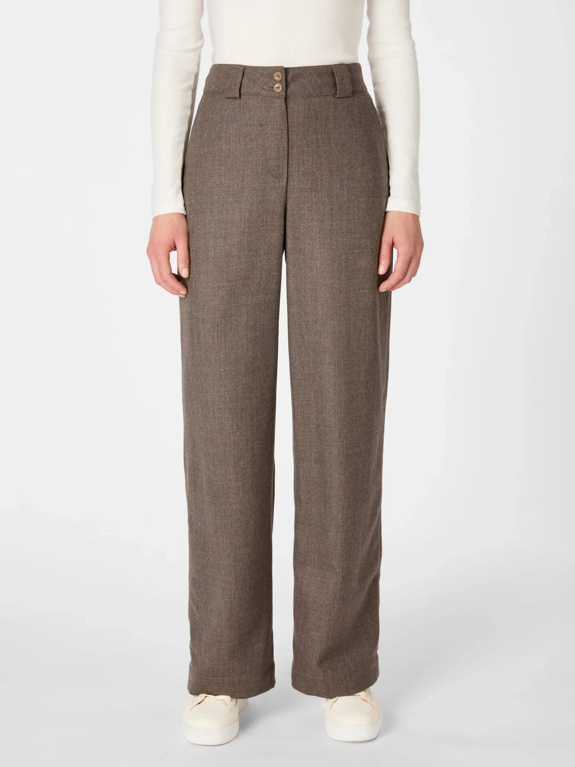 Dank ihres klassischen Schnitts im Marlenestil und dem verwendeten Material ist diese Hose besonders tragefreundlich. Sie verleiht jedem Outfit eine lässige Eleganz und ihre bequeme Passform mit geradem, weitem Bein schmeichelt der Figur. Das Gewebe zeigt einen sichtbaren Köpergrat und eine schöne Melangeoptik. Wir lassen es aus wärmender und temperaturausgleichender Schurwolle fertigen – perfekt für etwas kühlere Tage. Geschlossen wird die Hose mit Reißverschluss und Steinnussknöpfen. Zwei Seitentaschen bieten Platz für Kleinteile des täglichen Bedarfs.