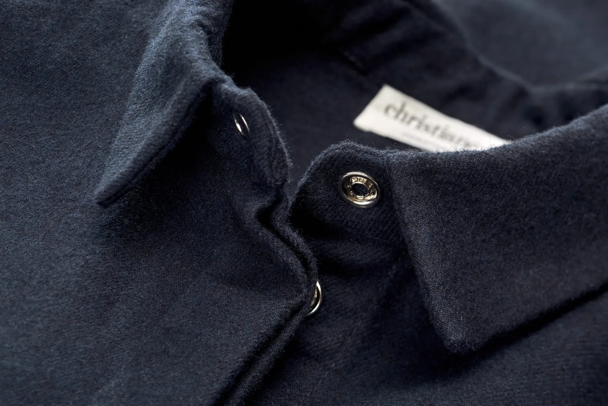 Weich, griffig und hautsympathisch – ideal für etwas kühlere Tage. Diese leicht überschnittene Flanelljacke fertigt Christiane Strobel aus kontrolliert biologisch angebauter Baumwolle. Ausgestattet ist sie mit tief angesetzter Brusttasche, verdeckter Druckknopfleiste und geschlitzten Manschetten, die sich gut krempeln lassen. Der vordere Teil ist etwas kürzer und mit geradem Rumpfsaum, während der etwas längere hintere Teil mit gerundetem Rumpfsaum gearbeitet ist, was den legeren Schnitt der Jacke unterstreicht. Weitere markante Details sind die gekräuselte Partie unter der Schulterpasse, der ungewöhnliche Kragen, der vorn als Kentkragen und hinten als Stehkragen erscheint, und das handgestickte Dreieck am rückseitig angebrachten Riegel.
