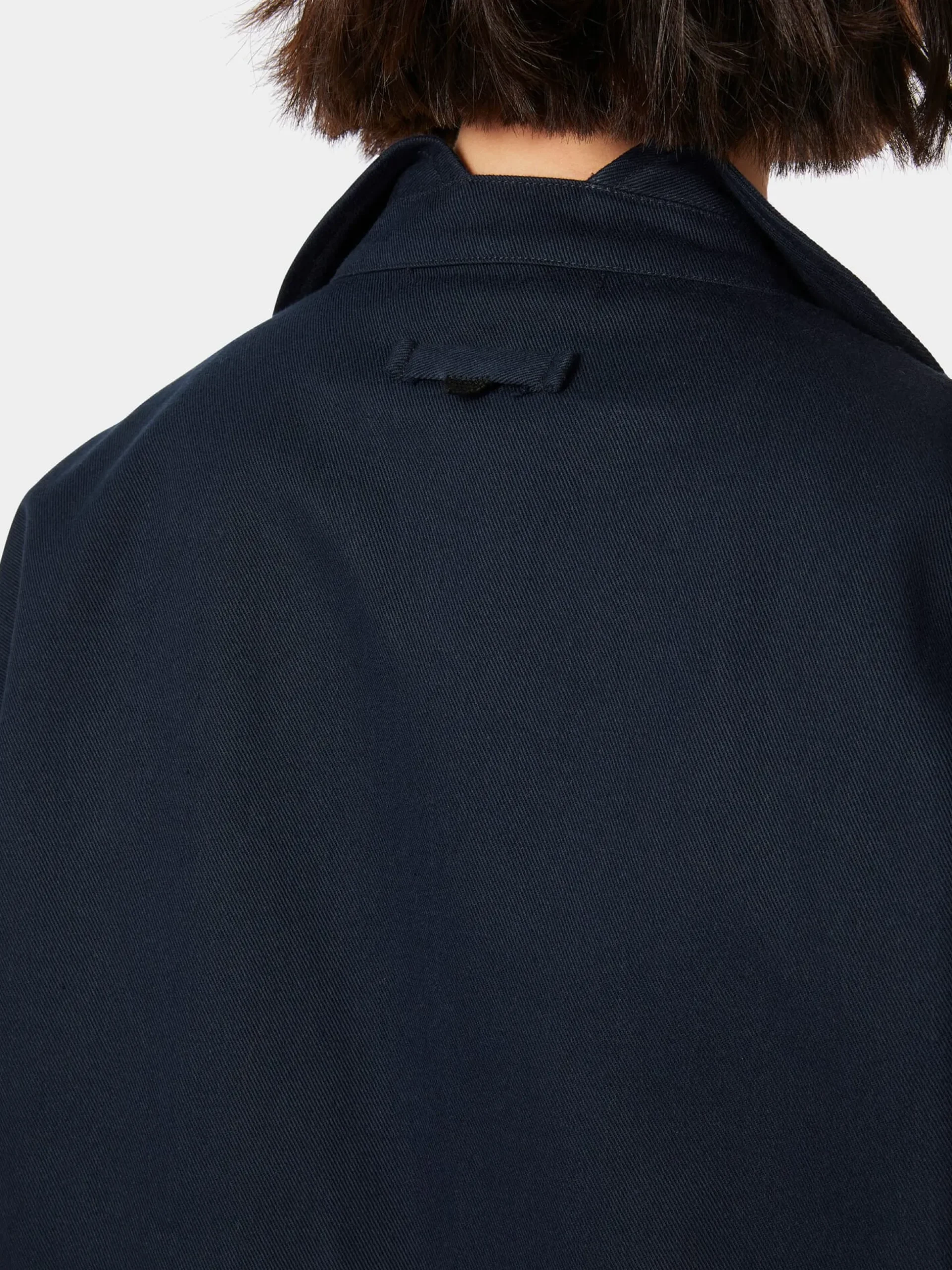 Diese gerade geschnittene Damenjacke im Stil einer Arbeitsjacke punktet durch ihre bequeme Passform und ihre lässige Optik. Für den robusten Twill verwendet Christiane Strobel hautsympathische, kontrolliert biologisch angebaute Baumwolle. Das dichte Gewebe hat einen kräftigen Griff und zeigt einen deutlichen, schräg verlaufenden Köpergrat. Ausgestattet ist die Jacke mit zwei großen aufgesetzten Taschen und markanten, in Japan handgefertigten Papierknöpfen. Besonders ist auch der Kragen, der vorn als Reverskragen erscheint und im Nacken unterbrochen ist, wodurch dort nur der Kragensteg sichtbar ist.