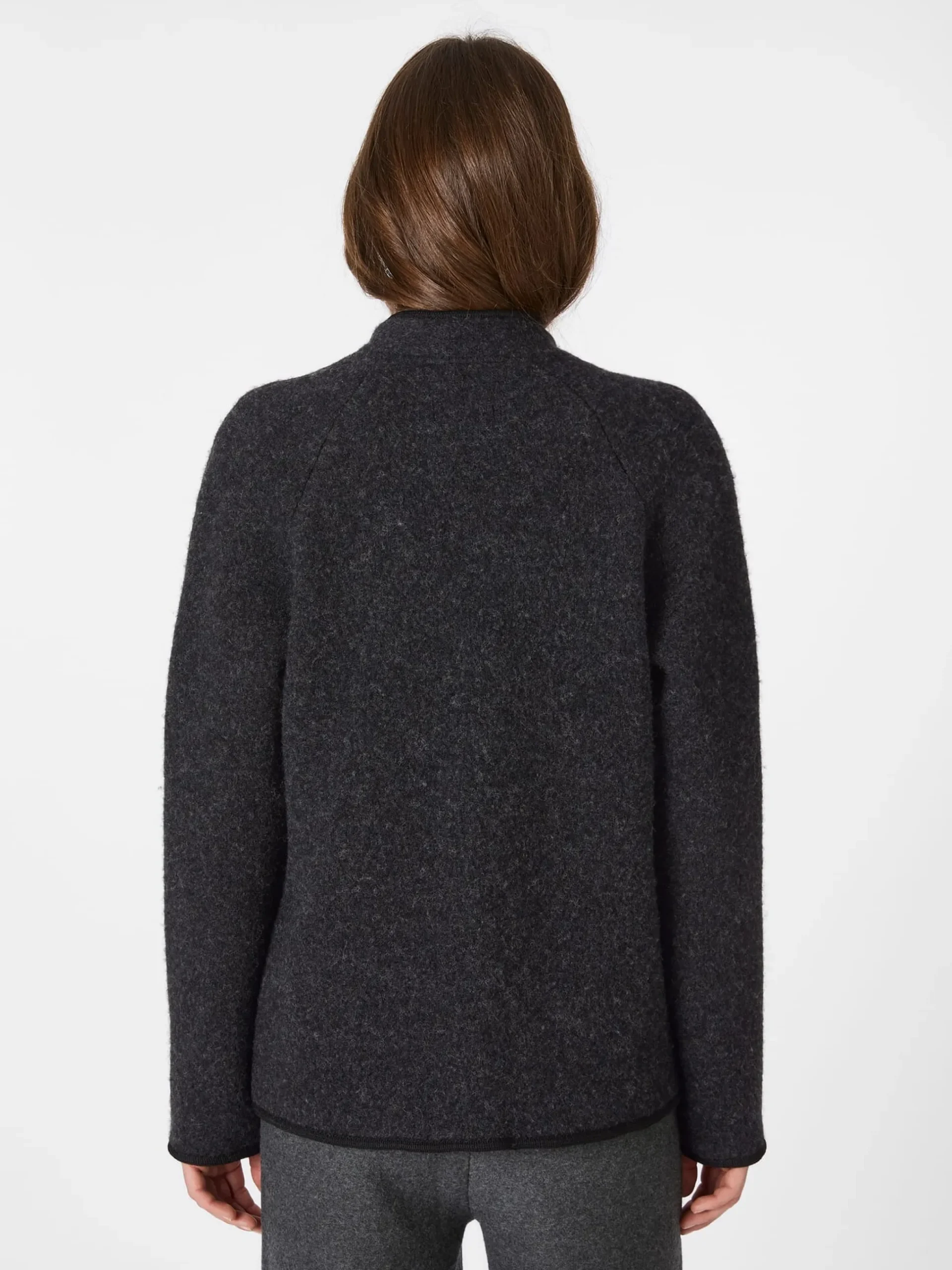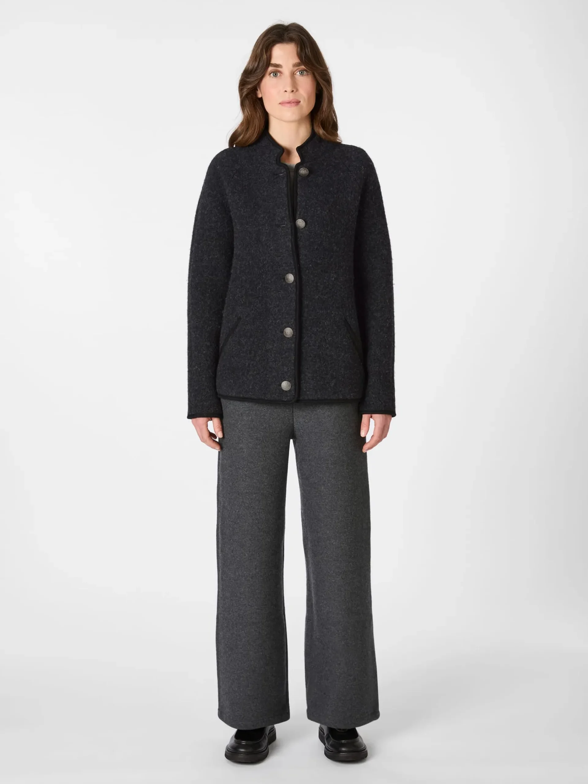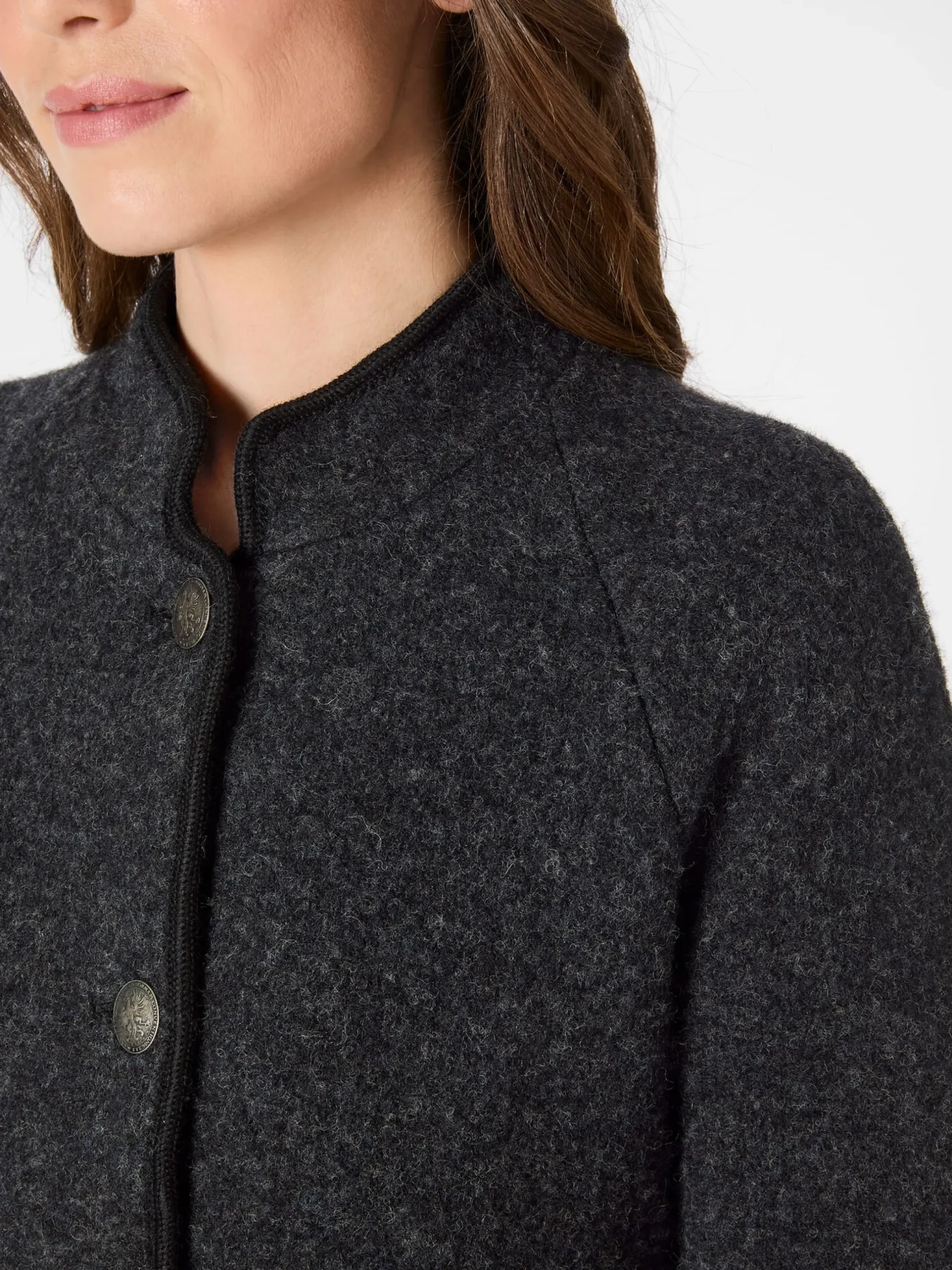 Dieser klassische Janker aus strapazierbarem Schurwollwalk bietet eine gute Wärmeisolation und ist gleichzeitig temperaturausgleichend – also perfekt für die Übergangszeit. Er lässt sich ganz traditionell mit Kleid oder Rock kombinieren, passt aber ebenso gut zu Jeans oder Chino. Der körpernahe Schnitt formt eine schöne feminine Silhouette ohne einzuengen, denn das gewalkte Gestrick ist trotz seiner Festigkeit elastisch; gleichzeitig ist es formstabil. Gearbeitet ist der Janker mit schmalem Stehkragen, schrägen Einschubtaschen und Raglannaht an den Ärmeln. Eine zusätzliche Oberarmnaht sorgt für einen guten Sitz. Eine besondere Note verleihen ihm die handgestrickten Borten an Kragen, Knopfleiste Tascheneingriffen, Rumpfsaum und Ärmelbündchen. Die Jacke wird mit stilvollen, silberfarbenen Münzknöpfen geschlossen, die nach dem Motiv des Frankfurter Talers von 1764 gestaltet sind.