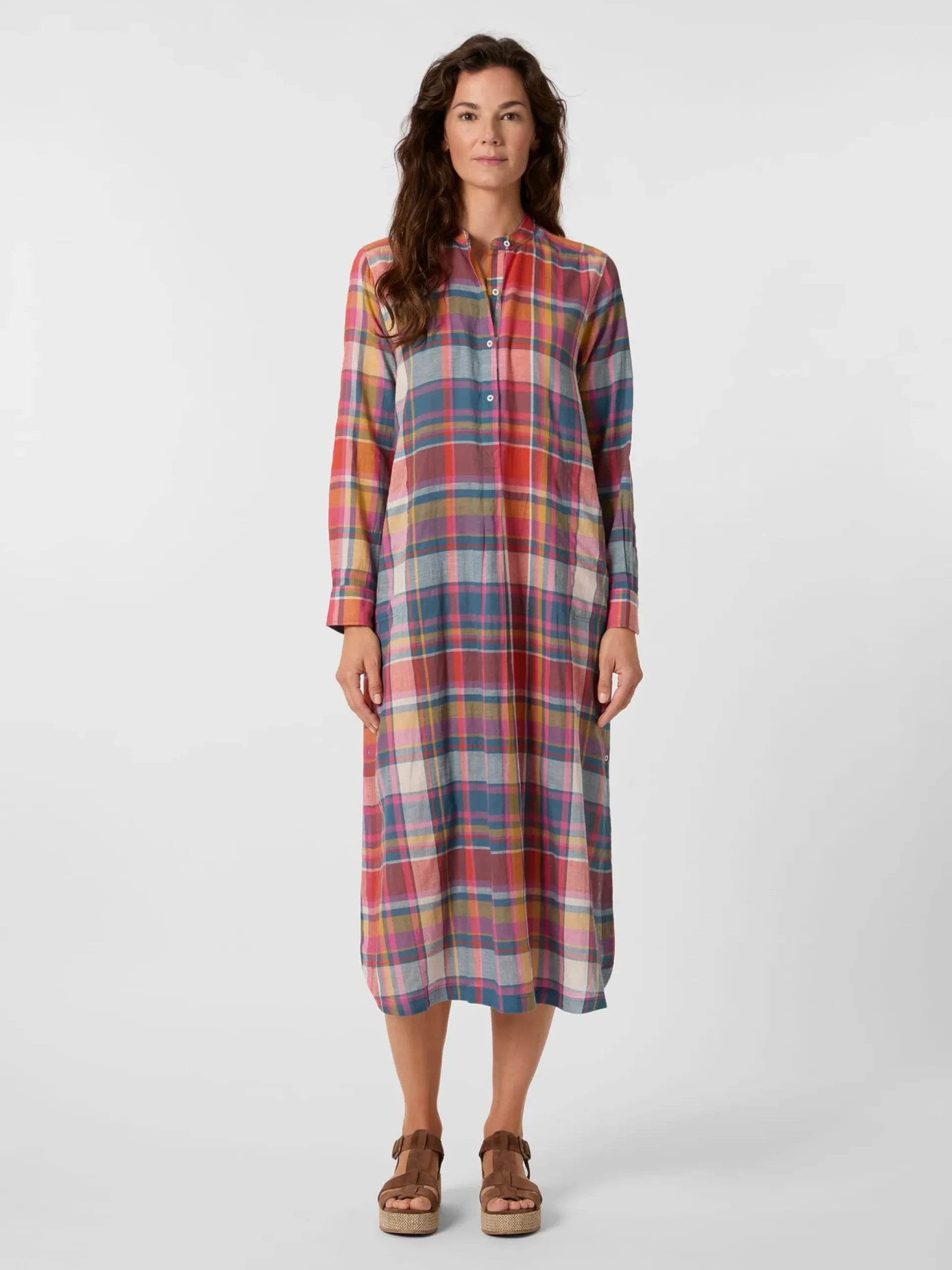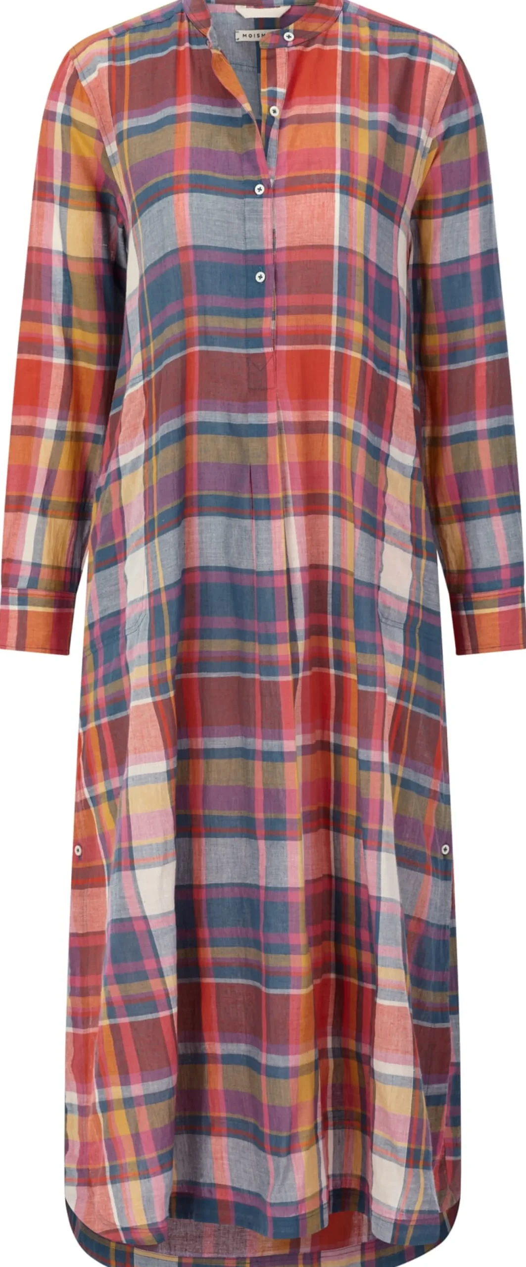 Dieses farbenfroh karierte Midikleid fertigt Moismont aus reiner, hautsympathischer Baumwolle. Das feine Gewebe hat einen weichen Fall und liegt angenehm leicht und luftig auf der Haut. Gearbeitet ist das wadenlange Kleid in weiter, figurumspielender Passform, mit Stehkragen und leicht gerundetem Saum. Der leicht ausgestellte Schnitt verleiht ihm einen dezenten Schwung. Die langen Ärmel mit knöpfbaren Manschetten können auch gut gekrempelt getragen werden. Eine gelegte Falte unter der Knopfleiste und eine Quetschfalte unter der Schulterpasse sorgen für einen guten Sitz und zusätzliche Bewegungsfreiheit, wozu auch die langen Seitenschlitze beitragen. Diese sind im oberen Bereich geknöpft und lassen sich so je nach Bedarf in der Länge anpassen. Zwei in die Seitennaht eingesetzte Taschen nehmen Kleinteile des täglichen Bedarfs auf. Ein eingesticktes, florales Moismont-Logo rundet das Design ab.