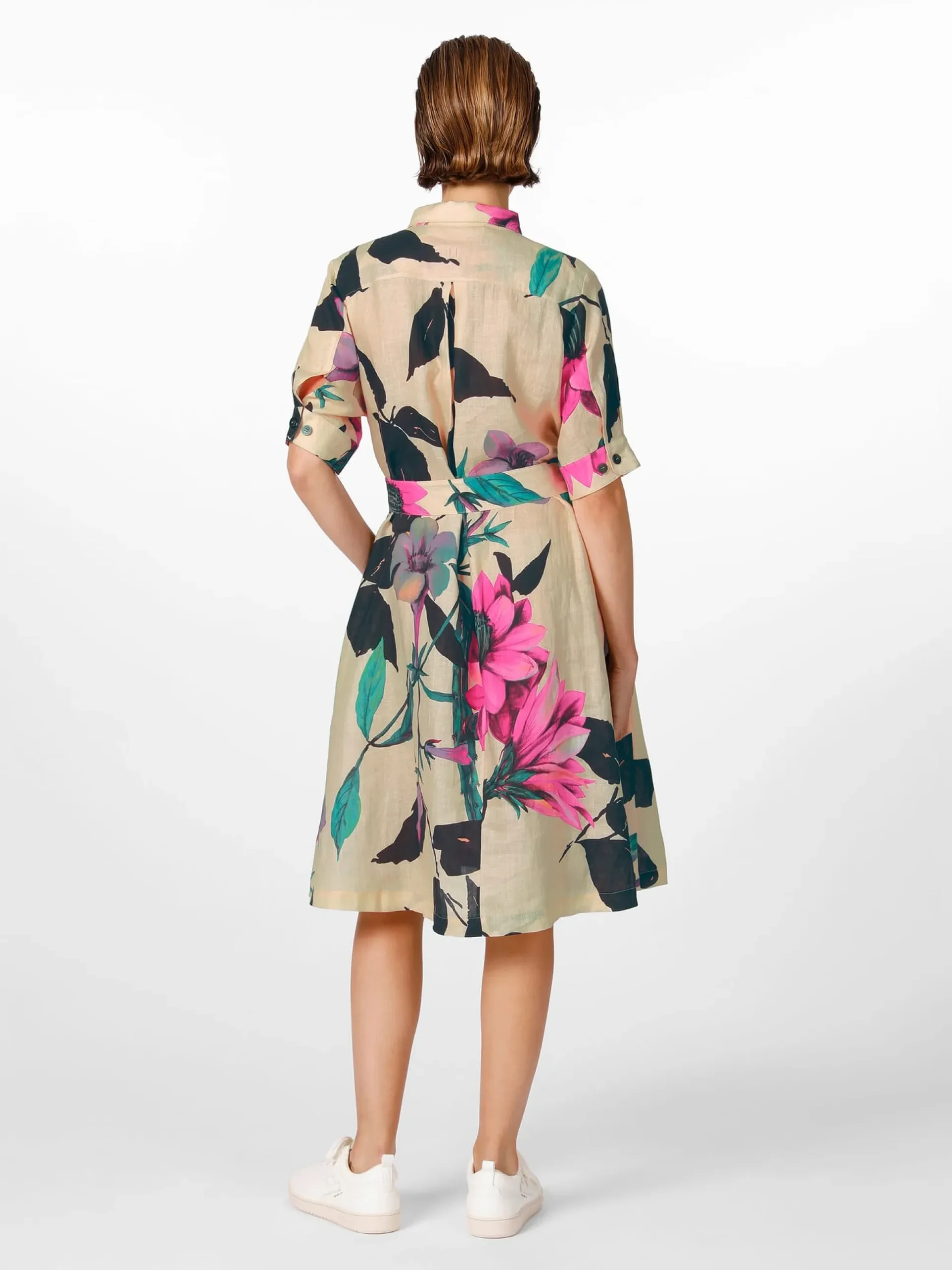 Farbenfrohes Kleid mit großblumigem Muster aus reinem Leinen – besonders an warmen Tagen ein komfortabler Begleiter. Denn Leinen kann viel Feuchtigkeit aufnehmen, ohne sich dabei feucht anzufühlen, und gibt diese auch schnell wieder nach außen ab, was einen kühlenden Effekt auf der Haut bewirkt. Das ungefütterte Kleid ist mit Hemdkragen, verdeckter Knopfleiste, zweifach geknöpften Manschetten und einem weit schwingenden Tellerrock gearbeitet. Es ist insgesamt leger geschnitten, für eine feminine Note lässt es sich aber mit dem Gürtel aus Oberstoff entsprechend taillieren. Die aufspringende Kellerfalte unter der Schulterpasse sorgt für mehr Bewegungsfreiheit. Zwei in die Seitennaht eingesetzte Taschen bieten Platz für Kleinteile des täglichen Gebrauchs.