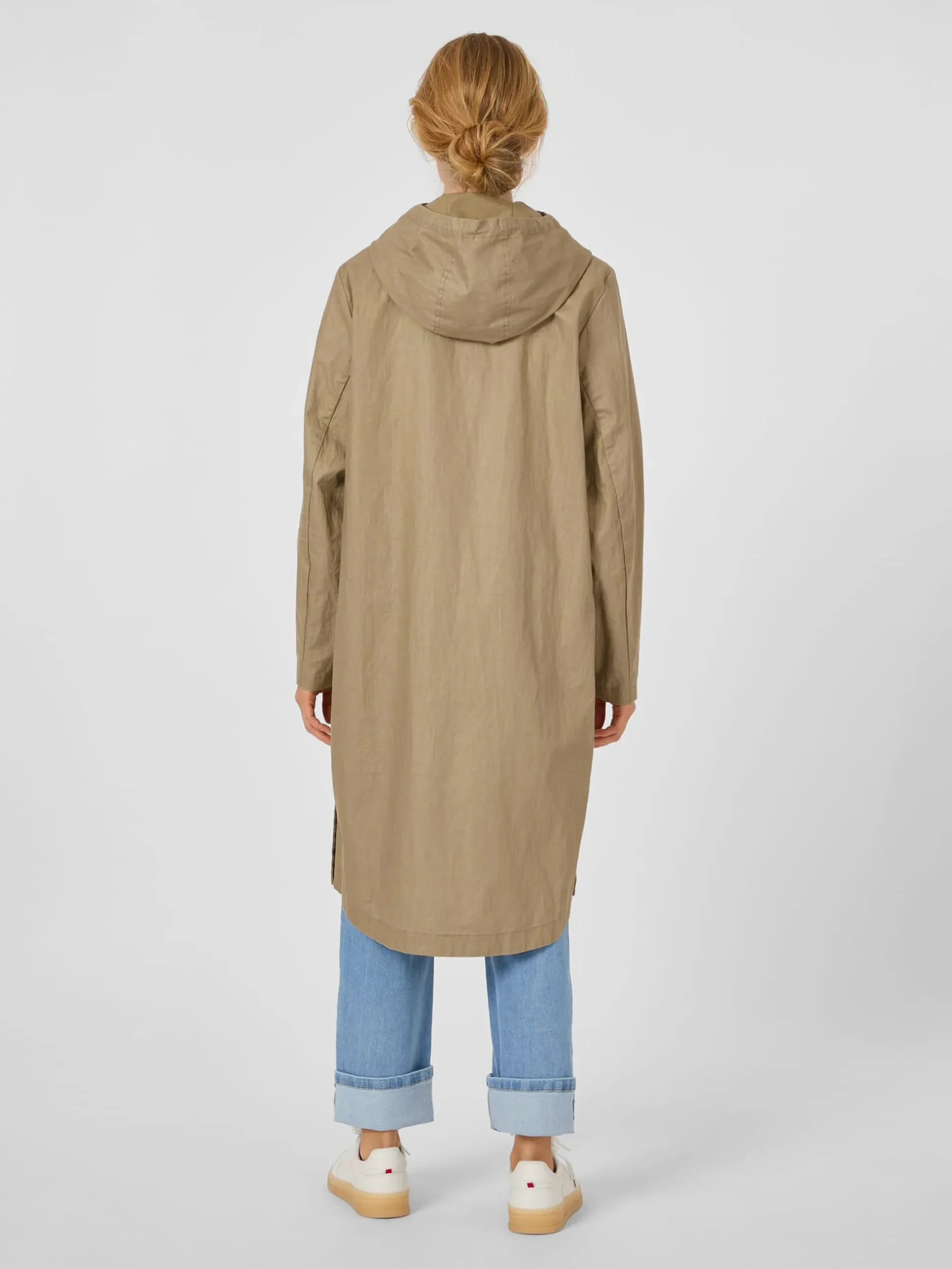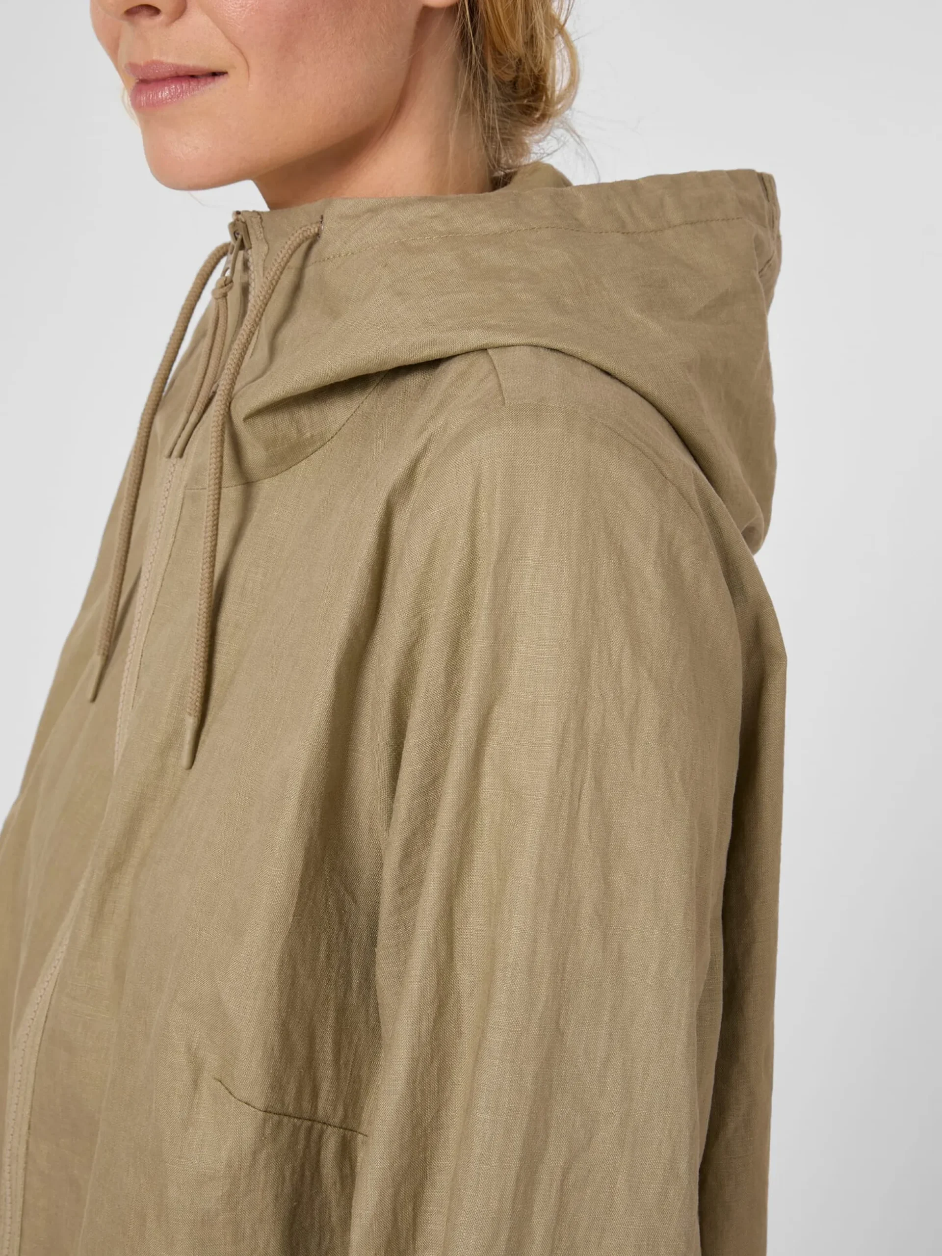 Der Oberstoff dieses Mantels besteht vollständig aus kontrolliert biologisch angebautem Leinen. Das Gewebe ist angenehm leicht und zeigt einen schönen Melangeton. Innen ist das Material mit einer PFC-freien Polyurethan-Beschichtung versehen, was das Manteltuch wind- und wasserabweisend macht. Die geräumige Kapuze ist mittels Tunnelzug in der Weite anpassbar und bietet so einen zusätzlichen Schutz vor unbeständigem Wetter. Der Zweiwegereißverschluss lässt sich hoch bis zum Kinn schließen und die Ärmelabschlüsse können dank eines Druckknopfs weit oder eng anliegend getragen werden. Zwei Seitentaschen mit Druckknöpfen und eine Innentasche mit Reißverschluss nehmen Kleinteile des täglichen Bedarfs auf. Die legere Passform sorgt zusammen mit den langen Seitenschlitzen, die mit Druckknöpfen zu schließen sind, für viel Bewegungsfreiheit. Belüftungsösen unter den Achseln erhöhen den Tragekomfort. Damit ist der Mantel nicht nur alltagstauglich, sondern auch gut für sportliche Aktivitäten wie Wandern oder Fahrradfahren geeignet.