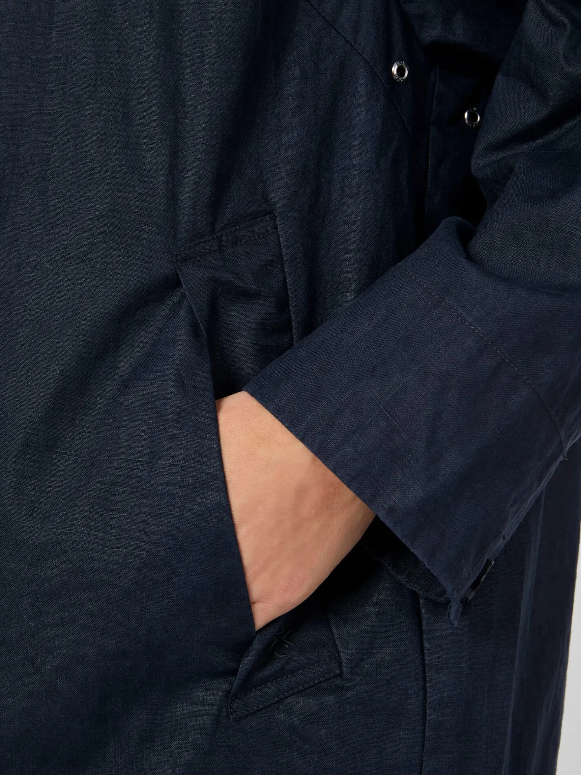 100% Leinen. Steinnussknöpfe. Ösen aus Metall. Hergestellt in China. Rückenlänge bei Größe M = 107,5 cm.