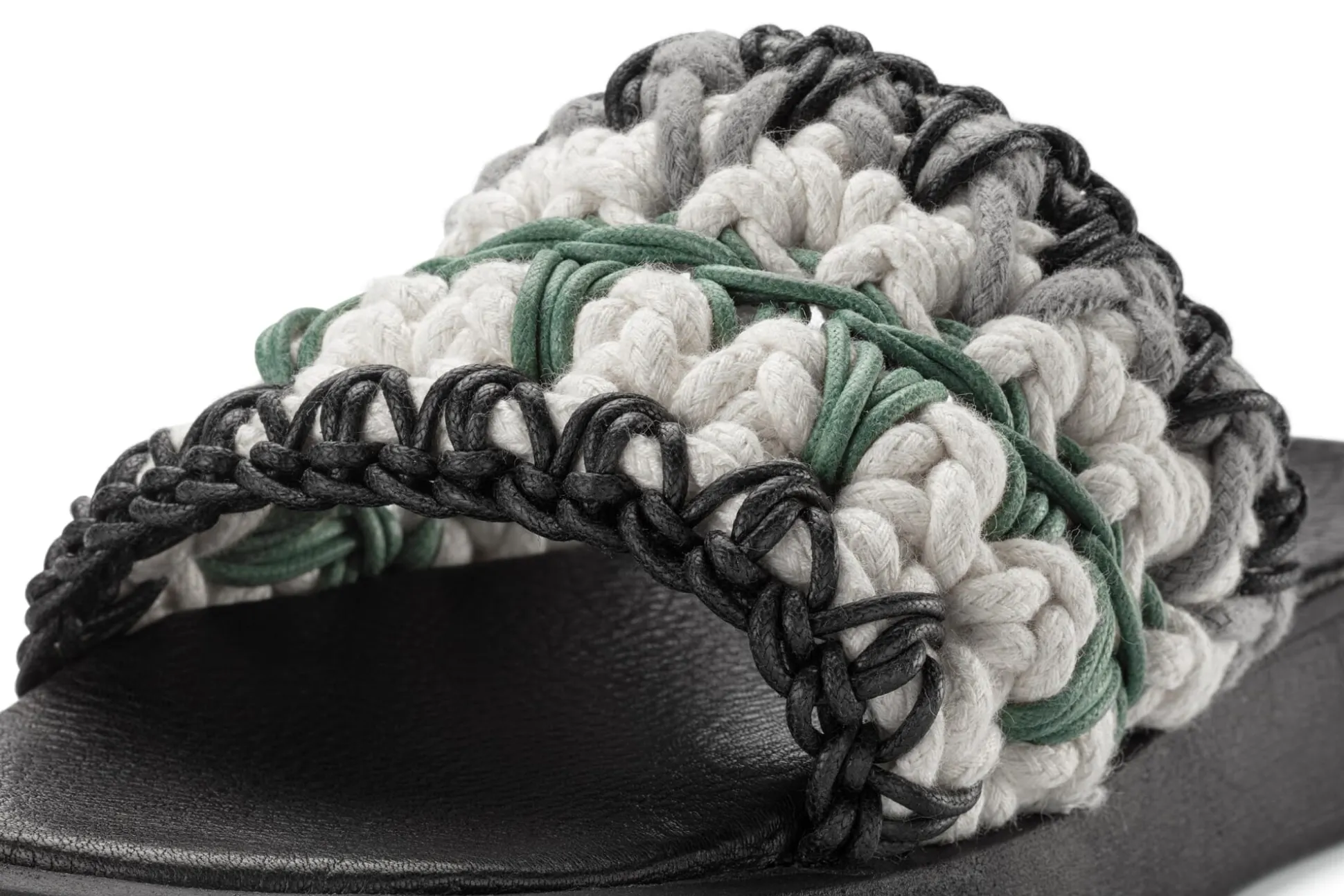 Die Besonderheit dieser Pantolette ist das Band, das um den Fußrücken geführt wird: Es ist aus italienischen Schnürsenkeln gehäkelt, die aus reiner, hautsympathischer Baumwolle bestehen. Durch das Maschenwerk ist es einerseits luftig und andererseits passt es sich perfekt der individuellen Fußform an. Die starke, leicht geriffelte Sohle aus thermoplastischem Gummi bietet nicht nur Grip auf vielen Untergründen, sie wirkt auch trittdämpfend, was die Pantolette in Verbindung mit der gepolsterten Lederdecksohle sehr bequem macht.
