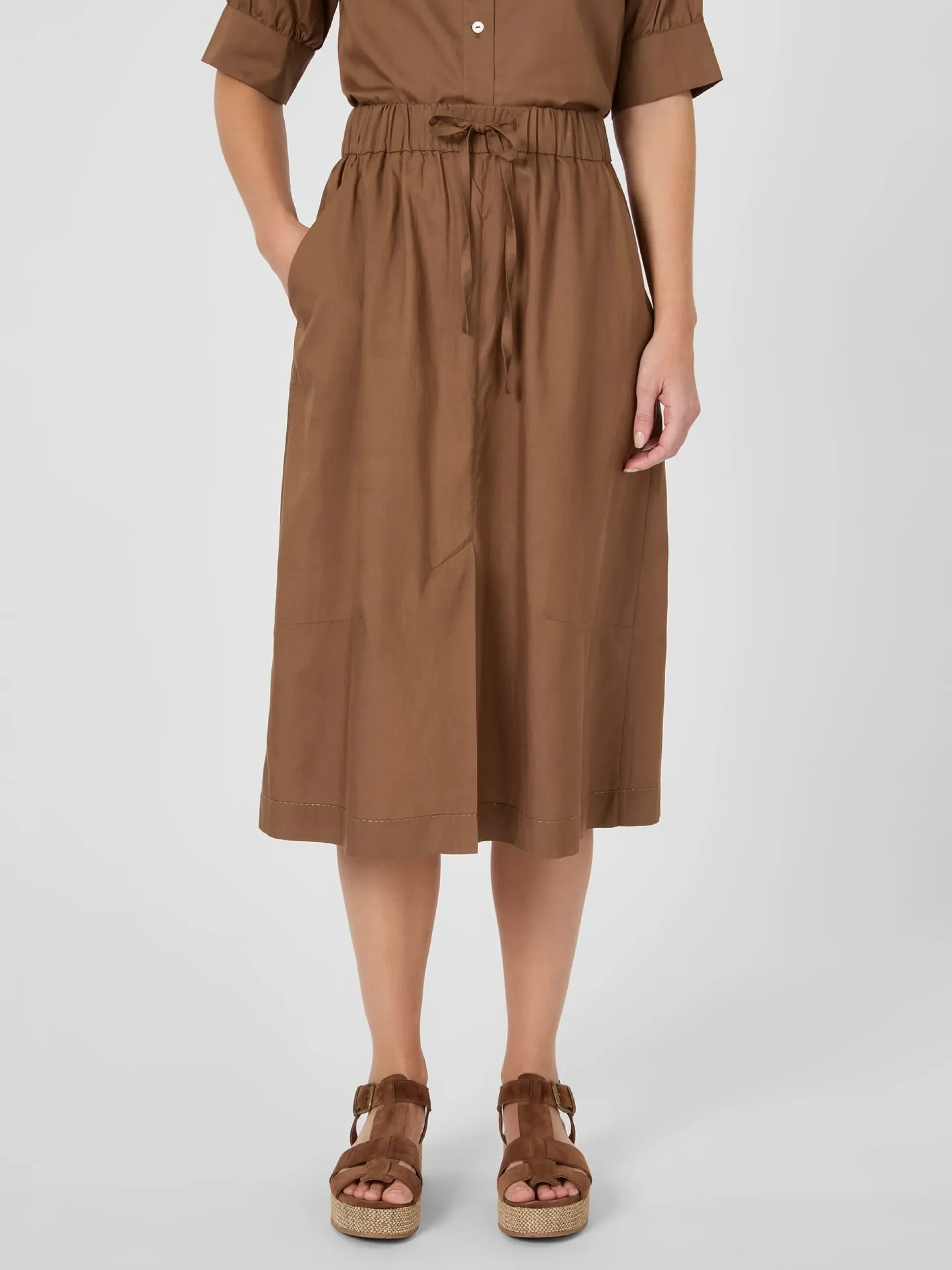 Lyocell (TENCEL™) und Baumwolle vereinen sich bei diesem überknielangen Rock zu einem leichten, weich auf der Haut liegendem und dennoch strapazierbarem Gewebe. Es zeigt einen zarten Glanz, ist atmungsaktiv und verleiht dem Rock einen fließenden Fall. Die lockere Passform in leichter A-Line erhöht den Tragekomfort, wozu auch der elastische Bund mit Bindeband beiträgt. Für noch mehr Bewegungsfreiheit ist der Rock vorn mit einem langen Gehschlitz gearbeitet. Zwei Seitentaschen nehmen Kleinteile des täglichen Bedarfs auf. Die große aufgesetzte Gesäßtasche schenkt dem eleganten Rock eine Spur Lässigkeit.