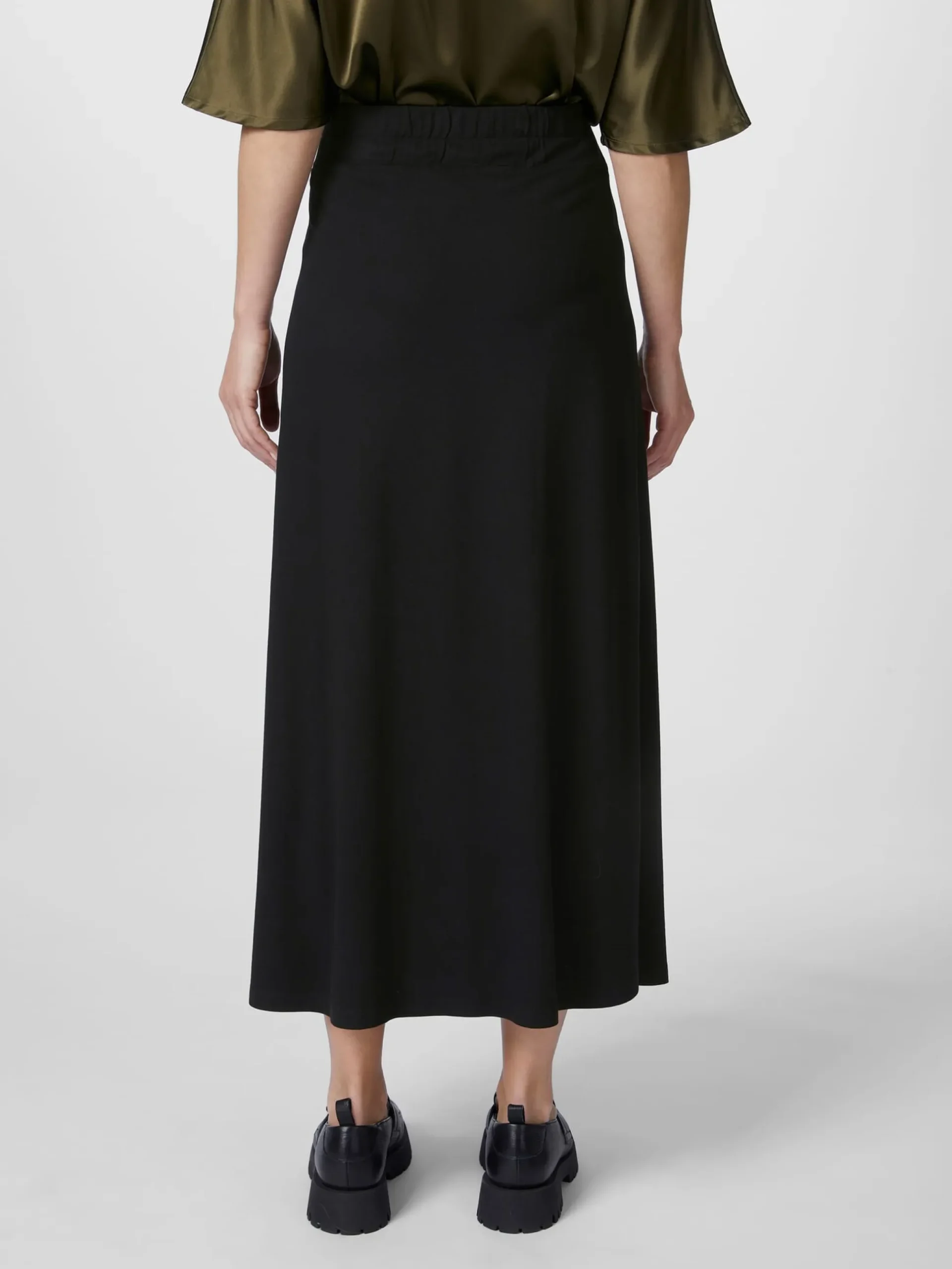 95% Viskose (LENZING™ ECOVERO™), 5% Elastan. Teilgummibund. Hergestellt in Griechenland. Rocklänge bei Größe M = 91 cm.