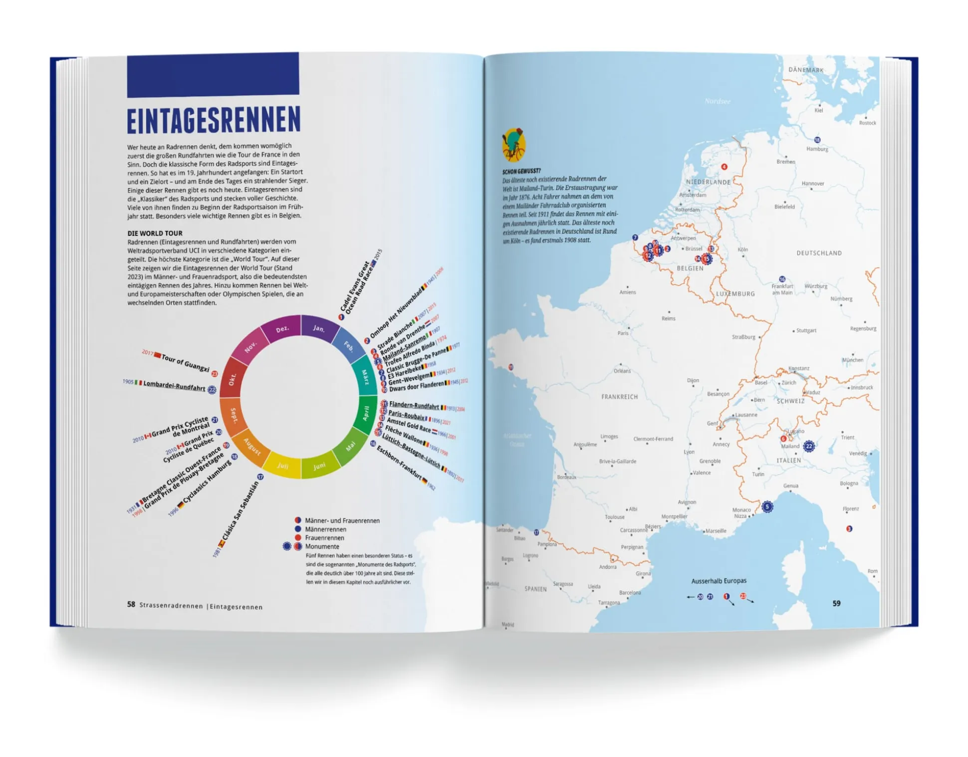 Das Fahrrad ist über 200 Jahre alt – und heute wichtiger denn je. Es ist Begleiter in allen Lebenslagen, mechanisches Wunderwerk, Sportgerät und Freiheitsmaschine. Und ein Schlüssel für lebenswerte Städte der Zukunft. Das Fahrradbuch vermittelt in über 1000 Grafiken, Karten und Illustrationen umfassendes Wissen über das Fahrrad. Es erzählt von der Laufmaschine, dem ultraleichten Carbon-Rennrad oder dem E-Lastenrad. Vom Glücksgefühl auf zwei Rädern und dem gefürchteten Hungerast. Von den schönsten Radreisen, mythischen Bergen des Radsports und Legenden der Tour de France. Von autofreier Mobilität, wachsender Fahrradkultur – und den schönsten Songs und Filmen übers Radfahren. Ein Buch zum Stöbern und Entdecken für alle, die ihr Fahrrad lieben.