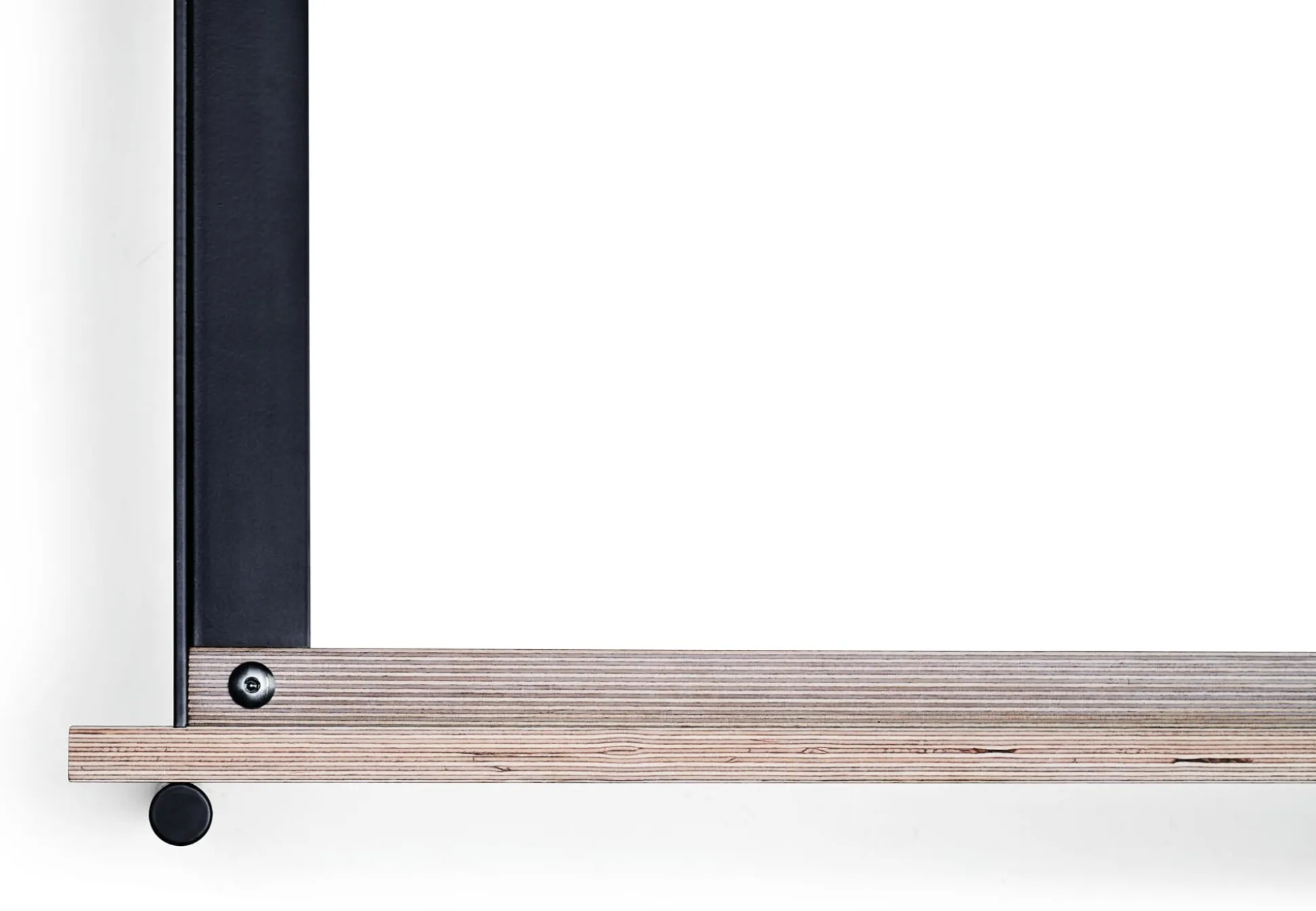 Material: Birke Multiplex (Herkunft: Osteuropa), 18 mm, beidseitig schwarz phenolharzbeschichtet bzw. beidseitig weiß melaminharzbeschichtet (bei den aus dem Karosseriebau stammenden Multiplexplatten sind Farb- und Strukturunterschiede sowie vereinzelt kleine Druckstellen möglich), Gestell: Stahlblech und Stahlrohr, pulverbeschichtet (Lichtgrau RAL 7035 bzw. Schwarzgrau RAL 7021)