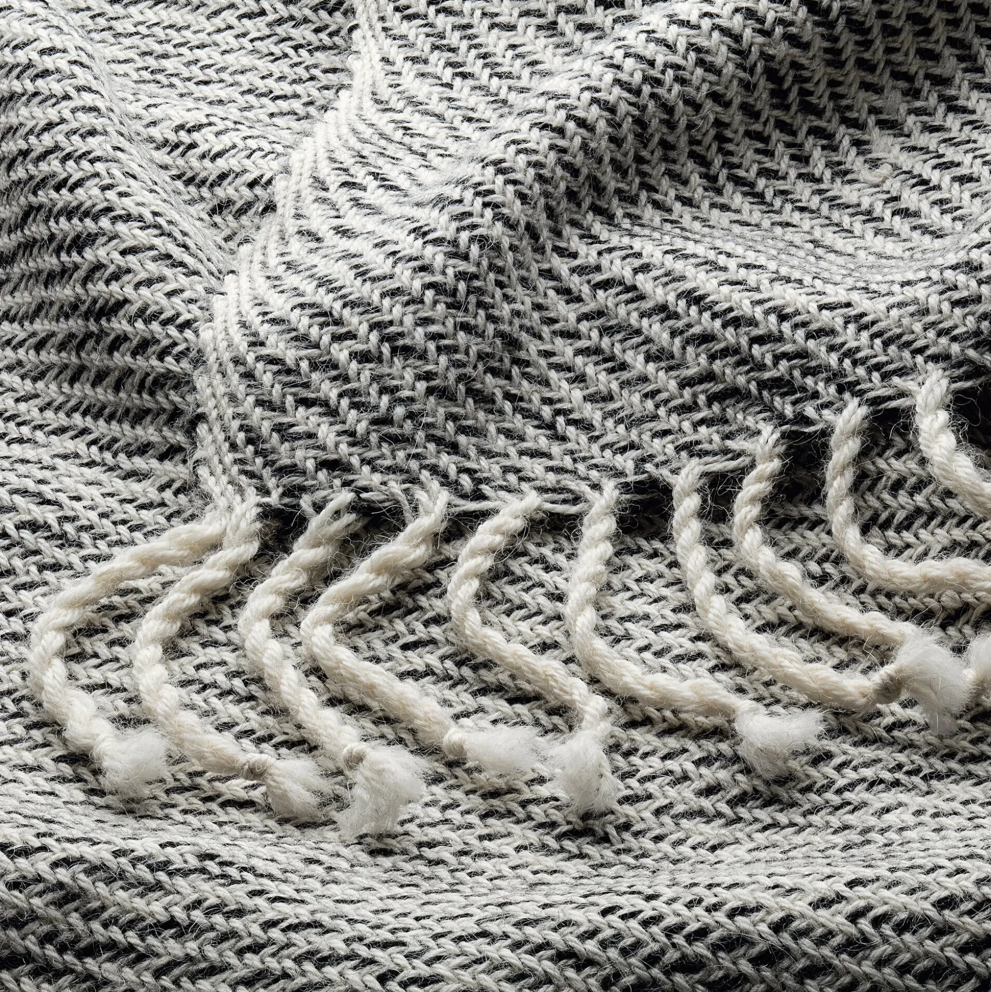 Aus weichem, leichtem Babyalpaka ist diese Decke gewebt. Babyalpaka stammt häufig von den Jungtieren aus der ersten Schur, aber auch das Haar der adulten Tiere wird Babyalpaka genannt, wenn die Faserfeinheit zwischen 19 und 21,9 Mikrometern liegt, es also äußerst fein ist. Im Schuss werden hier zwei Fäden, einer in Schwarz, der andere in Weiß, eingesetzt, die sich beim Weben leicht verdrillen und so der Decke die lebendige Oberfläche verleihen.