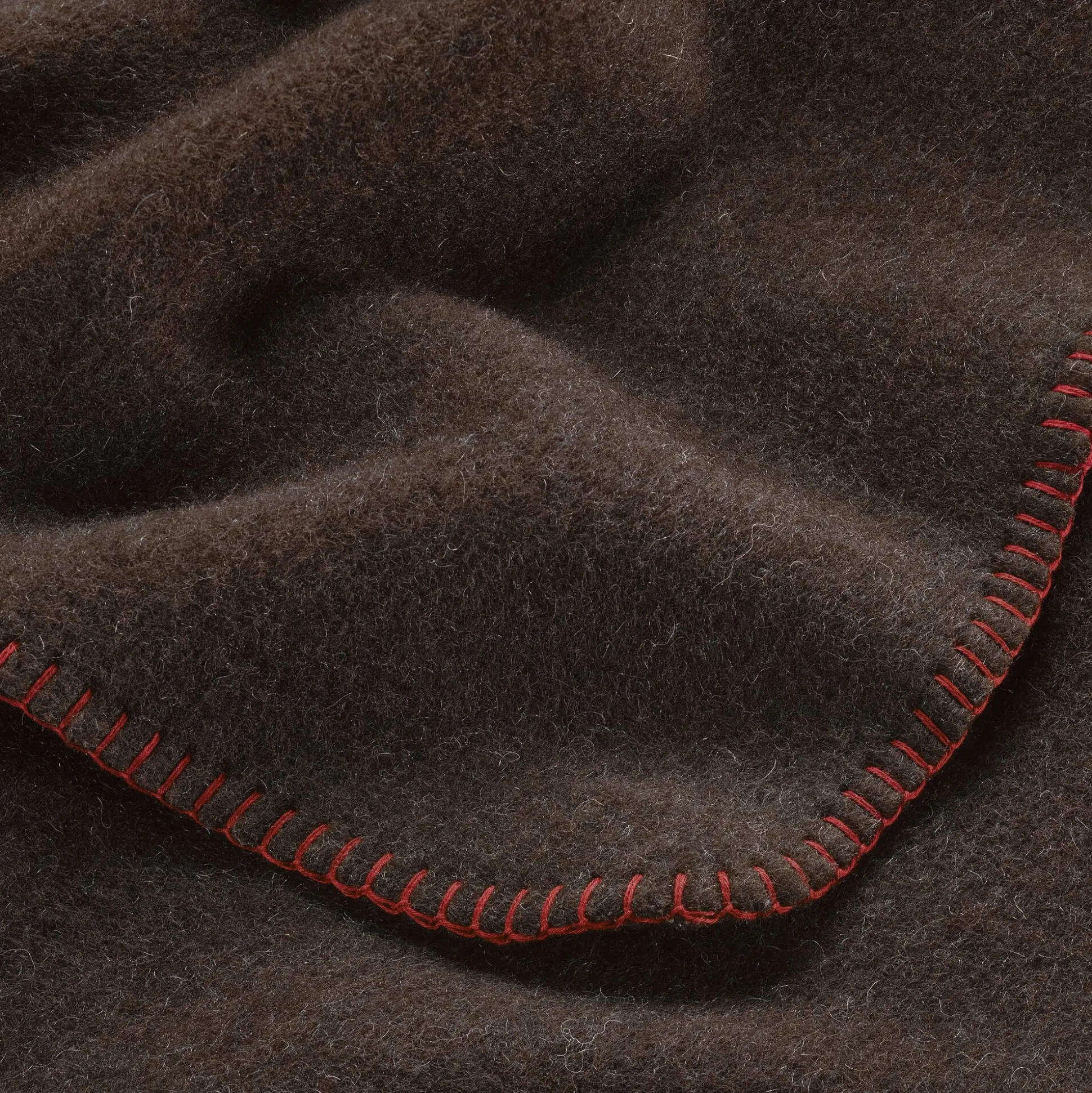 Diese Decke ist aus reinem, naturbelassenem Yakhaar gewebt. Ungefärbt und ungebleicht zeigt das Haar seine natürliche braune Farbe und ist mit einer Faserfeinheit von 18,5 bis 21 Mikron überaus fein und weich. Auch hier werden nach dem Weben beide Seiten mechanisch angeraut und die Kanten mit (hier rotem) Baumwollgarn umkettelt. Gefertigt wird die Yakhaardecke in Deutschland.