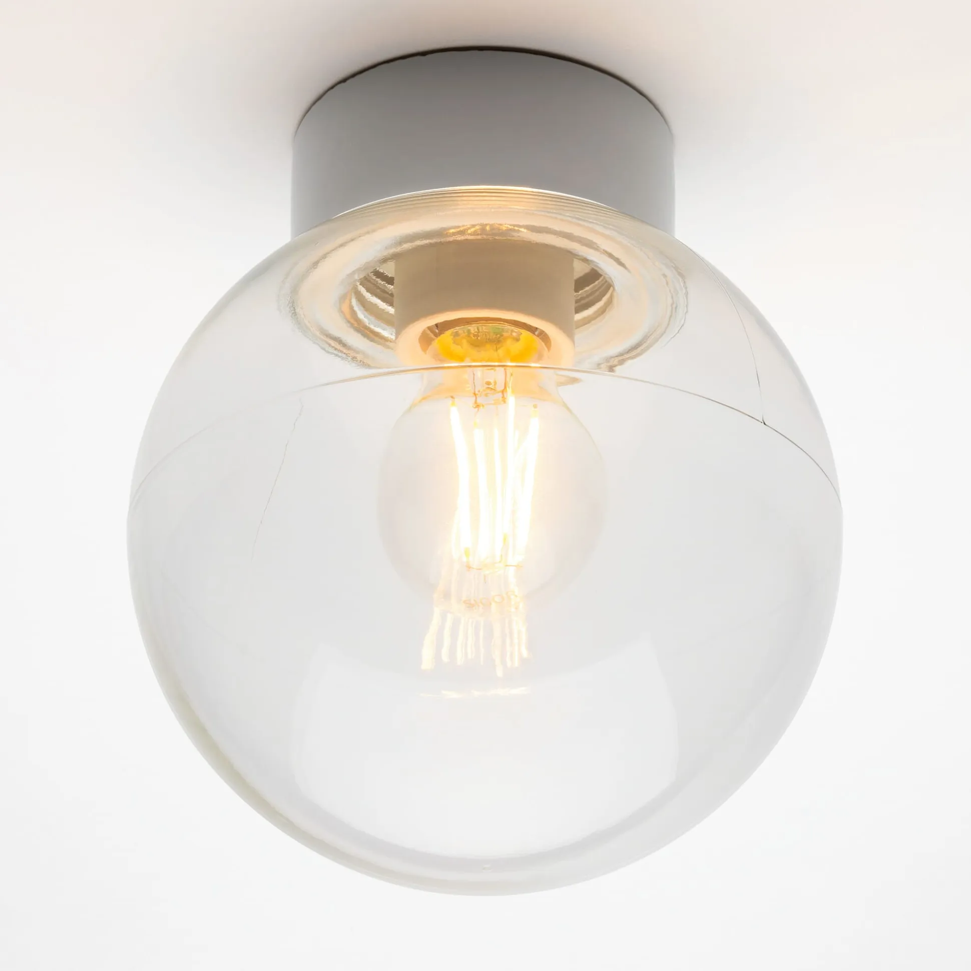 Weißer Porzellansockel, Ø 10 cm. Kuppel aus mundgeblasenem Klarglas, Ø 18 cm. Kunststoffdichtung. Höhe 20,5 cm. Gewicht 1,1 kg. Keramikfassung E27 (max. 75 W). Lieferung ohne Leuchtmittel.