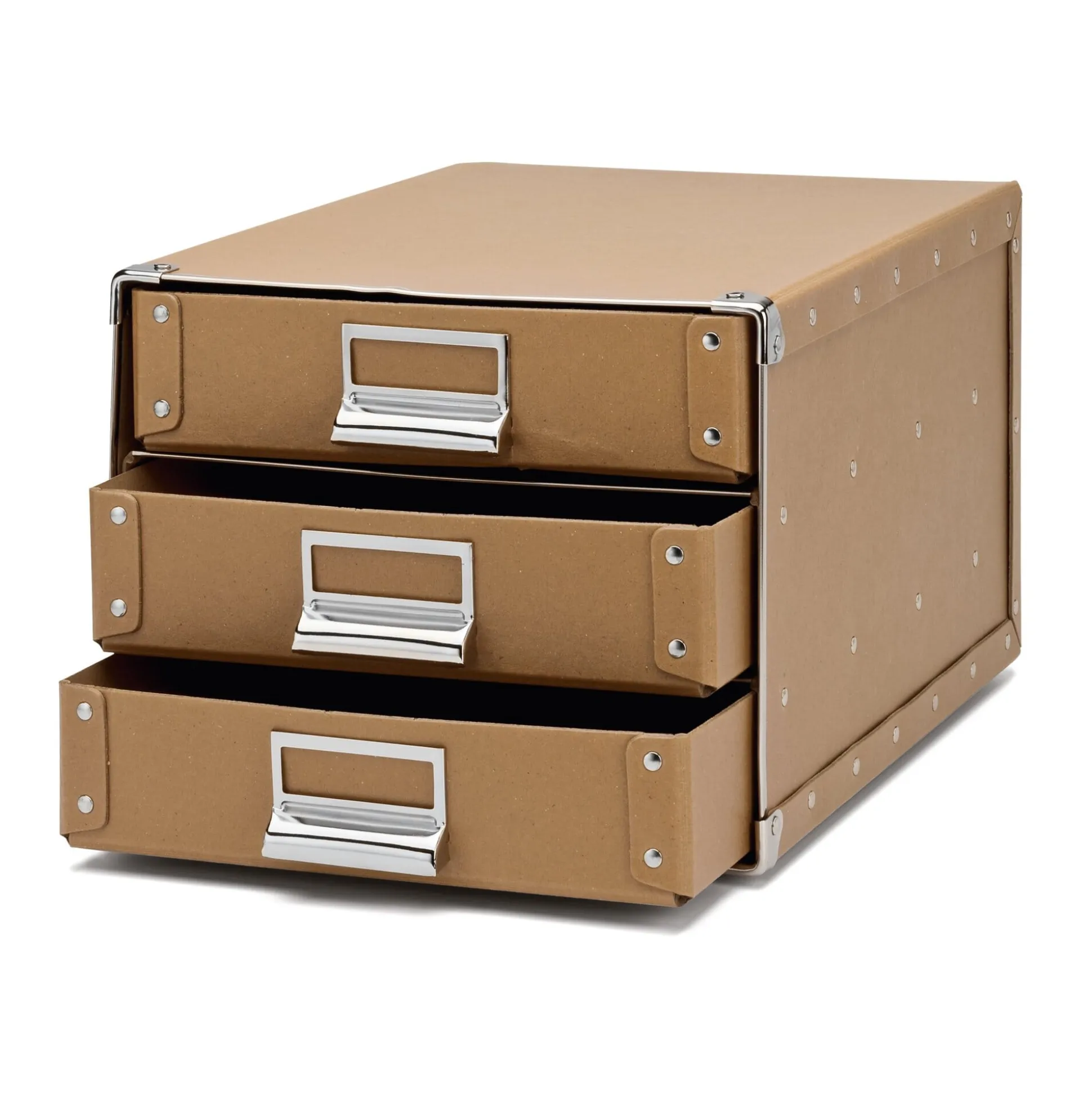 Aus genieteter Pappe mit 4 gerundeten Stahlfüßen. 3 Schübe mit einem Innenmaß von 5,5 × 22,5 × 32,5 cm. H 20 × B 24,5 × T 33 cm. Gewicht 1,2 kg. Erhältlich in 2 Farben.