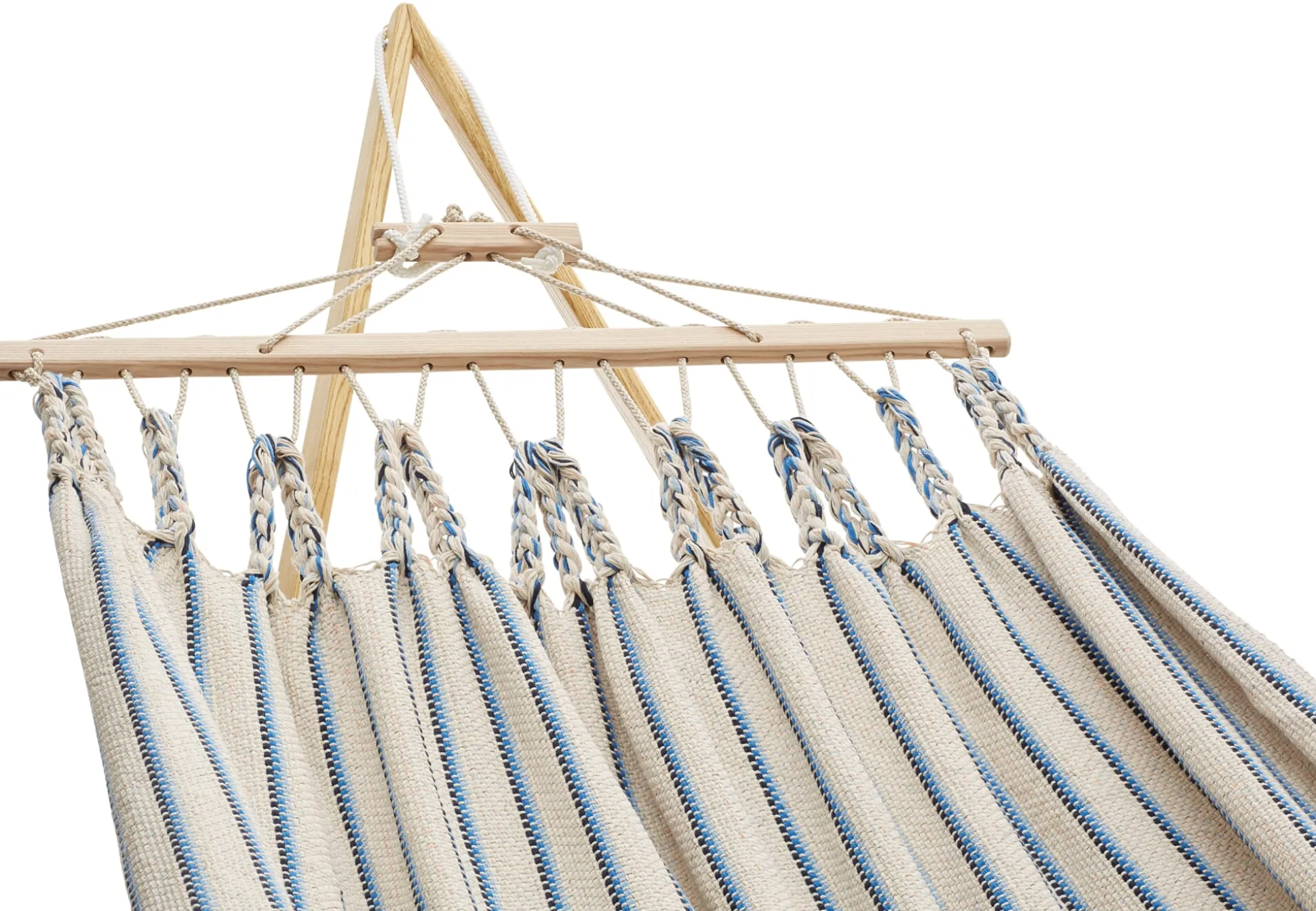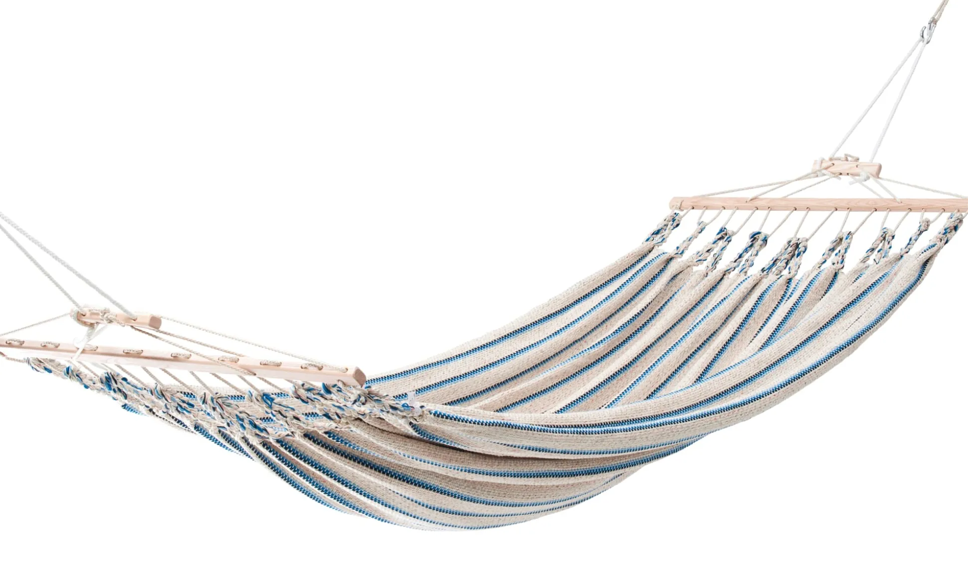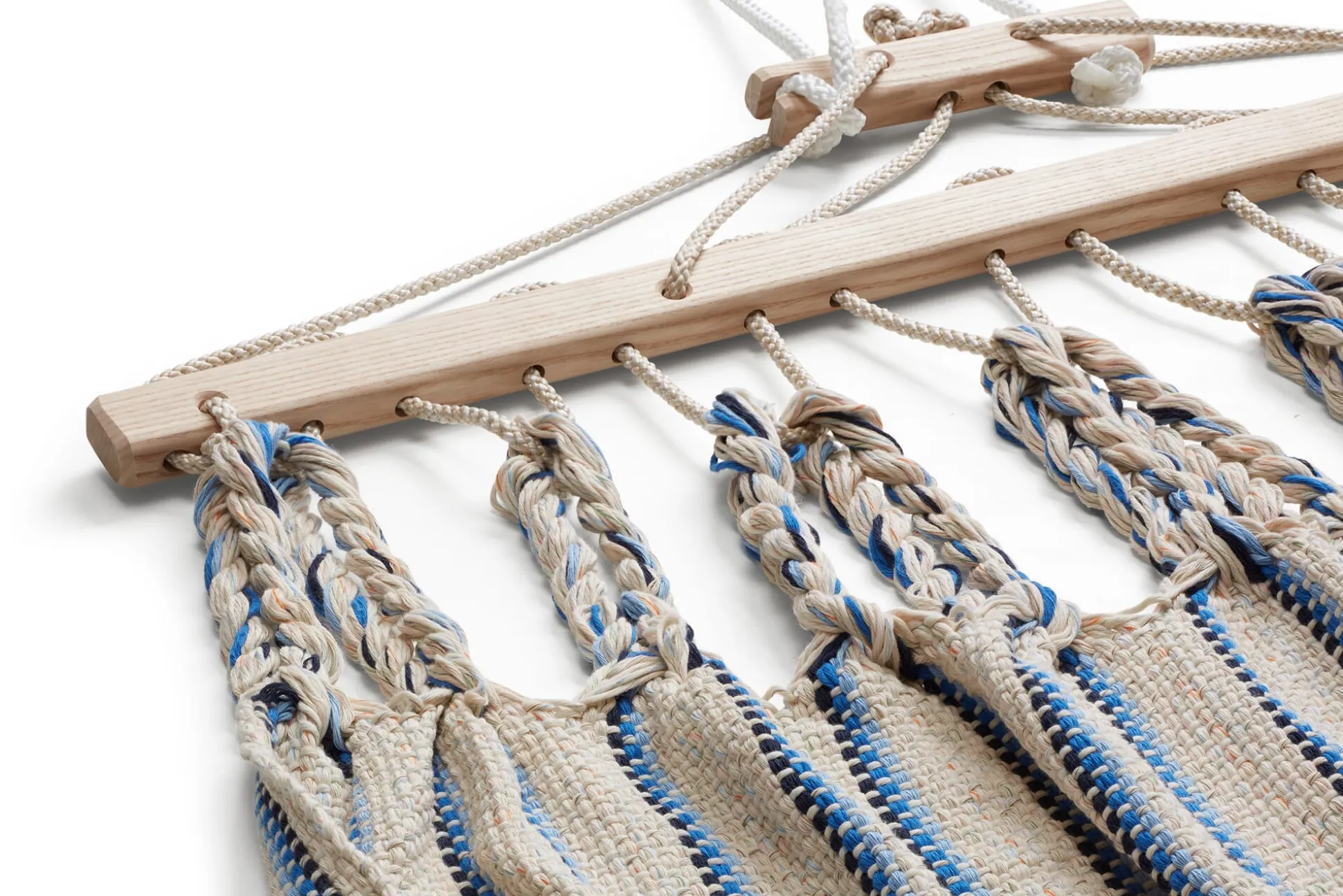 Die Hängematten werden in einer eigens entwickelten Endloswebtechnik gearbeitet, sie sind nicht nur von einer Materialopulenz, die man schon beim ersten Griff spürt – sie sind vor allem auch außerordentlich reißfest. Ein verstellbarer hölzerner Fixierstab verhindert das Zusammenrutschen der Matte, eine Spannvorrichtung ermöglicht Längenänderungen. Einzig beim Tragseil verwendet der Hersteller ein synthetisches Material, eine UV- und witterungsbeständige Polyestermischung, die die langfristige Belastbarkeit der Hängematte gewährleistet.