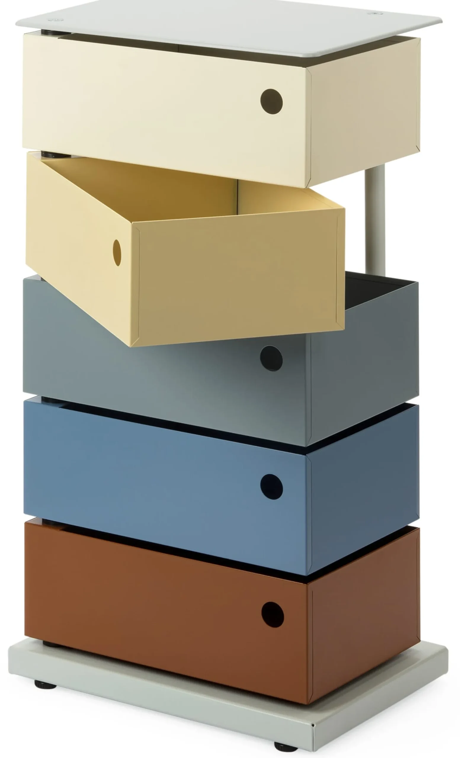 Im englischen Sprachraum „Pivot Cabinet“ genannt – „pivot“ bedeutet so viel wie „Drehgelenk“ oder „Schwenkachse“ –, verweist diese Bezeichnung auf das wesentliche konstruktive Element des Containers: Die einzelnen Laden werden an einer Achse aufgeschwenkt, nicht aufgezogen oder -geklappt, wie üblich. Diese Konstruktionsidee wurde unter anderem durch Joe Colombos 1970 entwickelten Rollcontainer „Boby“ bekannt. Der italienische Architekt war zugleich einer der führenden futuristischen Industriedesigner der 1960er Jahre, einer Zeit der Aufbruchstimmung und Zukunftsvisionen, die – folgt man beispielsweise Herbert Marcuses Gedankengang – den Weg aus dem Reich der Notwendigkeit in das Reich der Freiheit zu bahnen suchten. Entwürfe wie Verner Pantons Freischwinger „Panton Chair“, Olivier Mourgues Sessel „Djinn“, der in „2001 – Odyssee im Weltraum“ das Interieur der Raumstation schmückte, und Colombos „Tube Chair“ wurden zu Ikonen. Colombos „dynamische Möbelstücke“ zielten dabei stets auch auf Multifunktionalität ab.