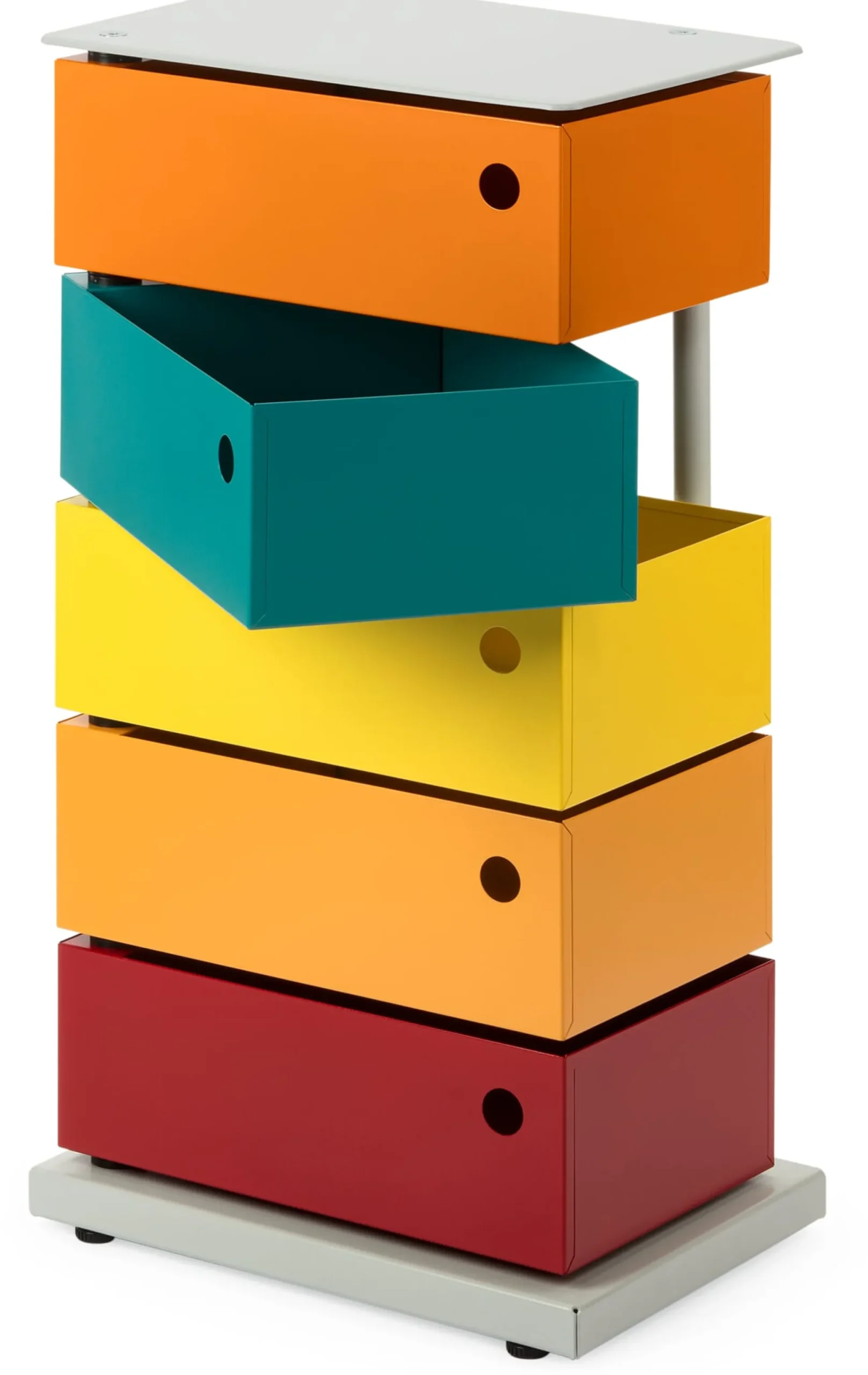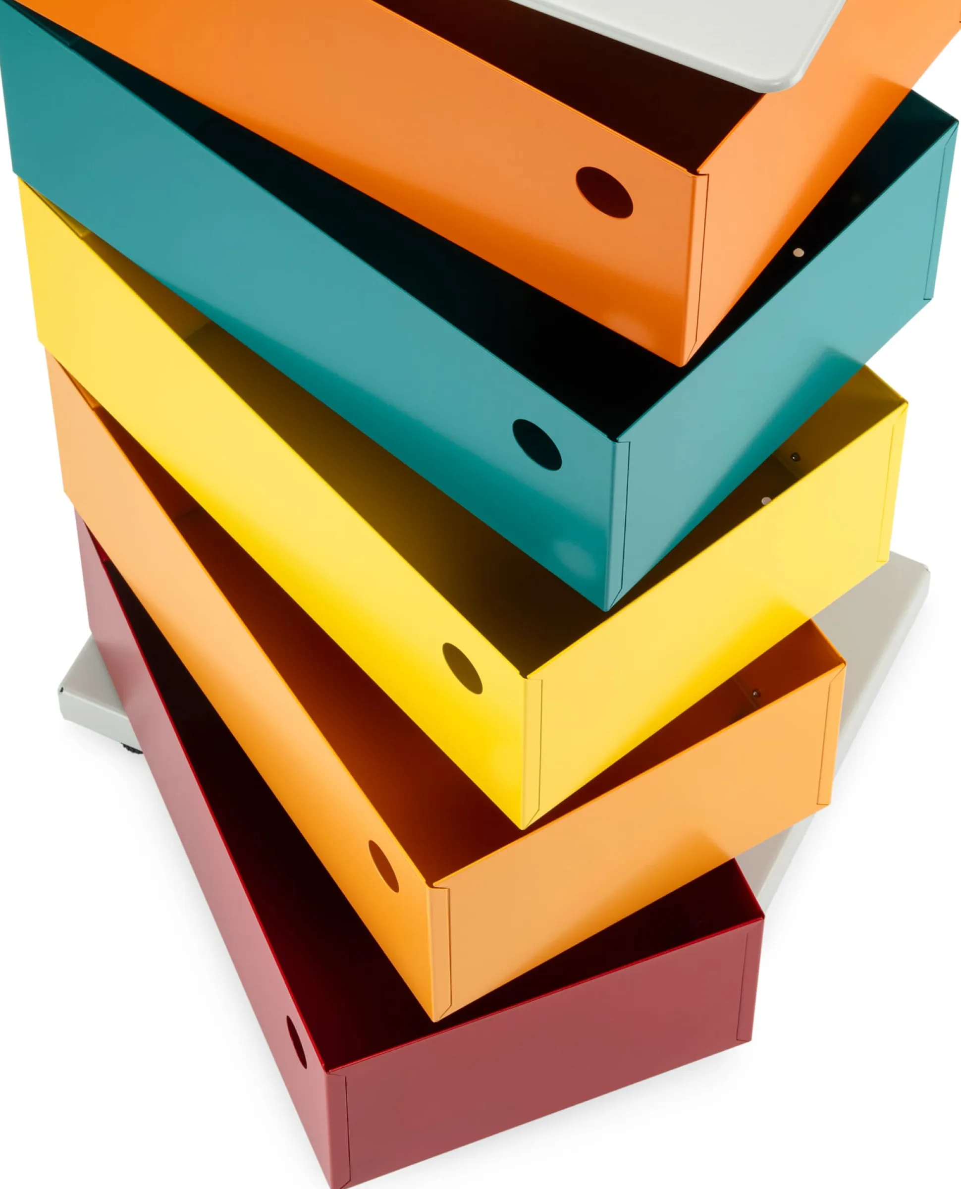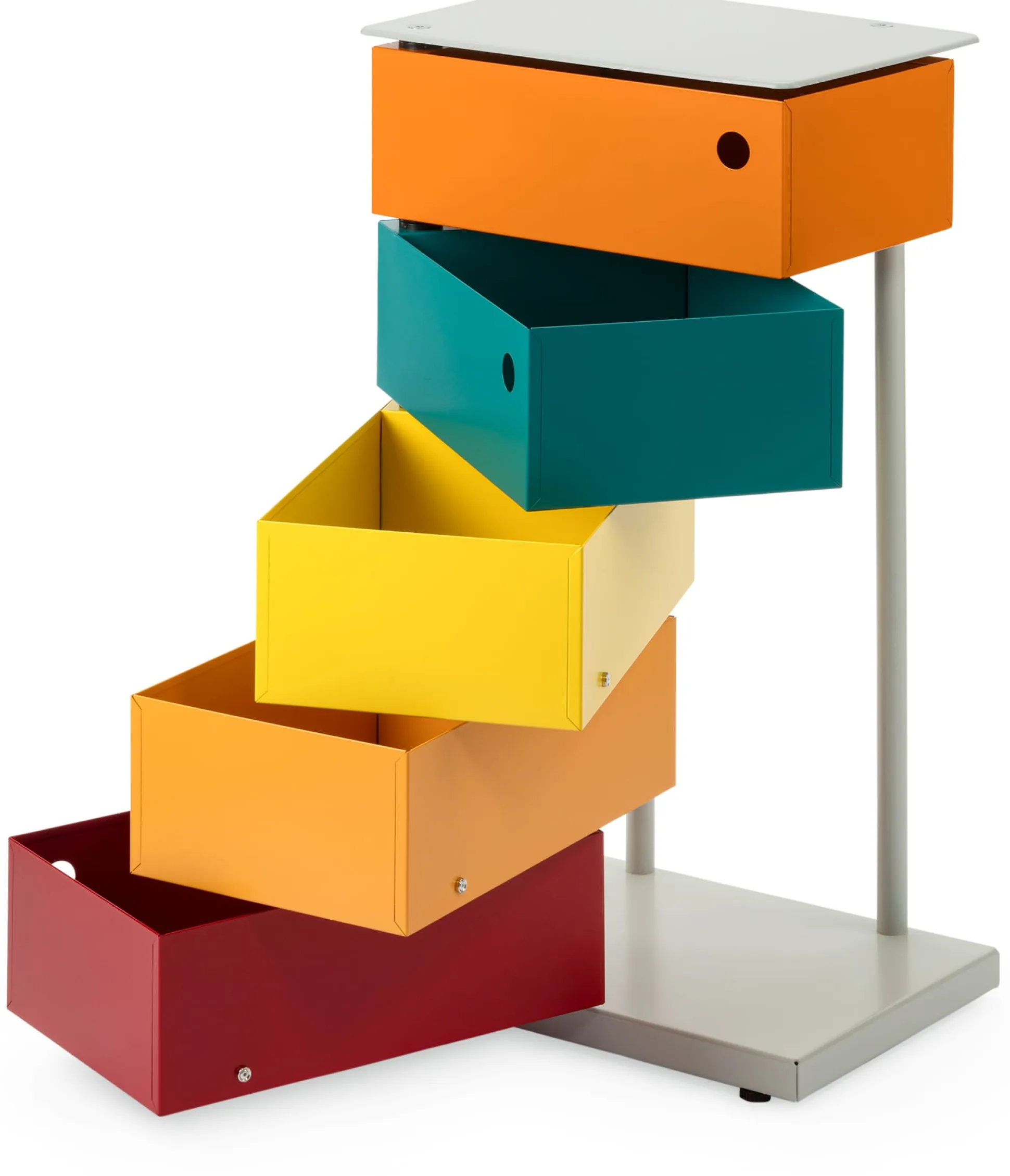 Im englischen Sprachraum „Pivot Cabinet“ genannt – „pivot“ bedeutet so viel wie „Drehgelenk“ oder „Schwenkachse“ –, verweist diese Bezeichnung auf das wesentliche konstruktive Element des Containers: Die einzelnen Laden werden an einer Achse aufgeschwenkt, nicht aufgezogen oder -geklappt, wie üblich. Diese Konstruktionsidee wurde unter anderem durch Joe Colombos 1970 entwickelten Rollcontainer „Boby“ bekannt. Der italienische Architekt war zugleich einer der führenden futuristischen Industriedesigner der 1960er Jahre, einer Zeit der Aufbruchstimmung und Zukunftsvisionen, die – folgt man beispielsweise Herbert Marcuses Gedankengang – den Weg aus dem Reich der Notwendigkeit in das Reich der Freiheit zu bahnen suchten. Entwürfe wie Verner Pantons Freischwinger „Panton Chair“, Olivier Mourgues Sessel „Djinn“, der in „2001 – Odyssee im Weltraum“ das Interieur der Raumstation schmückte, und Colombos „Tube Chair“ wurden zu Ikonen. Colombos „dynamische Möbelstücke“ zielten dabei stets auch auf Multifunktionalität ab.