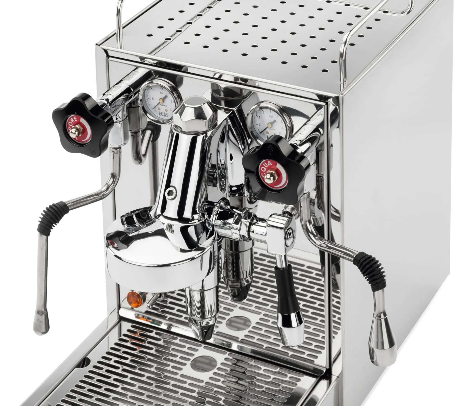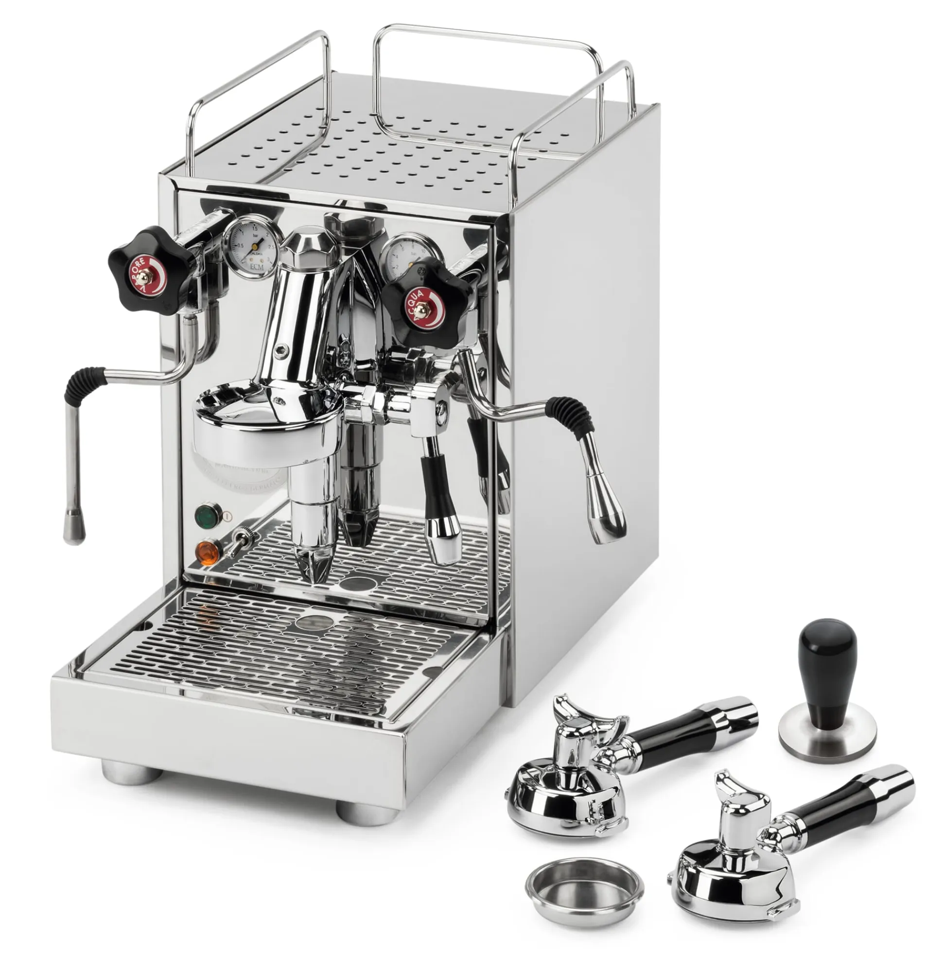 Zweikreis-Maschine mit Vibrationspumpe und Thermo-Siphon-System. ECM-E61-Brühgruppe. Gehäuse und Kessel (Volumen 2,2l) aus Edelstahl, außen hochglanzpoliert; drei Kesseltemperaturen sind voreingestellt (120°C, 124°C, 128°C). Frischwassertank (Volumen 2,8 l) aus Kunststoff. Drehventile.