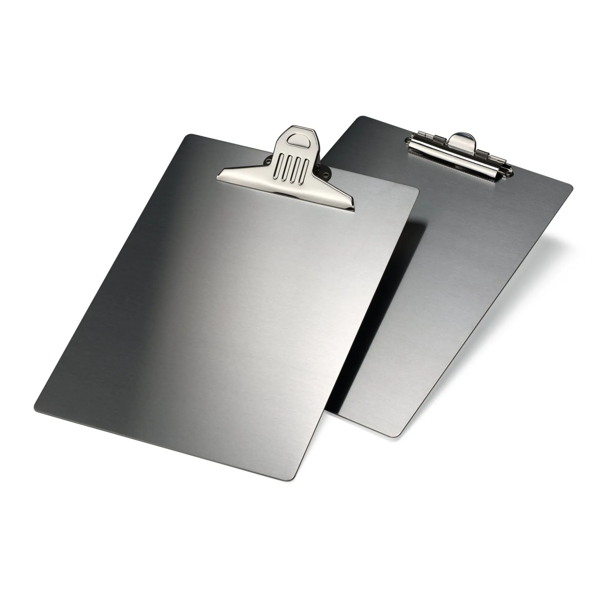 Ein Klemmbrett aus Edelstahl (Materialstärke 1 mm). Wir lassen es einmal mit einer extra starken großen Klemme und zum anderen mit einer kleineren Klemme aus Stahlblech versehen: In der großen Klemme lassen sich Papierstapel bis 1,5 cm Dicke (ungefähr 180 Blatt) festhalten, die kleine fasst etwa 110 Blatt und nimmt auch einen Bleistift auf. Beide sind mit einer Öse versehen, an der man das Klemmbrett an die Wand hängen kann.