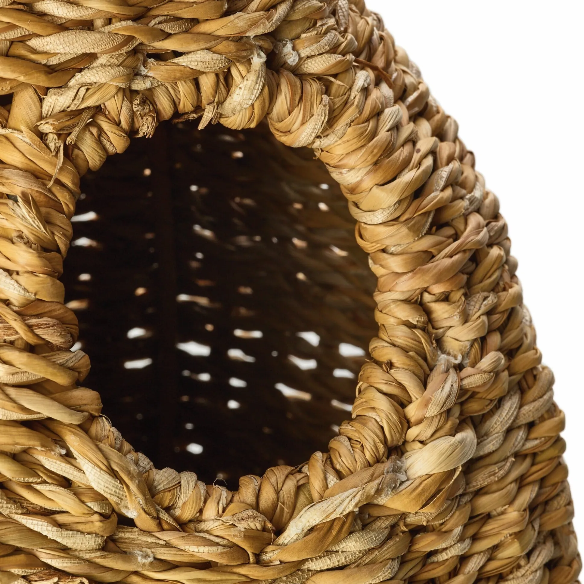 In Bangladesch aus dortigem Schilfgras geflochten. Metallrahmen innen liegend. Mit Sisalkordel. Höhe 30 cm, Ø 20 cm. Gewicht 700 g. Da die Eichhörnchenkobel handgearbeitet sind, kann es zu leichten Abweichungen in den Maßen kommen.