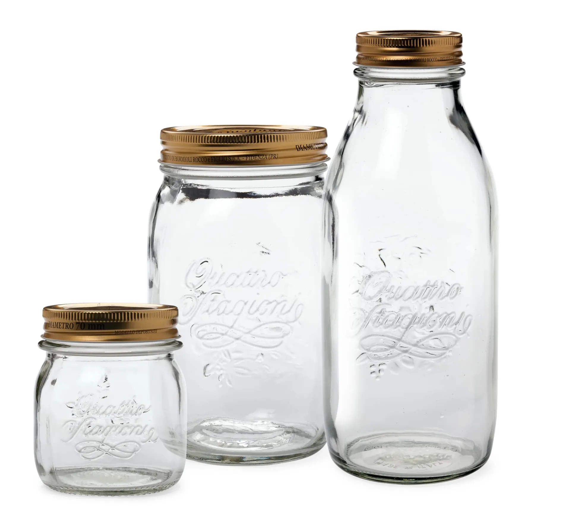 Aus Pressglas mit Vakuum-Schraubdeckel aus Weißblech. Hergestellt in Italien.