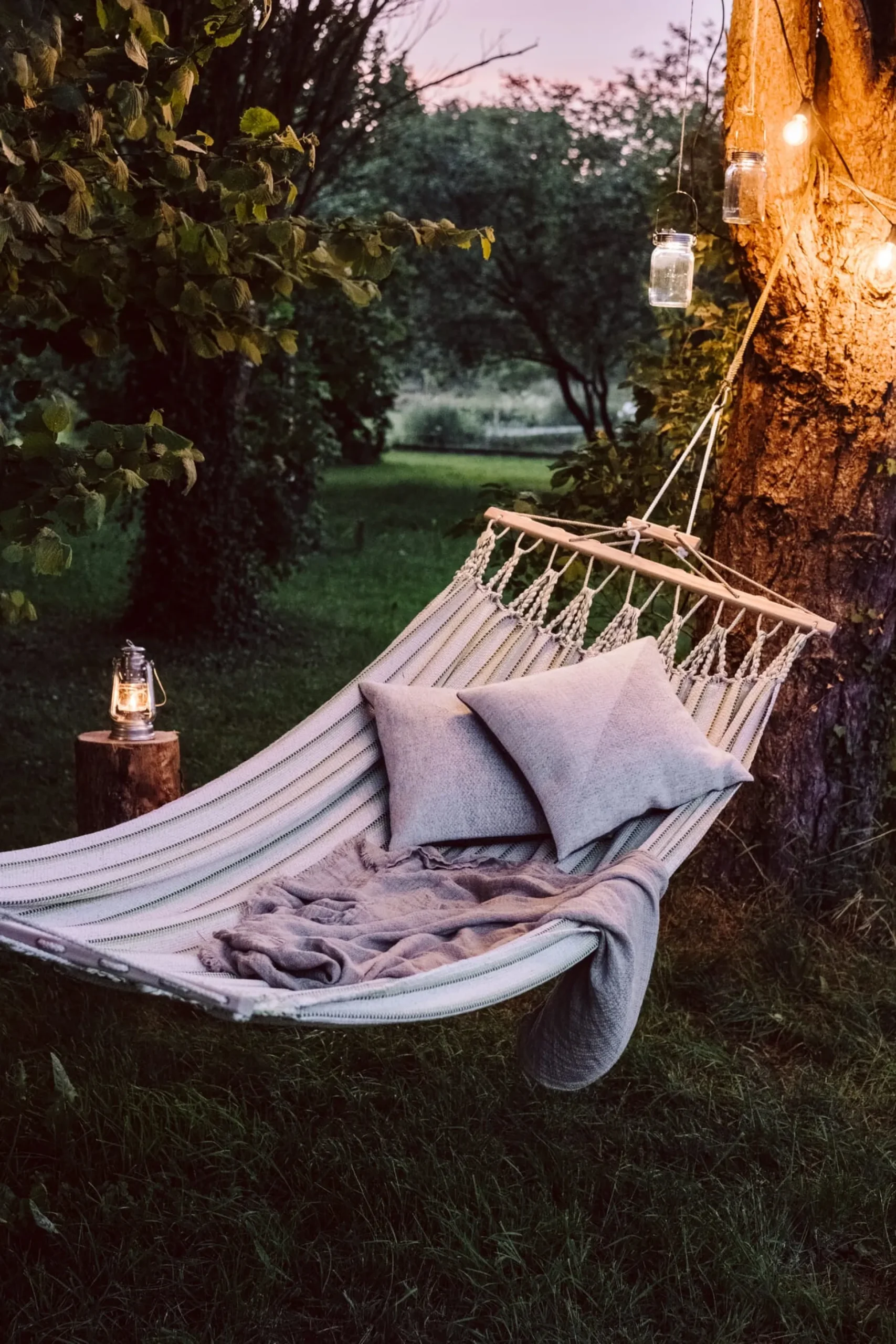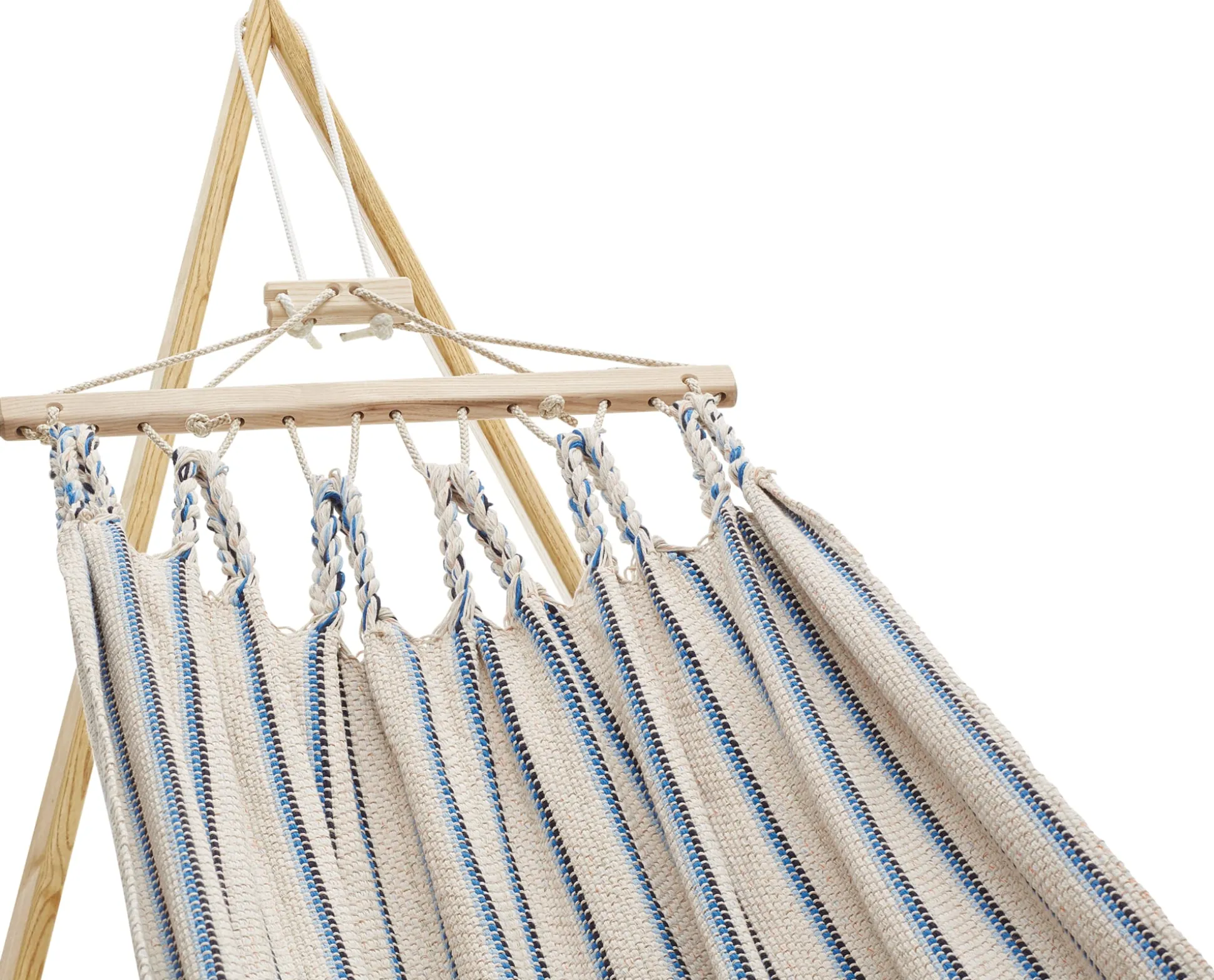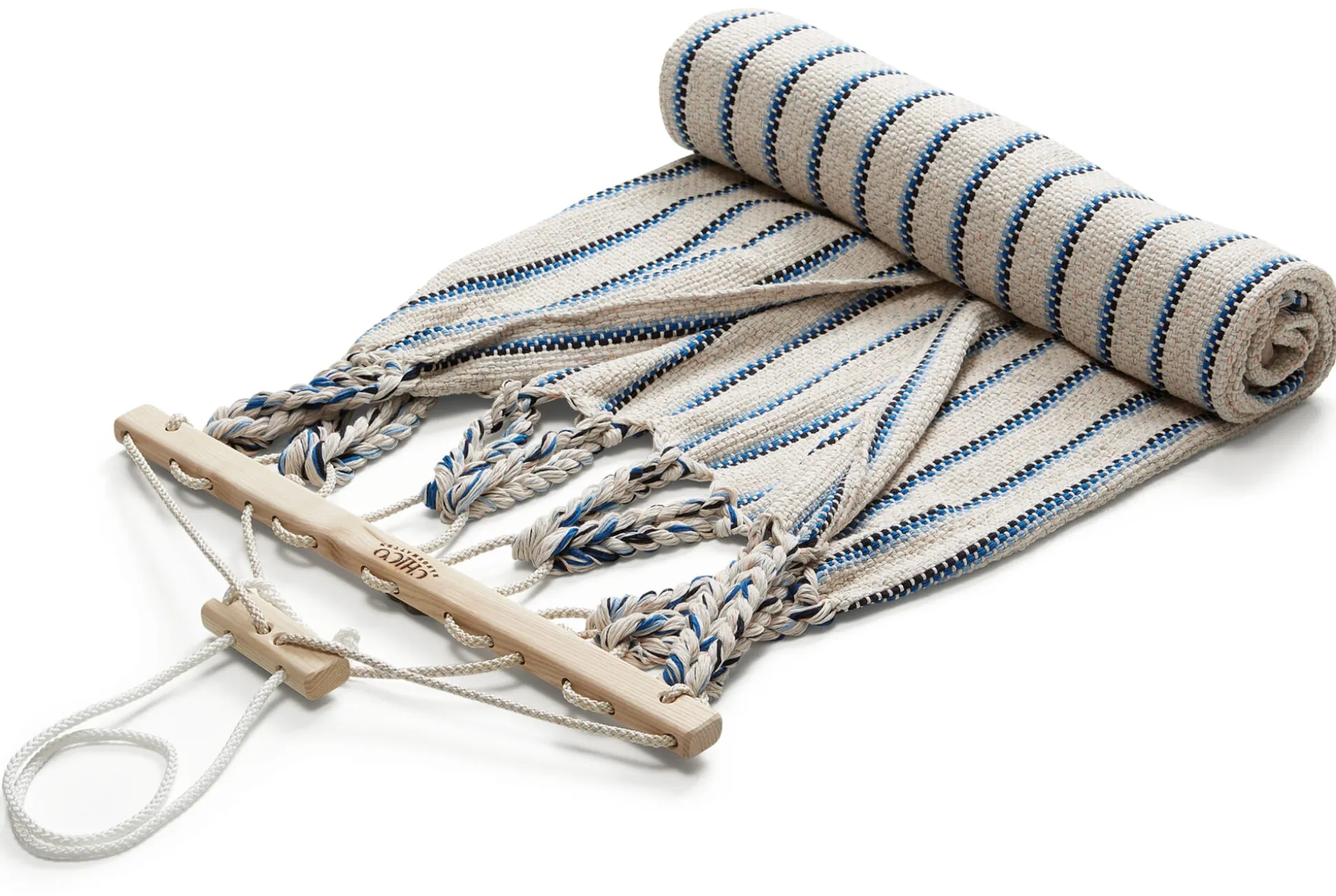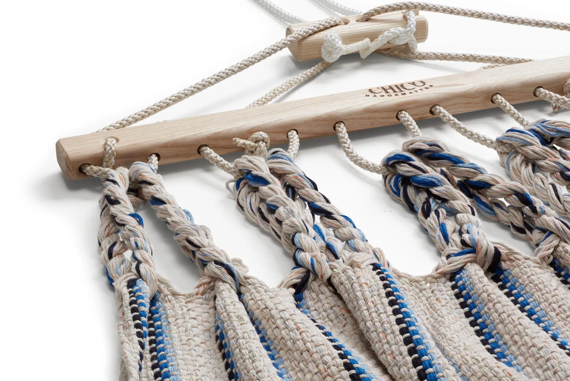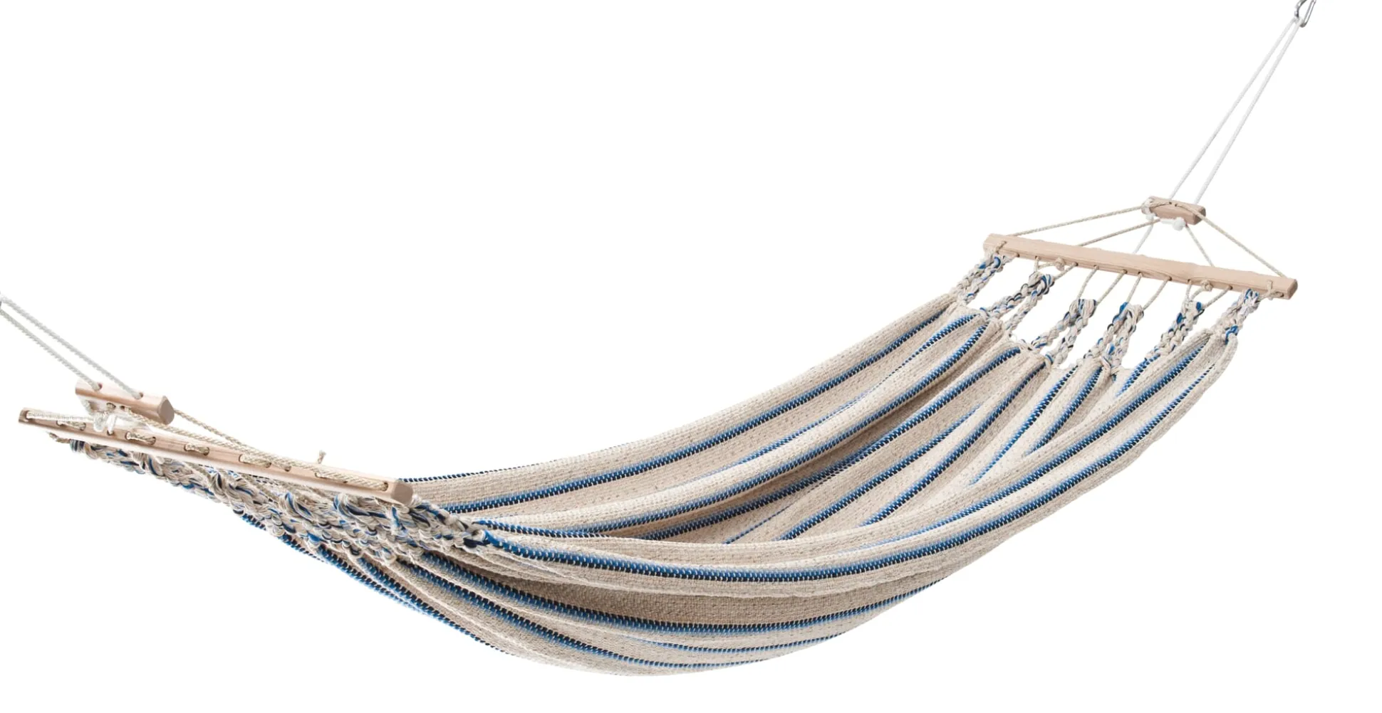 Die Hängematten werden in einer eigens entwickelten Endloswebtechnik gearbeitet, sie sind nicht nur von einer Materialopulenz, die man schon beim ersten Griff spürt – sie sind vor allem auch außerordentlich reißfest. Ein verstellbarer hölzerner Fixierstab verhindert das Zusammenrutschen der Matte, eine Spannvorrichtung ermöglicht Längenänderungen. Einzig beim Tragseil verwendet der Hersteller ein synthetisches Material, eine UV- und witterungsbeständige Polyestermischung, die die langfristige Belastbarkeit der Hängematte gewährleistet.