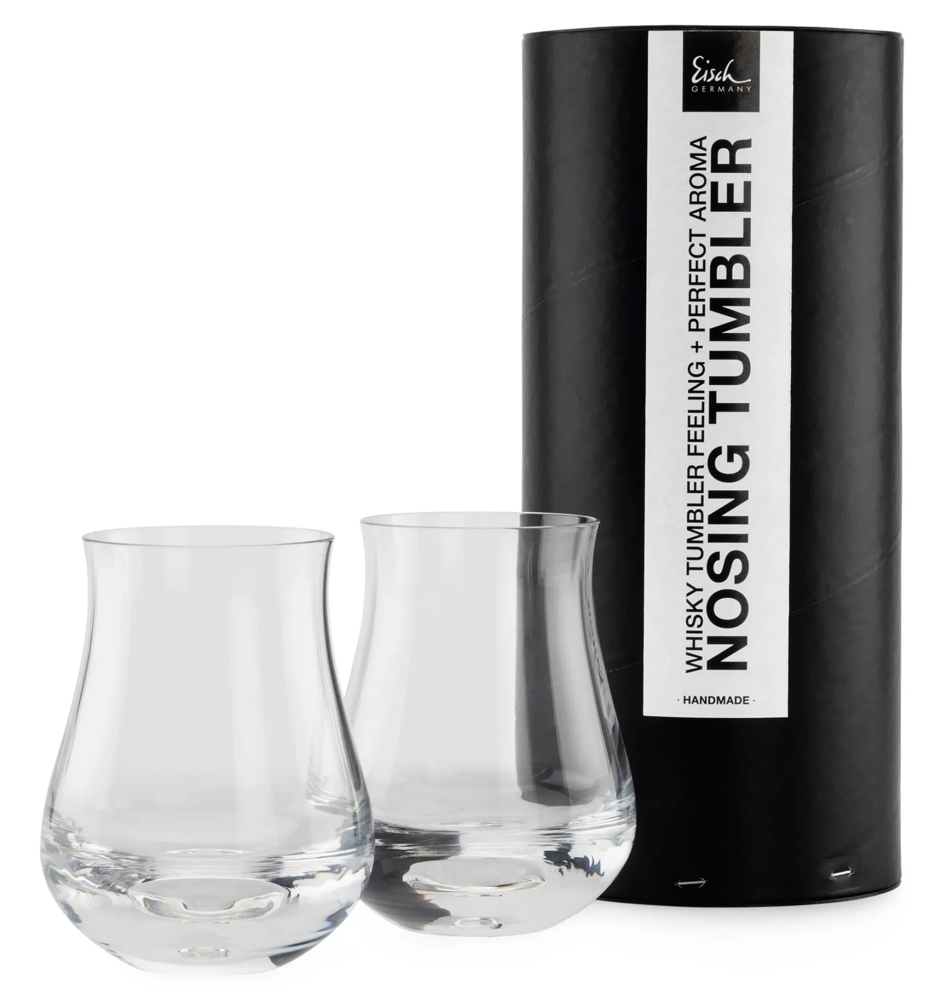 Zum Whiskygenuss gehört das Wahrnehmen von Aromen und Geschmack des Getränks mit allen Sinnen. Gut, wenn da bei der Verkostung Gläser wie diese zur Hand sind, die in der Glashütte Eisch im Bayerischen Wald mundgeblasen werden. Die sich nach oben verjüngende Form der schweren, bauchigen Gefäße begünstigt den sogenannten Nosing-Effekt. Hinzu kommt, dass der Whisky im Glas länger seine Trinktemperatur behält, denn dank seines dickwandigen Bodens überträgt sich die Handwärme nicht auf den Inhalt.