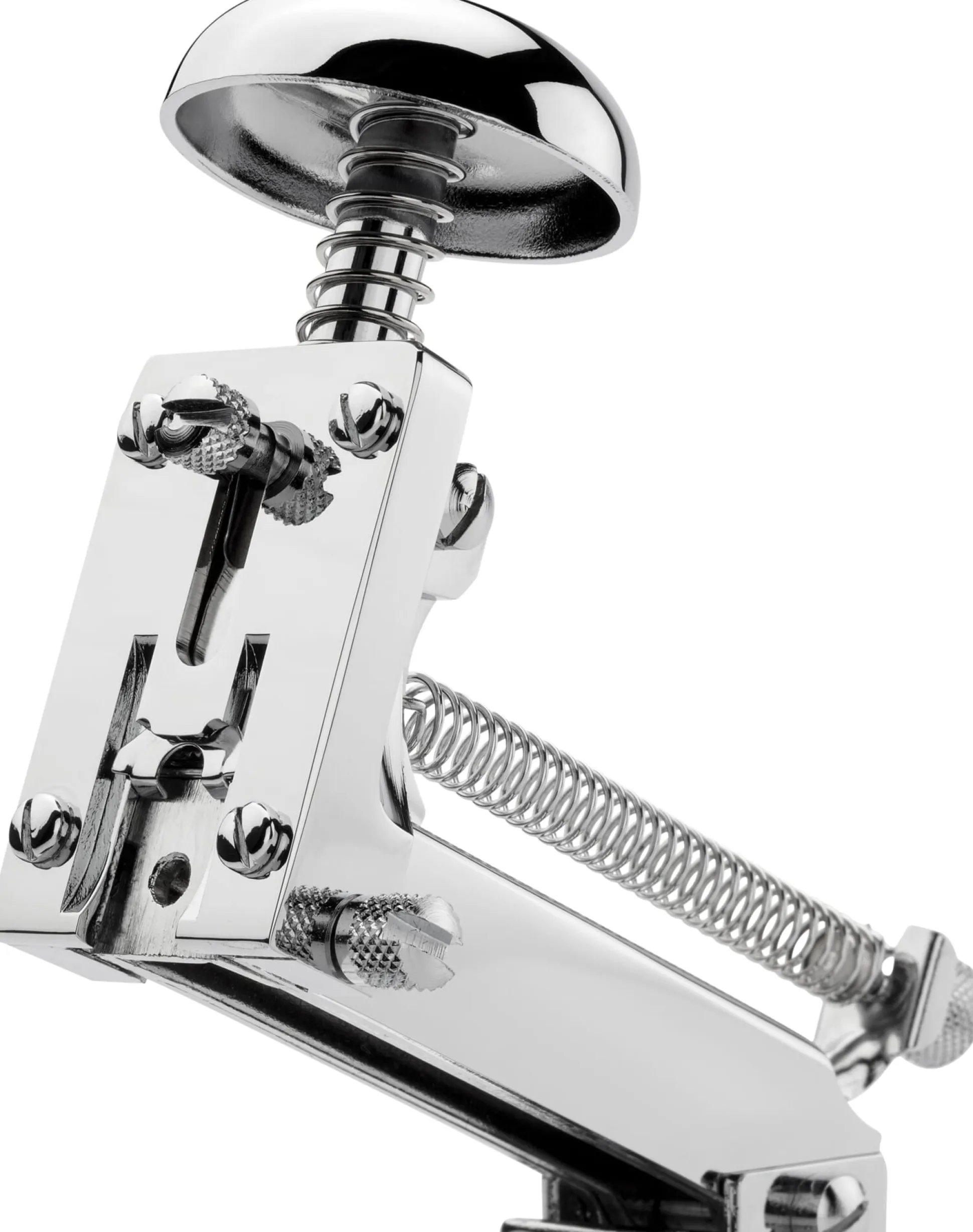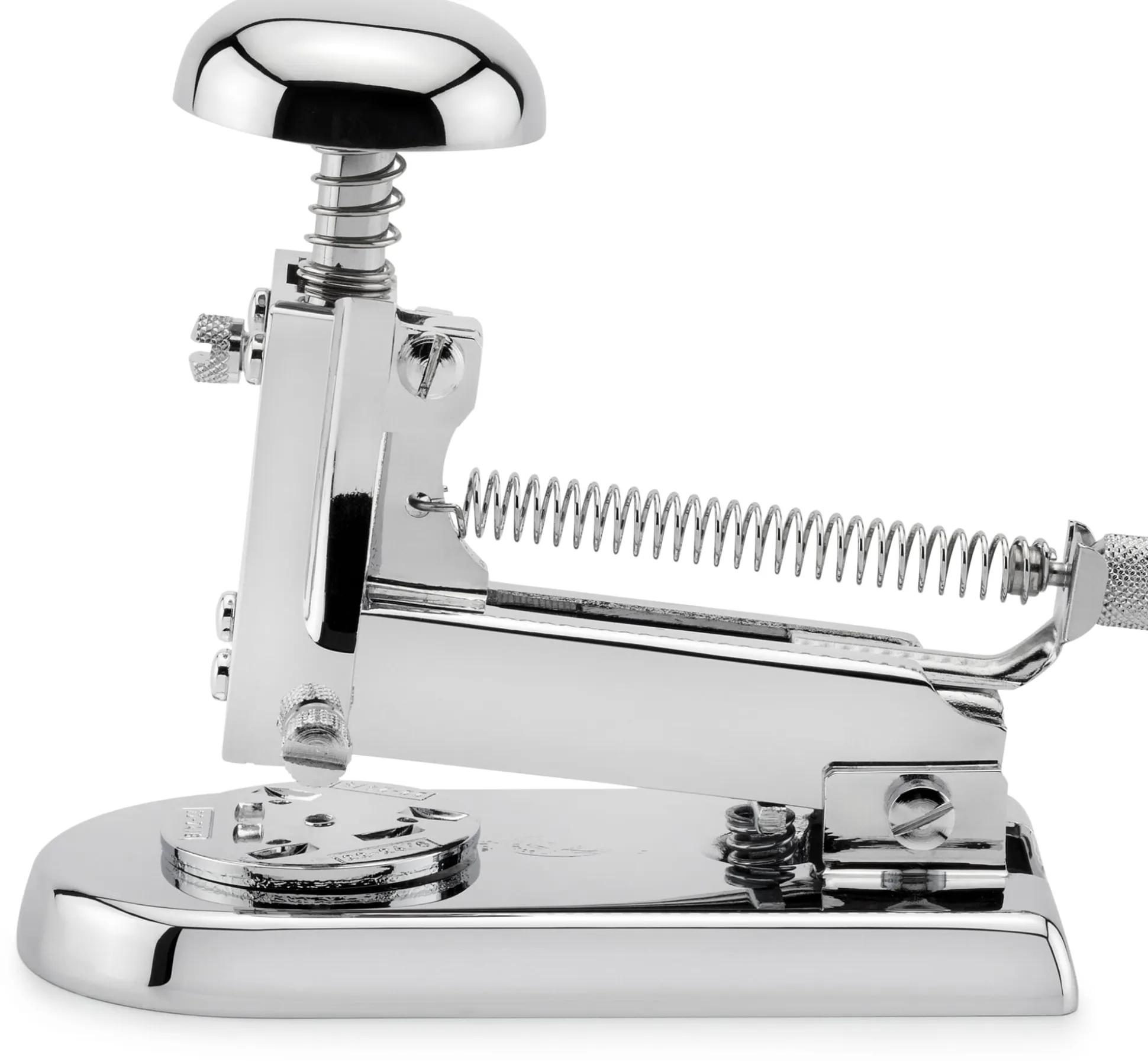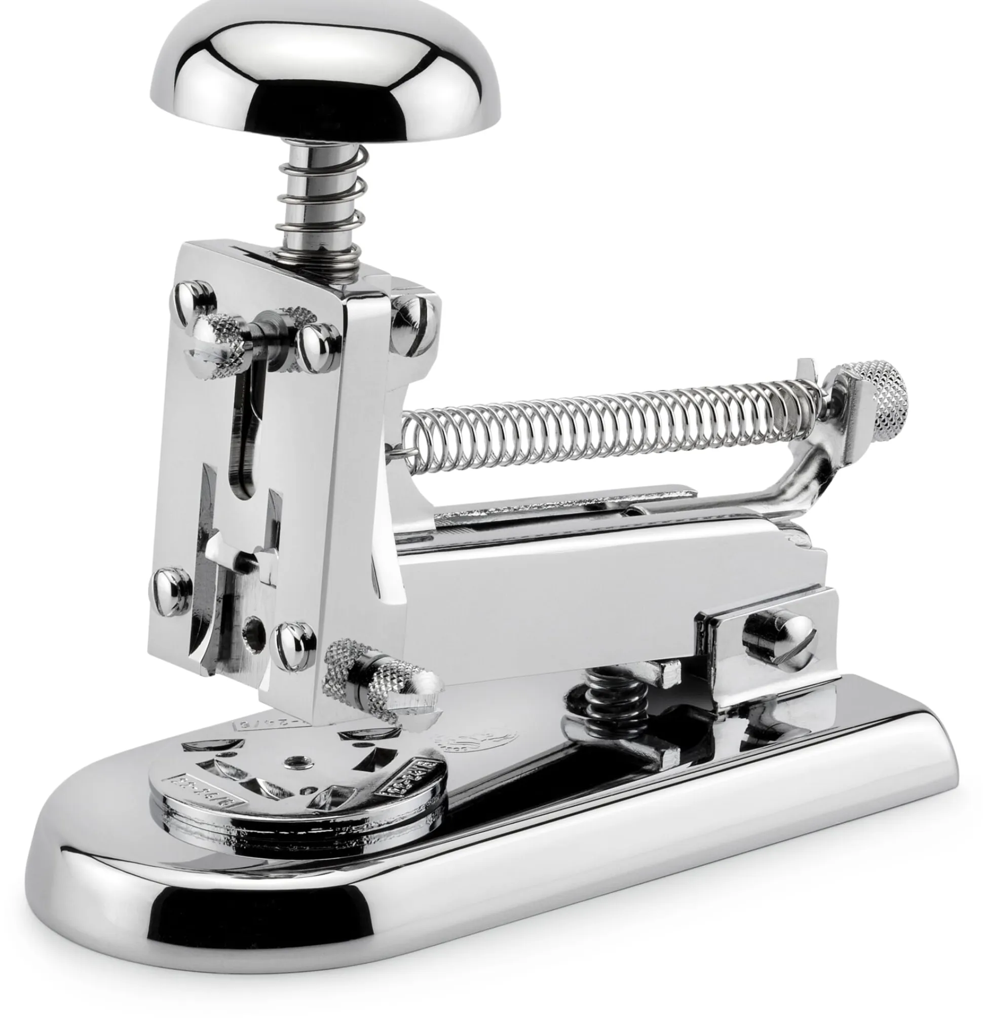 Der elegante, chromglänzende Bruder des M10 ist eine wahre Augenweide. Der Tischhefter wird aus verchromtem Stahl gefertigt und von Hand in mehreren Arbeitsschritten hochglanzpoliert. Mit seinen offenliegenden Zug- und Torsionsfedern (Erstere führt die im Magazin befindlichen Klammern nach) erinnert er mehr an ein feinmechanisches Demonstrationsobjekt für den Physikunterricht als an einen Tischhefter für Papiere.